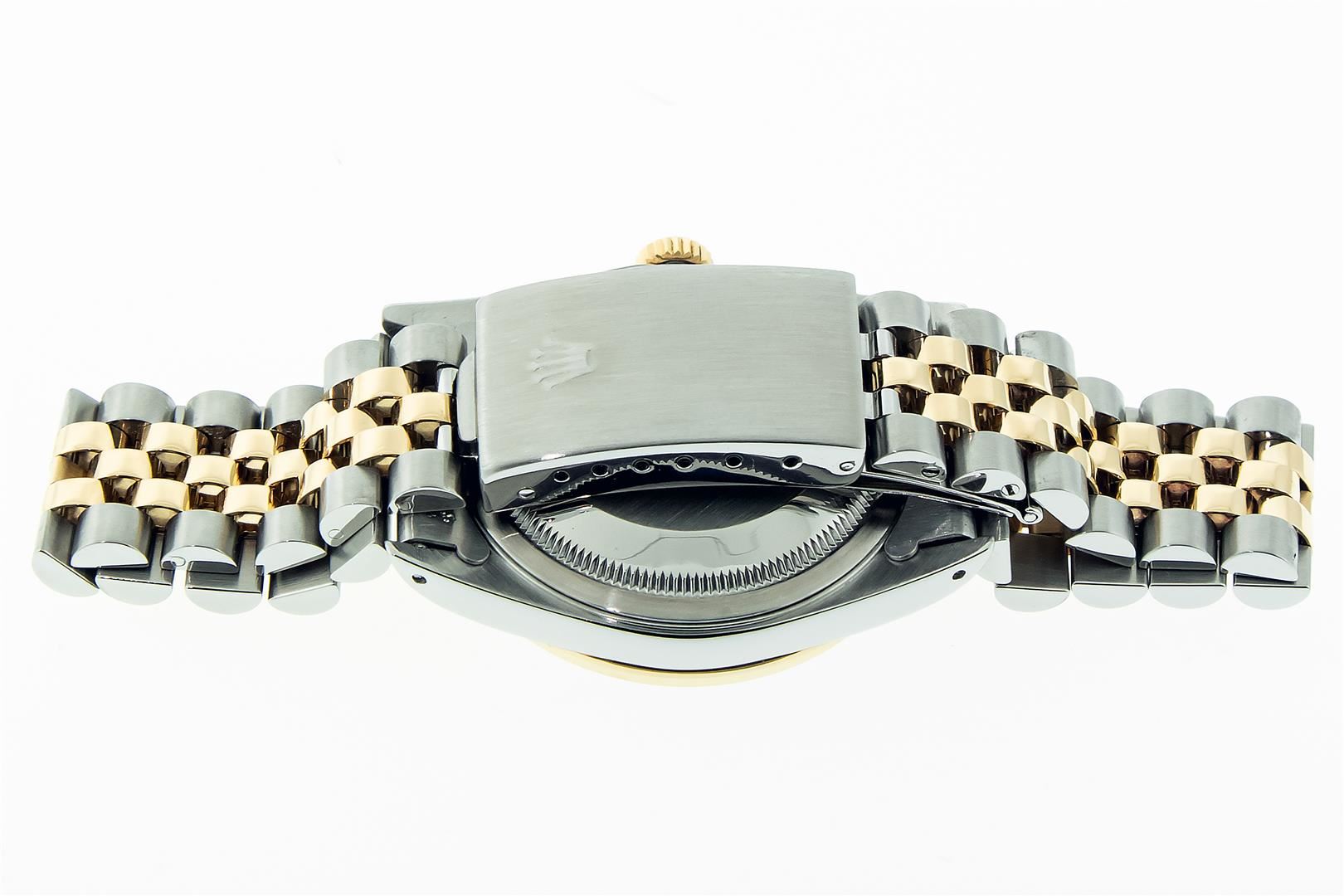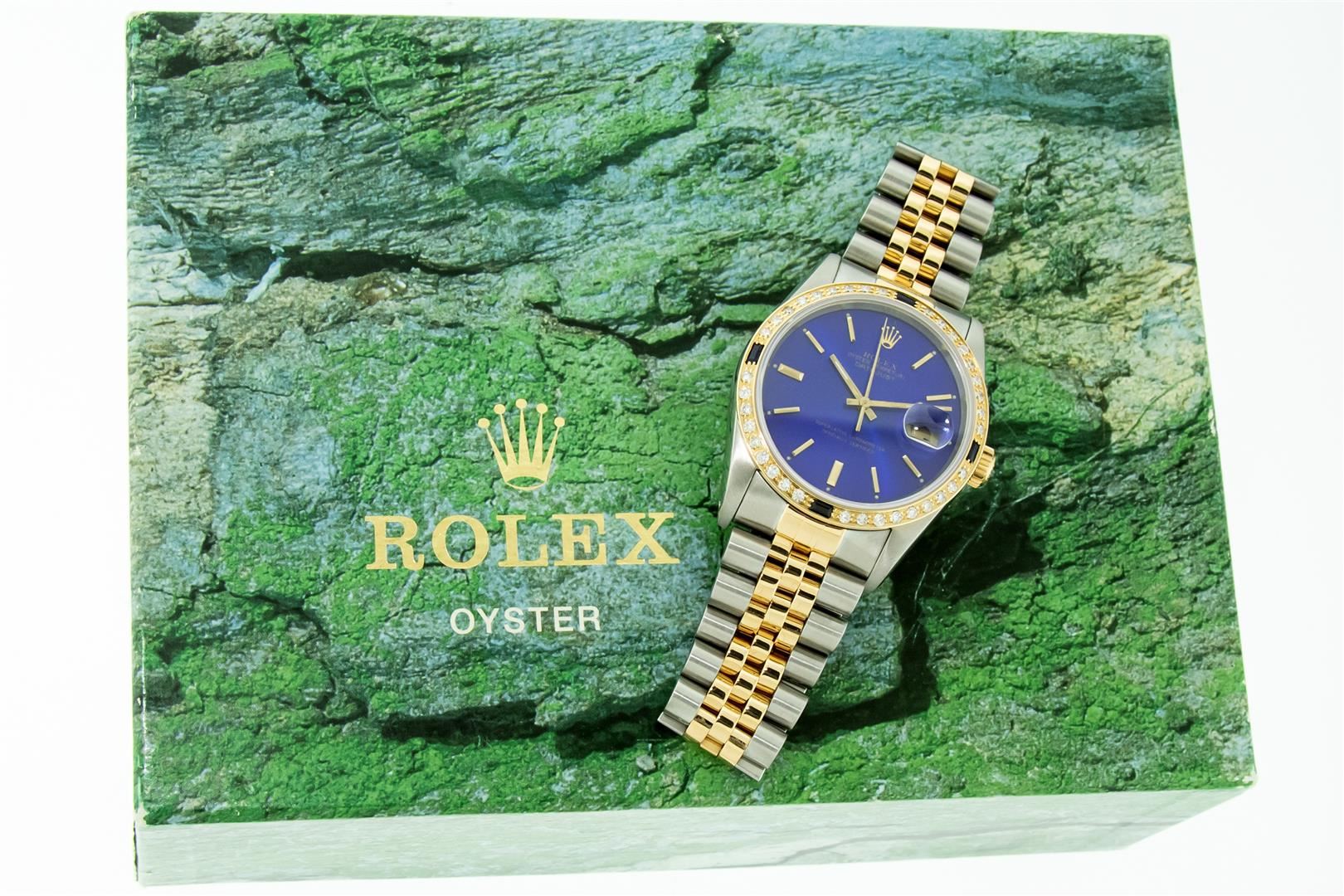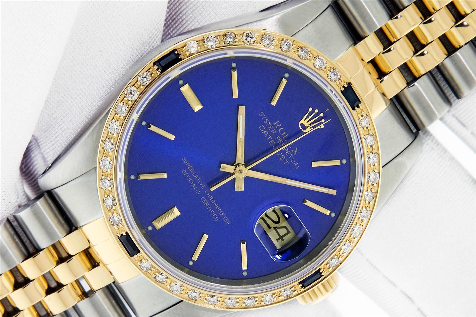 One Men's 18K Yellow Gold & Stainless Steel Two Tone Rolex Oyster Perpetual Datejust Polished, Serviced & Electronically Tested, Rolex 18K Yellow Gold & Stainless Steel Case: 36mm, Rolex 18K Yellow Gold Crown, Custom Bezel: New 18K Yellow Gold Sapphire Beadset Diamond Bezel, Diamond Count: 36 Diamonds + 4 Sapphires Custom Crystal: New Sapphire With Magnified Date Window. Custom Hands: Rolex Luminescent Hands. Rolex Movement: Automatic Winding Movement 3135. Custom Dial: Refinished To Blue With Index Hour Markers. Date Window: 3 O'clock Position Date Display, Quickset, Model: Datejust, Condition: G-6 Extra Fine. Bracelet: Nice Condition Two Tone 18K Yellow Gold & Stainless Steel Jubilee Band. Bright Polish. 7.0 Inch Length, Adjustable. Standard Clasp, With Rolex Logo. This Pre Owned Watch Has Been Serviced, Time Tested And Polished It Is Free Of All Scratches And Dents. This Watch Comes With A Rolex Box.