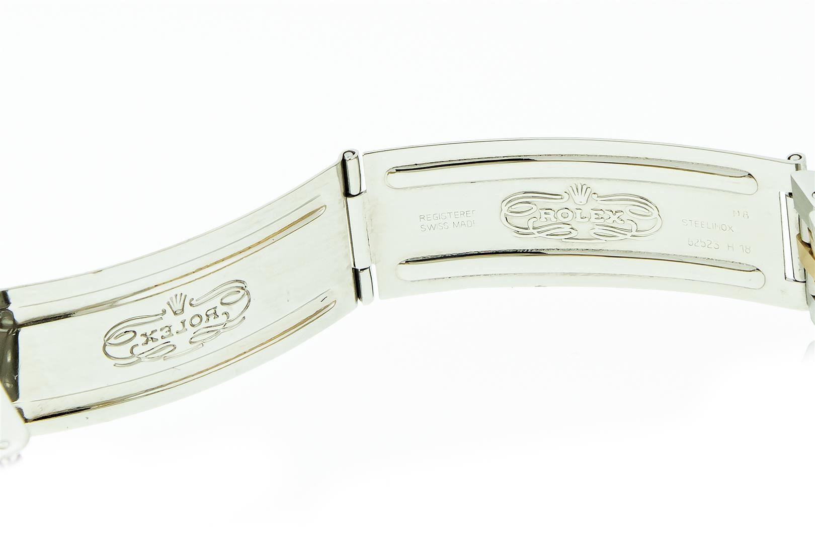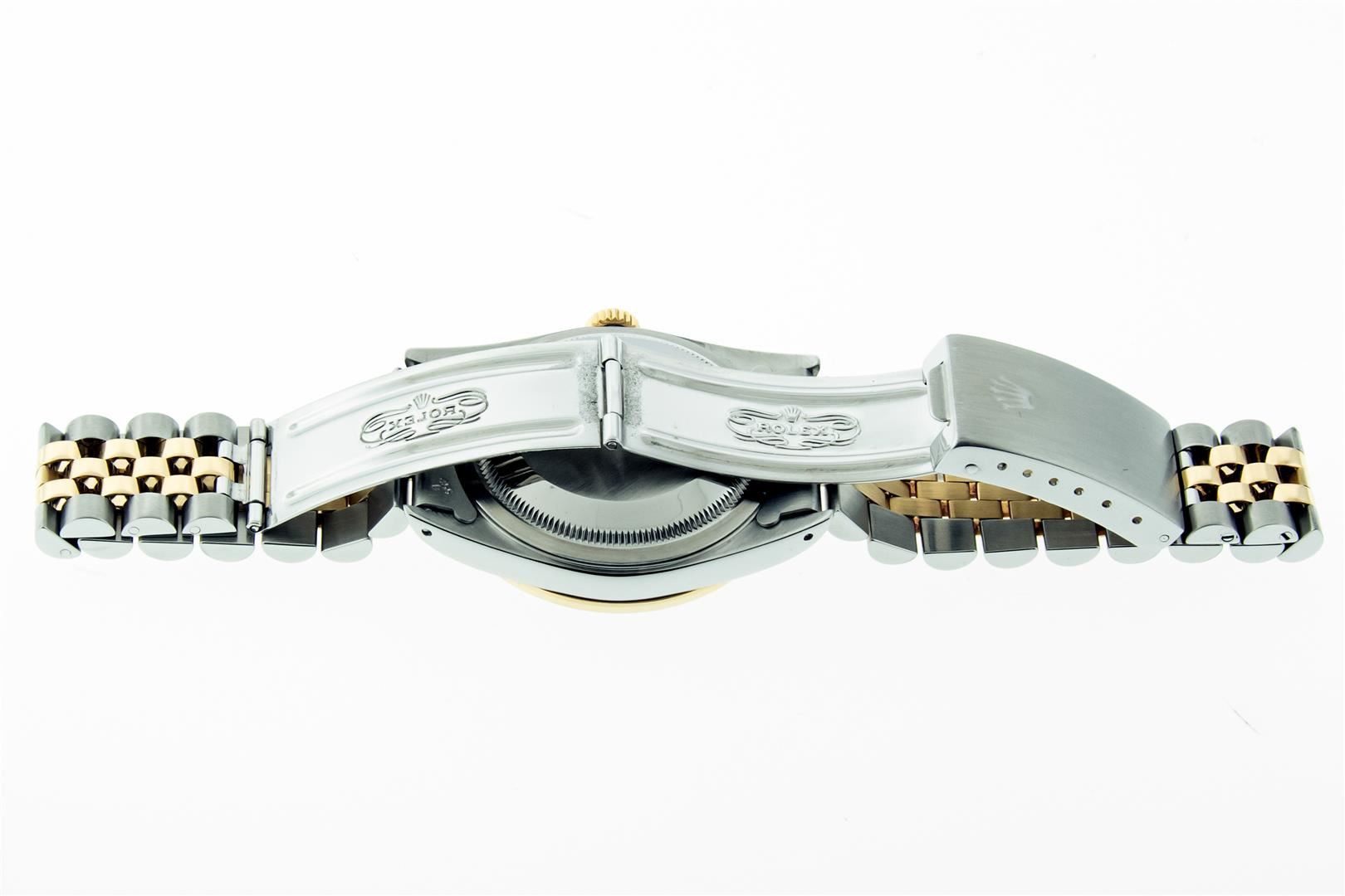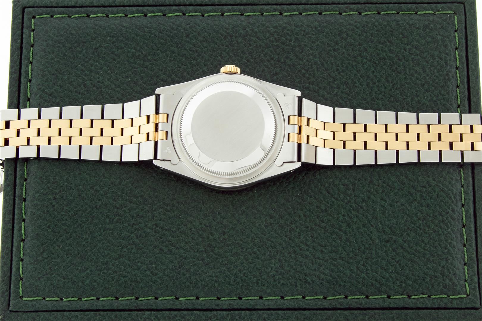 One Men's 18K Yellow Gold & Stainless Steel Two Tone Rolex Oyster Perpetual Datejust Polished, Serviced & Electronically Tested, Rolex 18K Yellow Gold & Stainless Steel Case: 36mm, Rolex 18K Yellow Gold Crown, Custom Bezel: New 18K Yellow Gold Sapphire Beadset Diamond Bezel, Diamond Count: 36 Diamonds + 4 Sapphires Custom Crystal: New Sapphire With Magnified Date Window. Custom Hands: Rolex Luminescent Hands. Rolex Movement: Automatic Winding Movement 3135. Custom Dial: Refinished To Blue With Index Hour Markers. Date Window: 3 O'clock Position Date Display, Quickset, Model: Datejust, Condition: G-6 Extra Fine. Bracelet: Nice Condition Two Tone 18K Yellow Gold & Stainless Steel Jubilee Band. Bright Polish. 7.0 Inch Length, Adjustable. Standard Clasp, With Rolex Logo. This Pre Owned Watch Has Been Serviced, Time Tested And Polished It Is Free Of All Scratches And Dents. This Watch Comes With A Rolex Box.