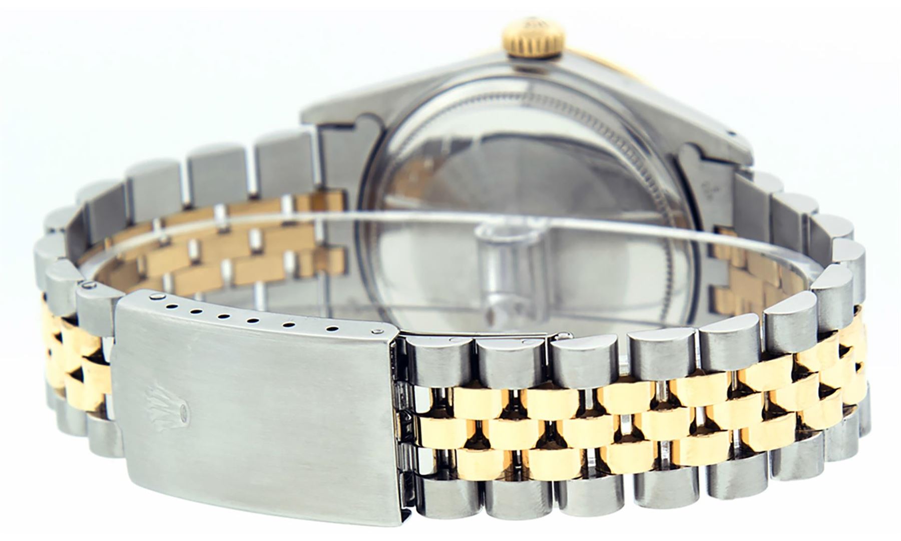 One Men's Yellow Gold Two Tone Rolex Datejust Polished, Fully Serviced & Electronically Tested, Yellow Gold & Stainless Steel Case: 36mm, Yellow Gold Crown, Custom Bezel: 18K Yellow Gold Ruby Beadset Diamond Bezel, Diamond Count: 36 Diamonds + 4 Rubies, Total Weight 1.0 Carat, Clarity: Si-VS, Color: G to H. Custom Crystal: New Synthetic Sapphire Cyclops Lens. Custom Hands: New Luminescent Hands. Movement: Automatic Winding Movement . Custom Dial: Silver Diamond Dial With Square Roman Track and Luminescent Dots , Diamond Count: 10 Diamonds In Dial, Color: G to H, Clarity: SI-VS. Date Window: 3 O'Clock Position Date Display, Quickset, Model: Datejust. Condition: G-6 Extra Fine. Bracelet: Two Tone Yellow Gold & Stainless Steel Jubilee. Bright Polish. 7.0 Inch Length, Adjustable. Standard Clasp, With Rolex Logo. This Watch Has Been Serviced Time Tested And Is In Excellent Condition It Is Free Of All Scratches And Dents.