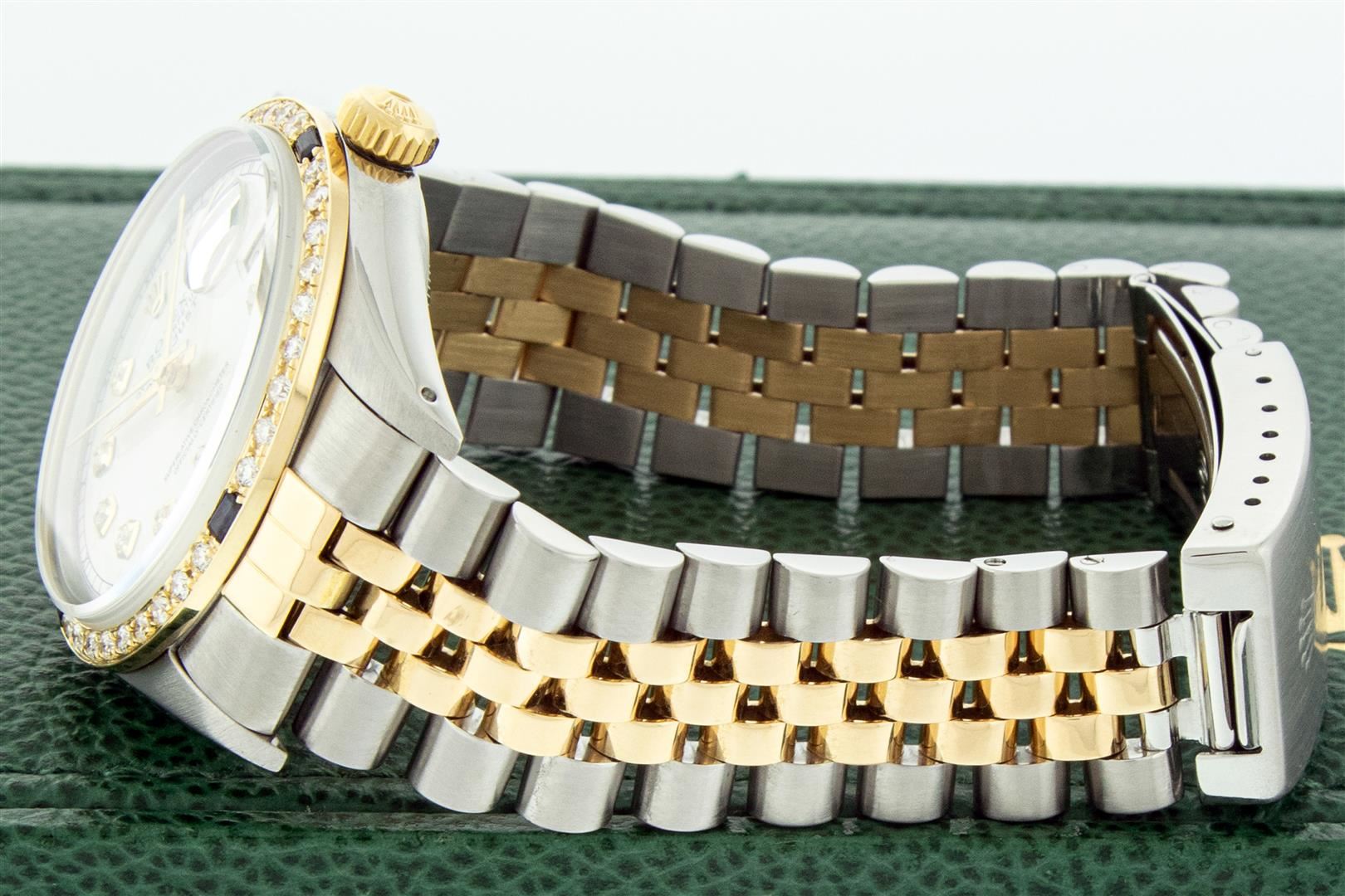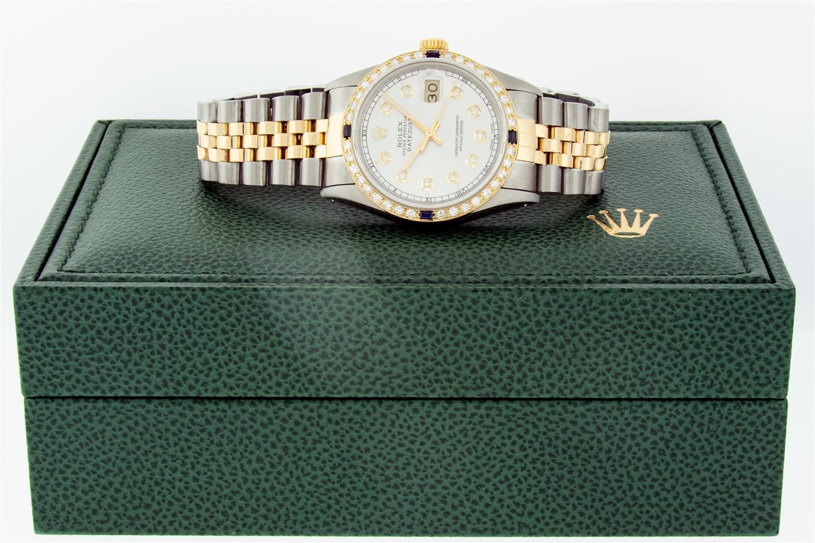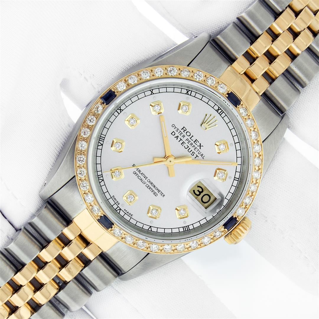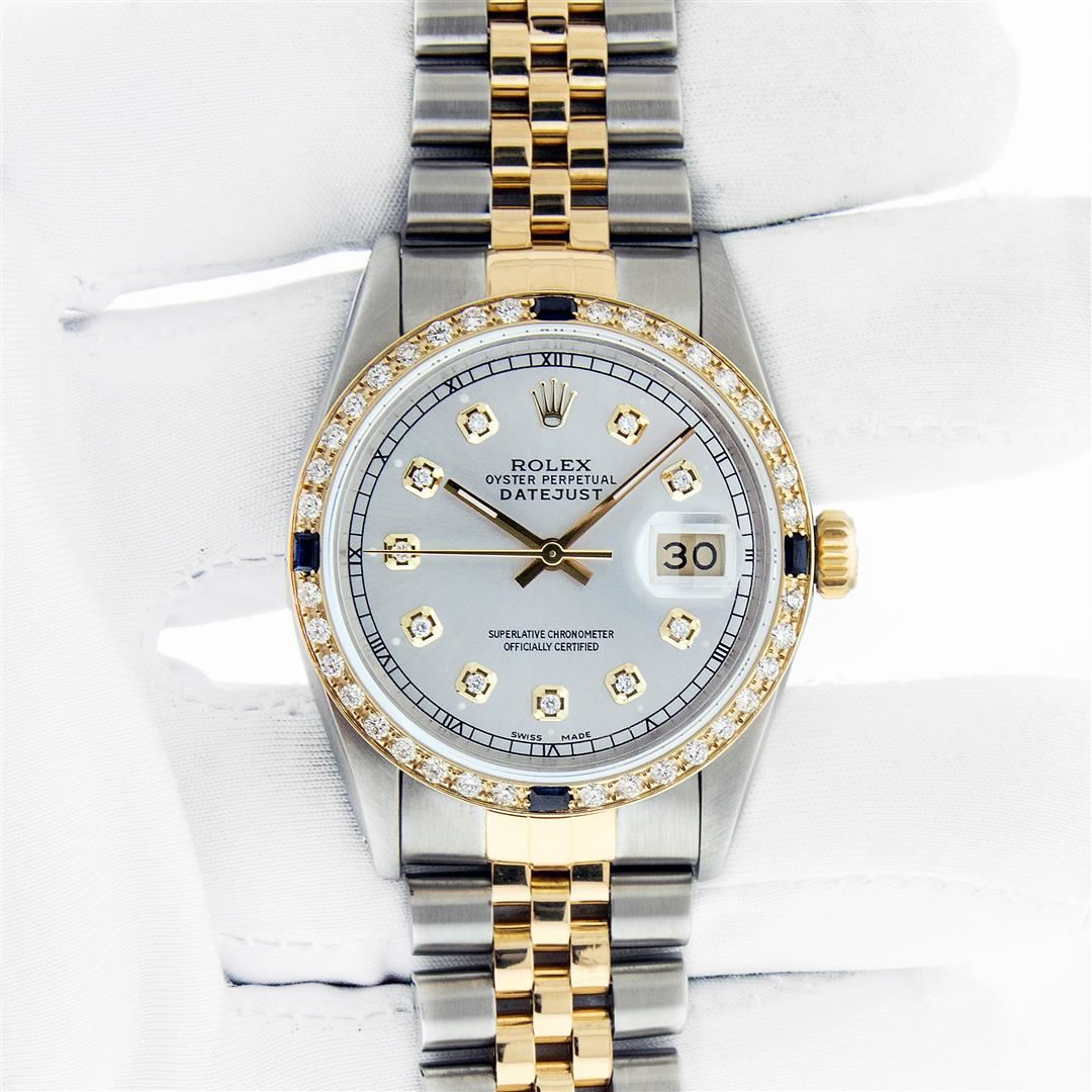 One Men's Yellow Gold Two Tone Rolex Datejust Polished, Serviced & Electronically Tested, Yellow Gold & Stainless Steel Case: 36mm, Rolex Yellow Gold Crown, Custom Bezel: New 18K Yellow Gold Sapphire Beadset Diamond Bezel, Diamond Count: 36 Diamonds + 4 Sapphires, Total Weight 1.00 Carat, Clarity: SI-VS, Color: G to H. Custom Crystal: New Sapphire With Magnified Date Window. Custom Hands: New Luminescent Hands. Rolex Movement: Automatic Winding Movement. Custom Dial: Refinished To Silver Diamond With Added Diamonds. Diamond Count: 10 Diamonds In Dial, Clarity: SI-VS, Color: Color G to H Date Window: 3 O'clock Position Date Display, Quickset, Model: Datejust. Condition: G-6 Extra Fine. Rolex Bracelet: Two Tone Yellow Gold & Stainless Steel Jubilee Band. Bright Polish. 7.0 Inch Length, Adjustable. Standard Clasp, With Rolex Logo. This Pre Owned Watch Has Been Serviced Time Tested And Is In Excellent Condition It Is Free Of All Scratches And Dents. This Watch Comes With A Rolex Box.