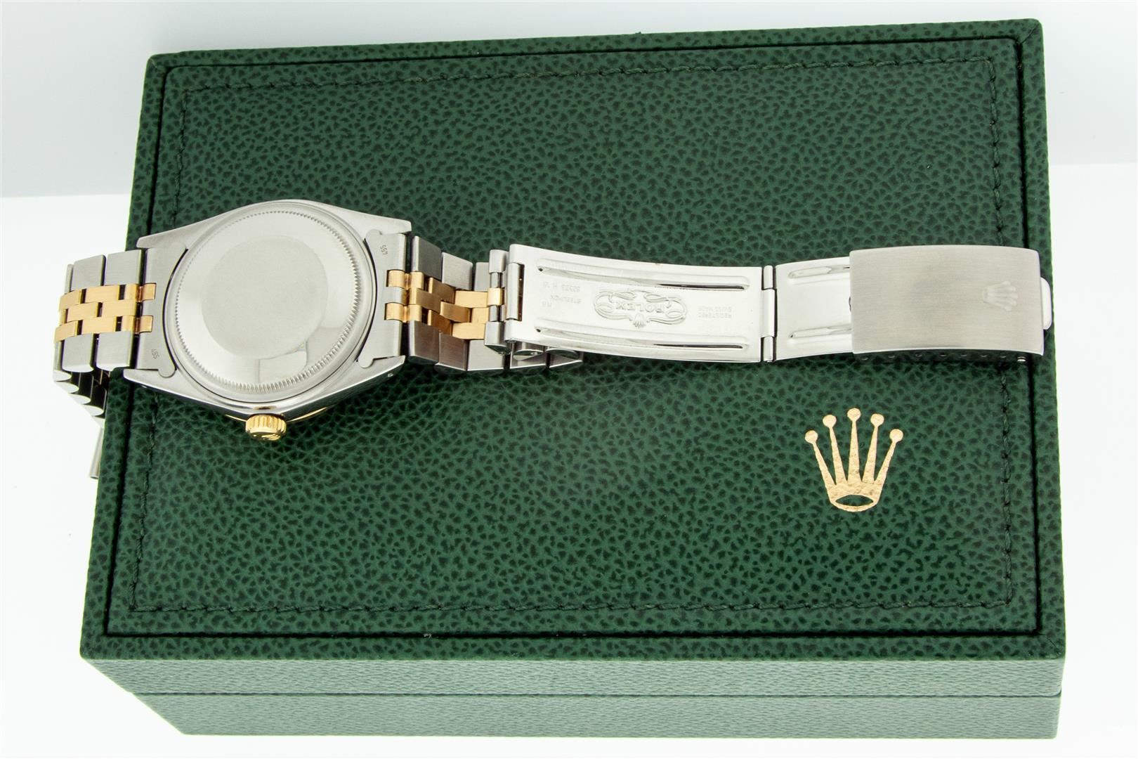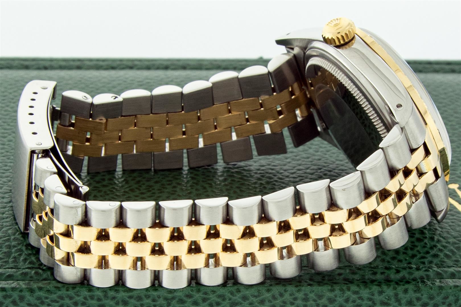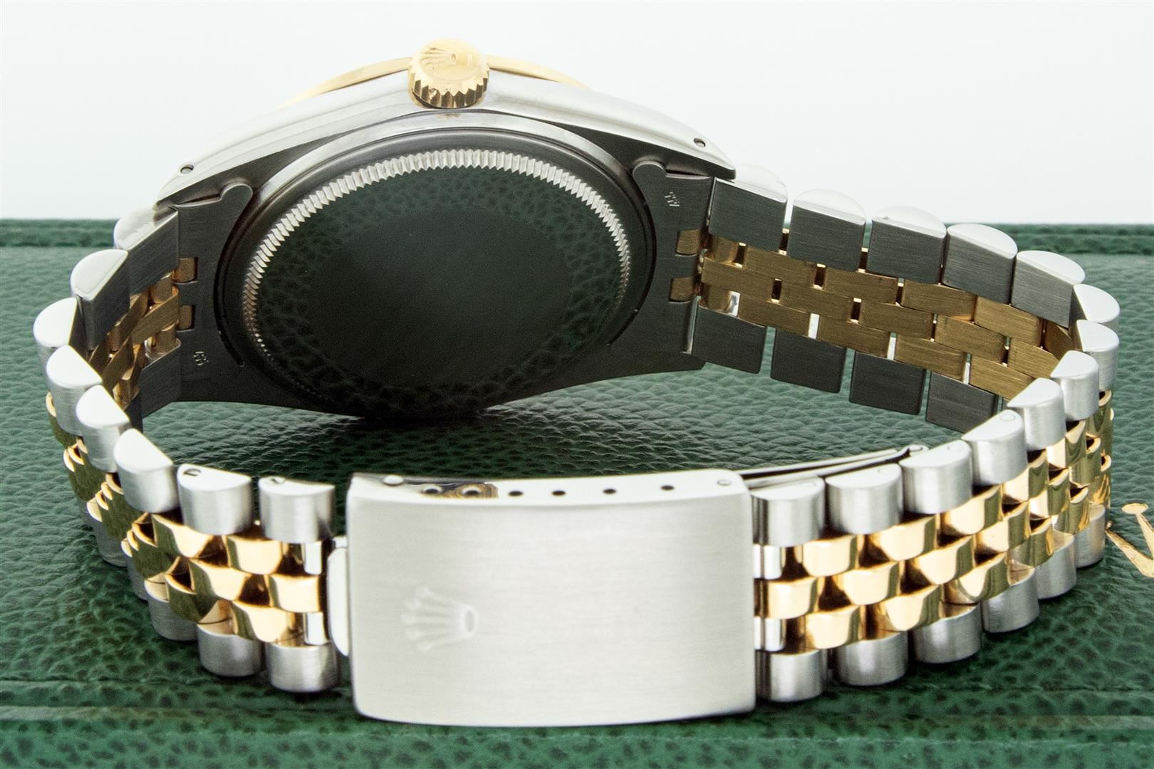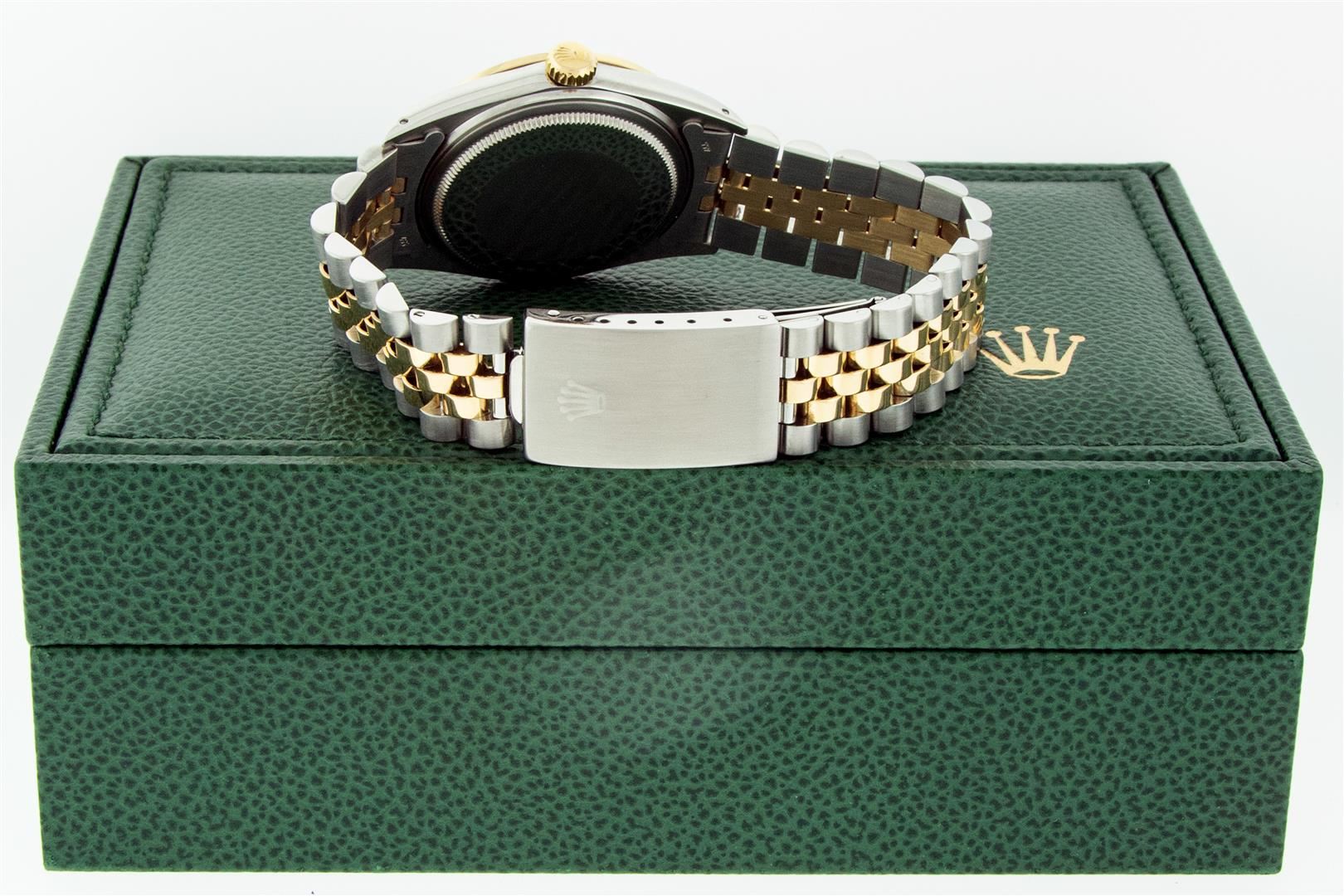 One Men's Yellow Gold Two Tone Rolex Datejust Polished, Serviced & Electronically Tested, Yellow Gold & Stainless Steel Case: 36mm, Rolex Yellow Gold Crown, Custom Bezel: New 18K Yellow Gold Sapphire Beadset Diamond Bezel, Diamond Count: 36 Diamonds + 4 Sapphires, Total Weight 1.00 Carat, Clarity: SI-VS, Color: G to H. Custom Crystal: New Sapphire With Magnified Date Window. Custom Hands: New Luminescent Hands. Rolex Movement: Automatic Winding Movement. Custom Dial: Refinished To Silver Diamond With Added Diamonds. Diamond Count: 10 Diamonds In Dial, Clarity: SI-VS, Color: Color G to H Date Window: 3 O'clock Position Date Display, Quickset, Model: Datejust. Condition: G-6 Extra Fine. Rolex Bracelet: Two Tone Yellow Gold & Stainless Steel Jubilee Band. Bright Polish. 7.0 Inch Length, Adjustable. Standard Clasp, With Rolex Logo. This Pre Owned Watch Has Been Serviced Time Tested And Is In Excellent Condition It Is Free Of All Scratches And Dents. This Watch Comes With A Rolex Box.