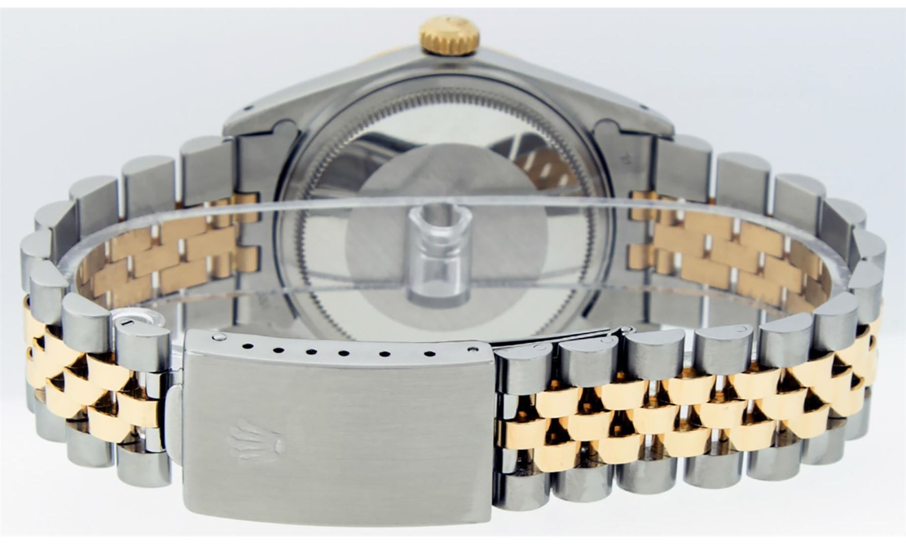 One Men's Rolex Pre Owned Two Tone Yellow Gold And Stainless Steel Rolex Datejust Polished, Serviced & Electronically Tested, Rolex Yellow Gold & Stainless Steel Case: 36mm, Rolex 14K Yellow Gold Crown, Rolex Bezel: 14K Yellow Gold Fluted Bezel. Custom Crystal: New Acrylic With Magnified Date Window. Custom Hands: New Luminescent Hands. Rolex Movement: Automatic Winding Movement 3035. Rolex Dial: Silver Index With Index Hour Markers and Small Track With Lumi Dots. Date Window: 3 O'Clock Position Date Display, Quickset, Model: Datejust. Condition: G-6 Extra Fine. Rolex Bracelet: Two Tone 14K Yellow Gold & Stainless Steel Jubilee Band. Bright Polish. 7.0 Inch Length, Adjustable. Standard Clasp, With Rolex Logo. This Watch Has Been Serviced Time Tested And Is In Excellent Condition It Is Free Of All Scratches And Dents.