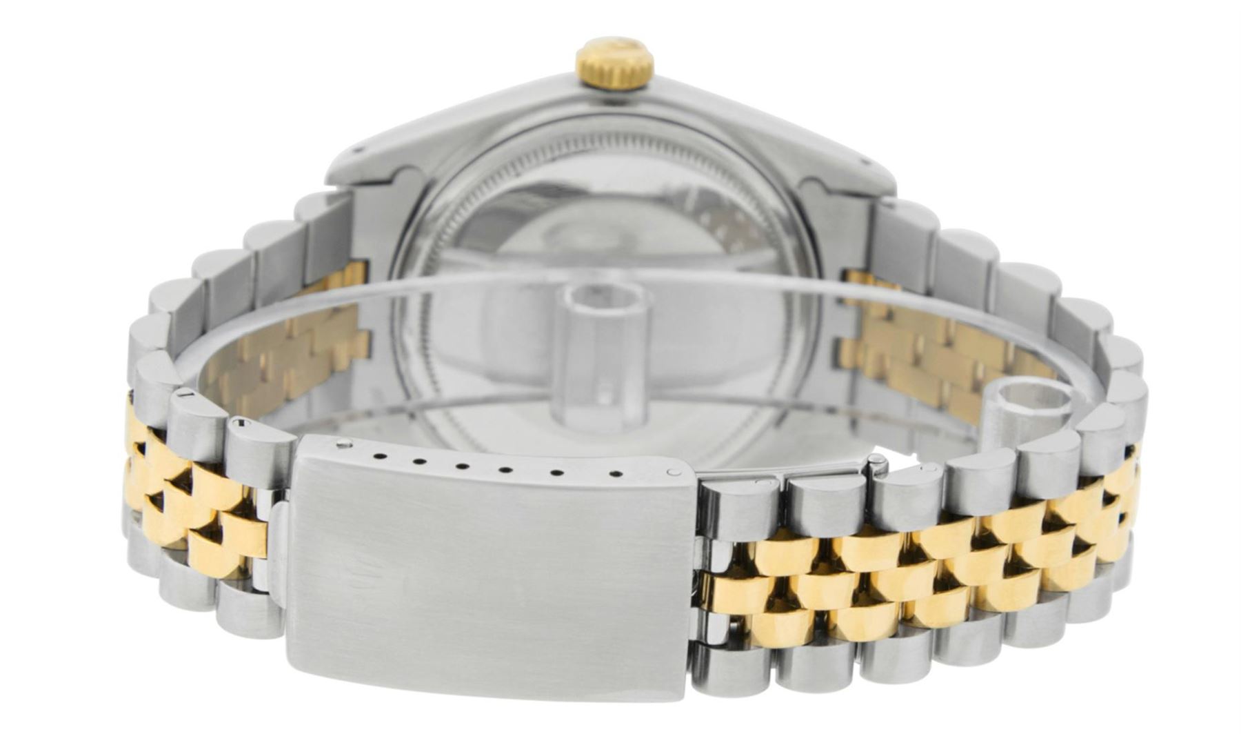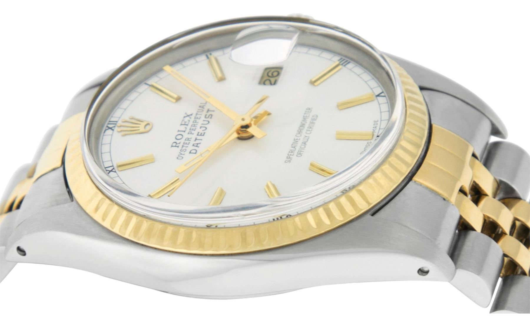 One Men's Rolex Two Tone Yellow Gold And Stainless Steel Datejust Polished, Serviced & Electronically Tested, 14K Yellow Gold & Stainless Steel Case: 36mm, 14K Yellow Gold Crown, Rolex Bezel: 14K Yellow Gold Fluted Bezel. Custom Crystal: New Acrylic With Magnified Date Window. Custom Hands: New Luminescent Hands. Rolex Movement: Automatic Winding Movement 3035. Custom Dial: Refinished To Silver With Index Hour Markers And Square Track. Date Window: 3 O'Clock Position Date Display, Quickset, Model: Datejust. Condition: G-6 Extra Fine. Rolex Bracelet: 14K Two Tone Yellow Gold & Stainless Steel Jubilee Band. Bright Polish. 7.0 Inch Length, Adjustable. Standard Clasp, With Rolex Logo. This Watch Has Been Serviced Time Tested And Is In Excellent Condition It Is Free Of All Scratches And Dents.