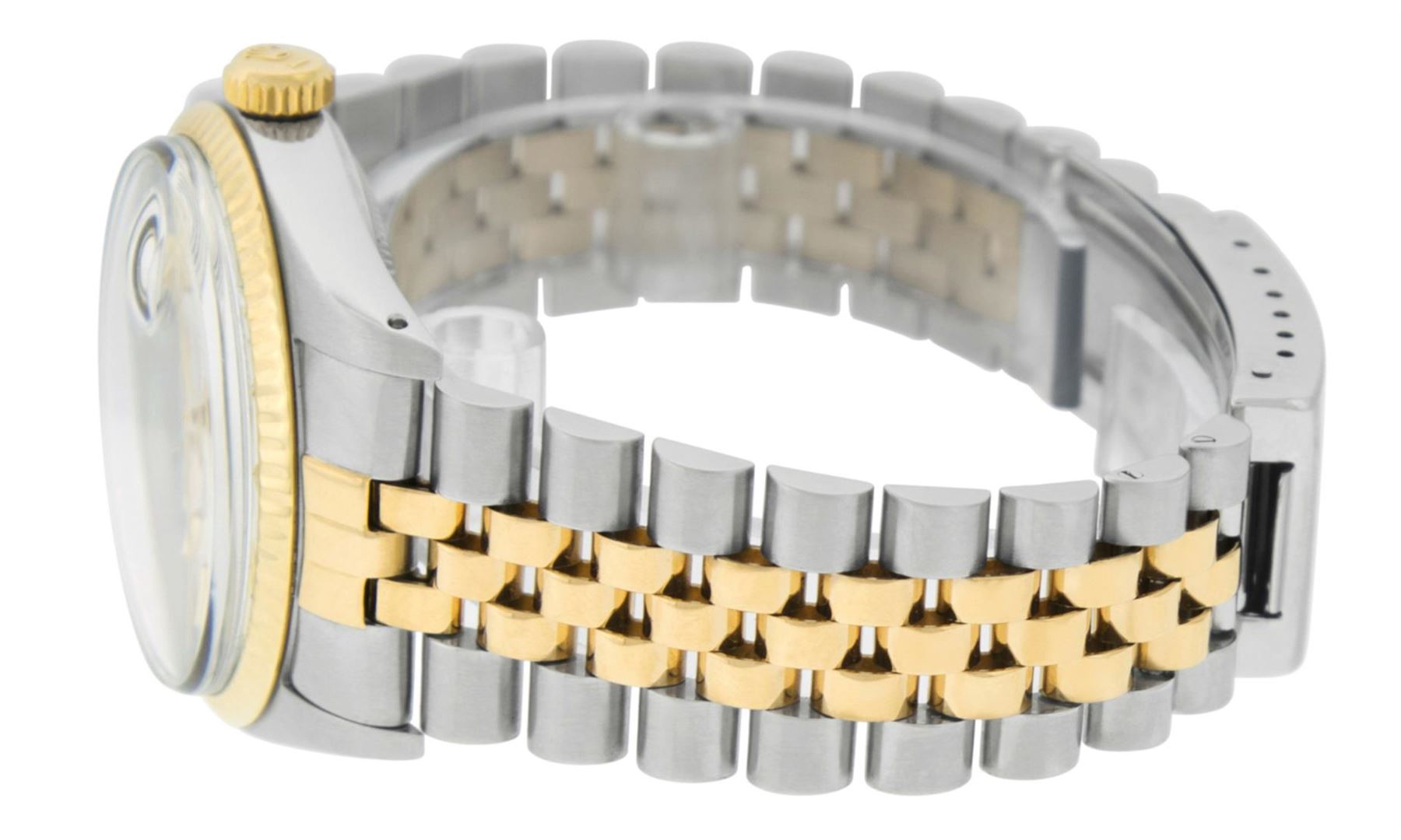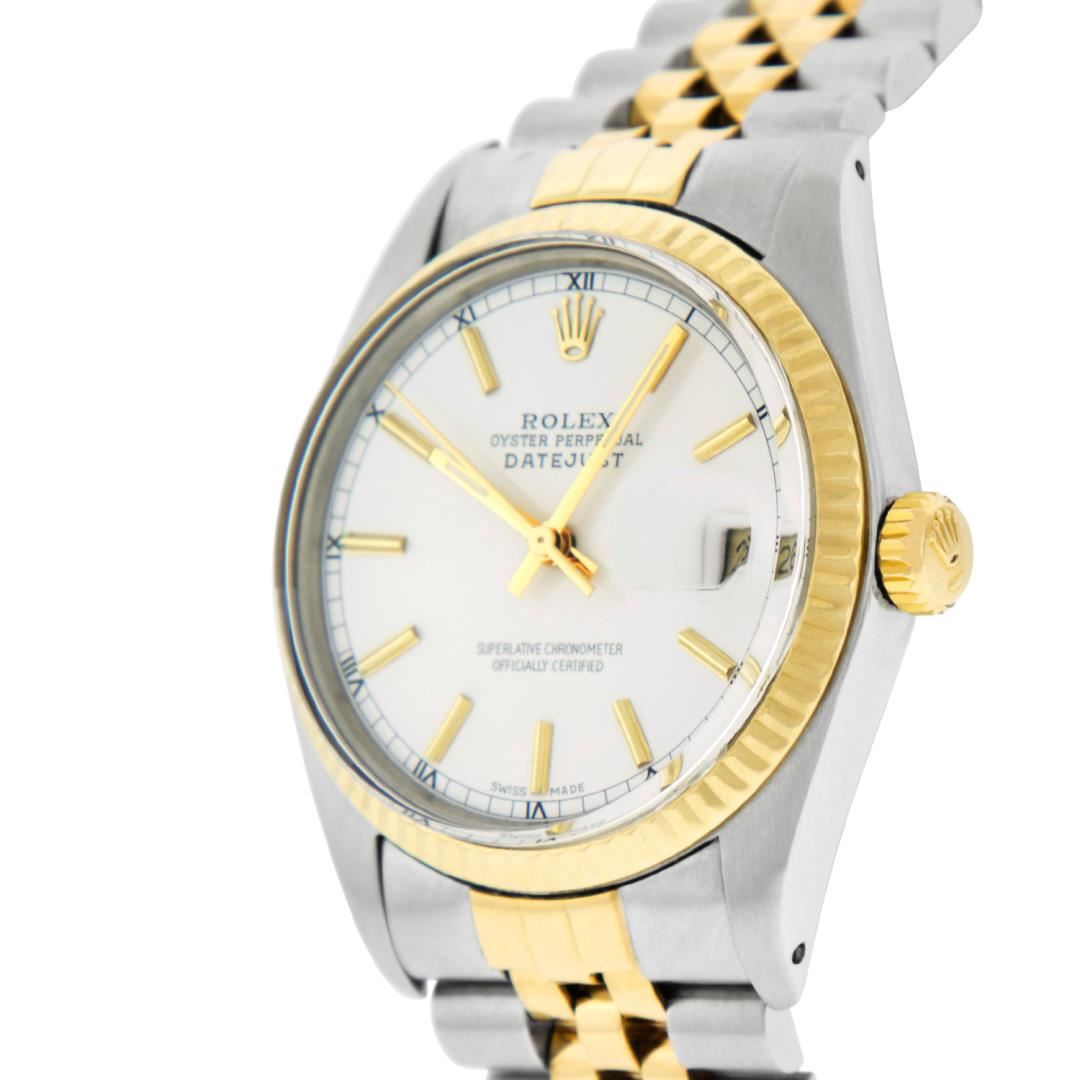 One Men's Rolex Two Tone Yellow Gold And Stainless Steel Datejust Polished, Serviced & Electronically Tested, 14K Yellow Gold & Stainless Steel Case: 36mm, 14K Yellow Gold Crown, Rolex Bezel: 14K Yellow Gold Fluted Bezel. Custom Crystal: New Acrylic With Magnified Date Window. Custom Hands: New Luminescent Hands. Rolex Movement: Automatic Winding Movement 3035. Custom Dial: Refinished To Silver With Index Hour Markers And Square Track. Date Window: 3 O'Clock Position Date Display, Quickset, Model: Datejust. Condition: G-6 Extra Fine. Rolex Bracelet: 14K Two Tone Yellow Gold & Stainless Steel Jubilee Band. Bright Polish. 7.0 Inch Length, Adjustable. Standard Clasp, With Rolex Logo. This Watch Has Been Serviced Time Tested And Is In Excellent Condition It Is Free Of All Scratches And Dents.