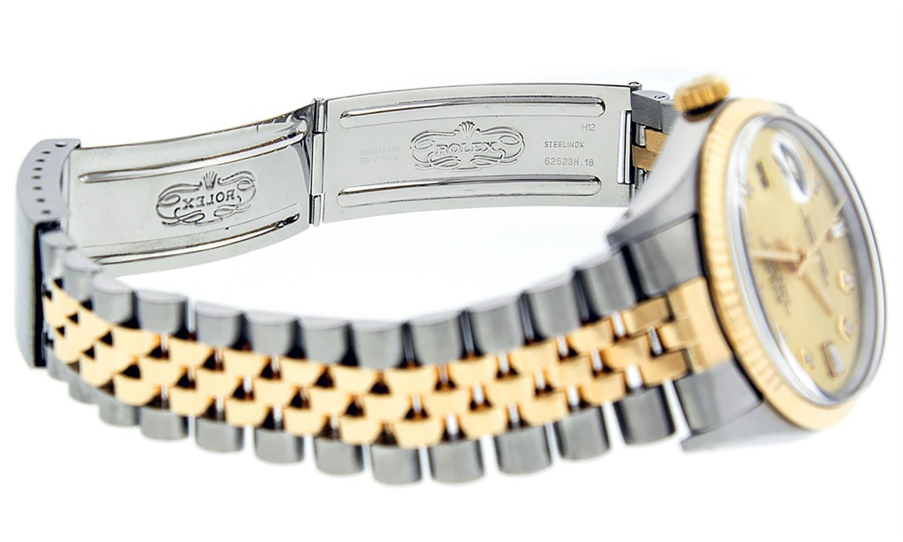 One Men's Yellow Gold Two Tone Rolex Datejust Polished, Serviced & Electronically Tested, Yellow Gold & Stainless Steel Case: 36mm, Yellow Gold Crown, Bezel: Yellow Gold Fluted Bezel. Custom Crystal: New Acrylic Cyclops Lens. Custom Hands: New Luminescent Hands. Movement: Automatic Winding Movement.. Custom Dial: Champagne Diamond Dial, Diamond Count: 8 Diamonds + 2 Baguette Diamonds in Dial, G To H In Color, SI-VS Clarity. Date Window: 3 O'clock Position Date Display, Quickset, Model: Datejust, Condition: G-6 Extra Fine. Bracelet: Two Tone Yellow Gold & Stainless Steel Jubilee Band. Bright Polish. 7.0 Inch Length, Adjustable. Standard Clasp, With Rolex Logo. This Watch Has Been Serviced And Polished It Is Free Of All Scratches And Dents.