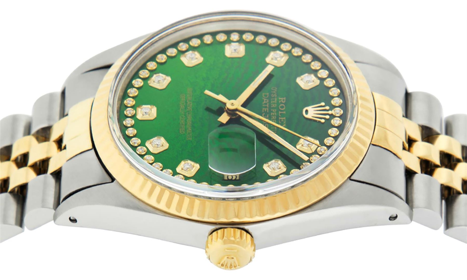 One Men's Yellow Gold Two Tone Rolex Datejust Polished, Serviced & Electronically Tested, Yellow Gold & Stainless Steel Case: 36mm, Yellow Gold Crown, Bezel: Yellow Gold Fluted Bezel. Custom Crystal: New Acrylic Cyclops Lens. Custom Hands: New Luminescent Hands. Movement: Automatic Winding Movement.. Custom Dial: Green String Dial Set With Diamond Hour Markers, Diamond Count: 58 Diamonds in Dial, G To H In Color, SI-VS Clarity. Date Window: 3 O'clock Position Date Display, Quickset, Model: Datejust, Condition: G-6 Extra Fine. Bracelet: Two Tone Yellow Gold & Stainless Steel Jubilee Band. Bright Polish. 7.0 Inch Length, Adjustable. Standard Clasp, With Rolex Logo. This Watch Has Been Serviced And Polished It Is Free Of All Scratches And Dents.