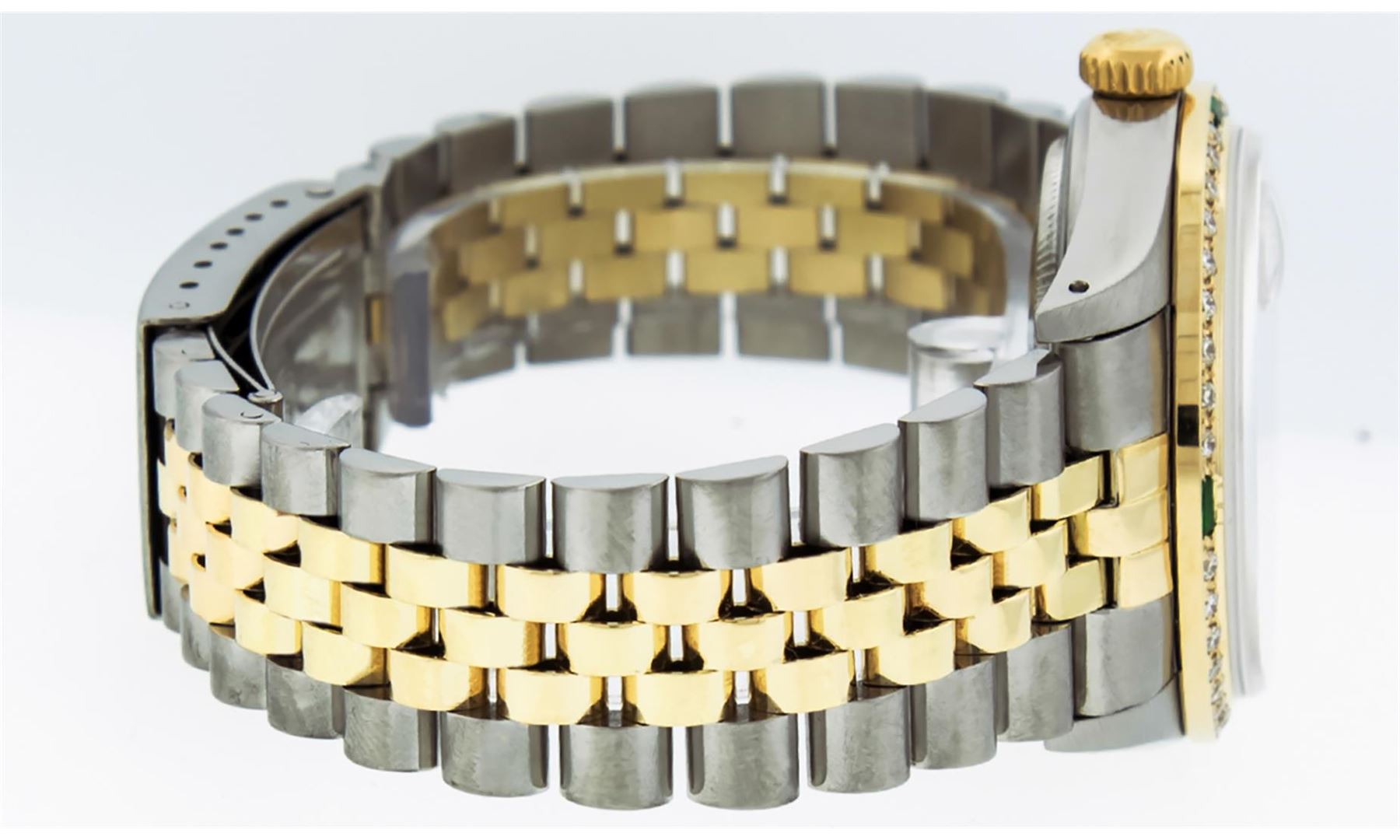 One Men's Yellow Gold Two Tone Rolex Datejust Polished, Serviced & Electronically Tested, Yellow Gold & Stainless Steel Case: 36mm, Yellow Gold Crown, Custom Bezel: 18K Yellow Gold Synthetic Emerald Beadset Diamond Bezel, Diamond Count: 36 Diamonds + 4 Synthetic Emeralds, Total Weight 1.0 Carat, Clarity: SI-VS, Color: G to H. Custom Crystal: New Synthetic Sapphire Cyclops Lens. Custom Hands: New Luminescent Hands. Movement: Automatic Winding Movement.. Custom Dial: Mother Of Pearl String Diamond Dial, Diamond Count: 48 Diamonds + 10 Emeralds, Color: G to H, Clarity: SI-VS Date Window: 3 O'clock Position Date Display, Quickset, Model: 16013 Condition: G-6 Extra Fine. Bracelet: Two Tone Yellow Gold & Stainless Steel Jubilee. Bright Polish. 7.0 Inch Length, Adjustable. Standard Clasp, With Rolex Logo. This Watch Has Been Serviced Time Tested And Is In Excellent Condition It Is Free Of All Scratches And Dents.