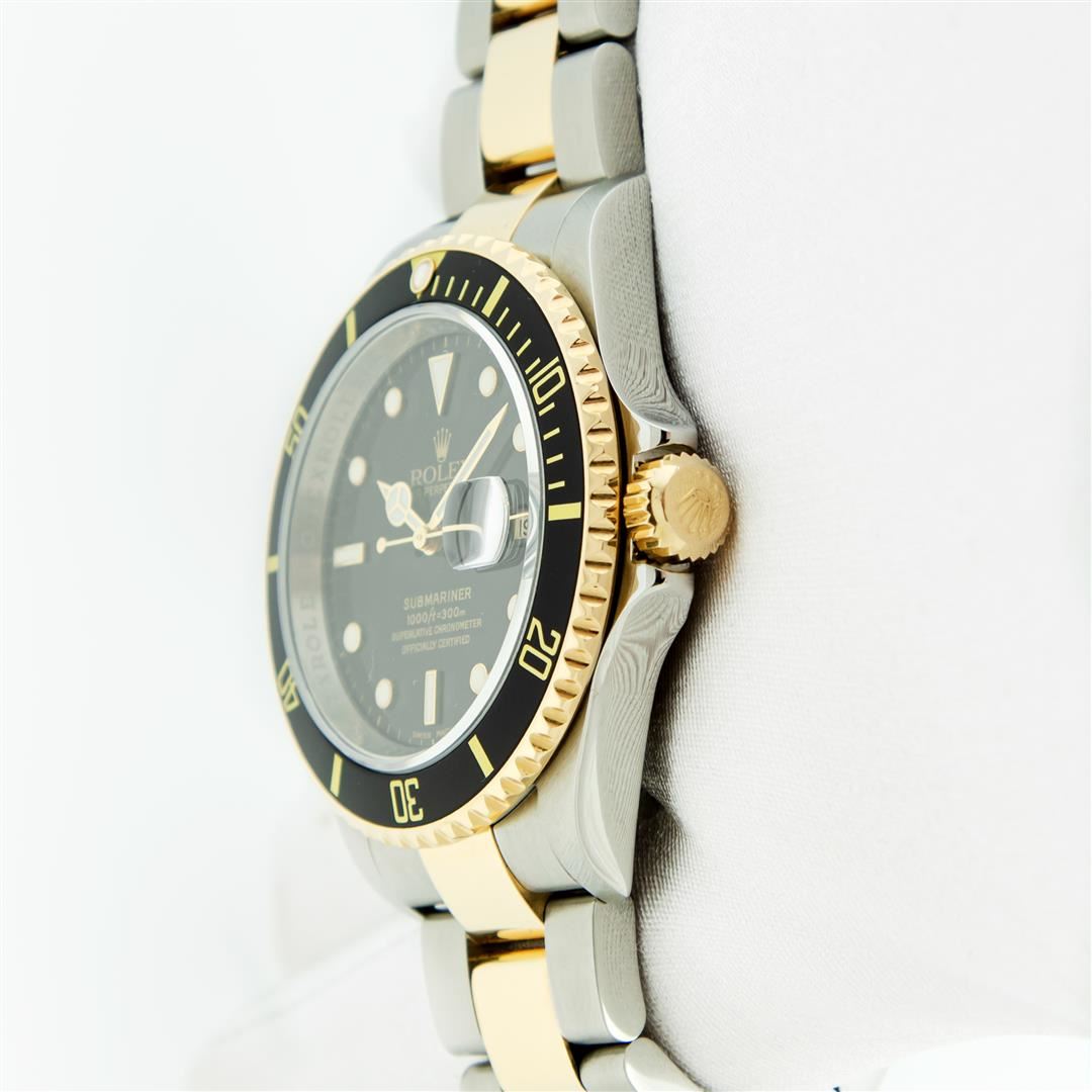 One Men's Pre Owned Rolex Two Tone 18K Yellow Gold And Stainless Steel Submariner With Date Polished, Serviced & Electronically Tested, Rolex Stainless Steel Case: 40mm, Rolex Yellow Gold Crown, Rolex Bezel: 18K Yellow Gold Rotatable Bezel With Black Insert. Crystal: Sapphire With Cyclops Lens. Rolex Movement: Automatic Winding Movement Caliber 3135. Rolex Dial: Rolex Black Submariner Dial with Luminous Index Hour Markers, Date Window: 3 O'clock Position Date Display, Model: Submariner, Quickset, Condition: G-6 Extra Fine. Rolex Bracelet: Stainless Steel and Yellow Gold Oyster Band. Bright Polish & Satin Finish. 7.0 Inch Length, Adjustable. Standard Yellow Gold Clasp, With Rolex Logo. This Pre Owned Watch Has Been Serviced Time Tested And Is In Excellent Condition It Is Free Of All Scratches And Dents. This Watch Comes With A Rolex Box.