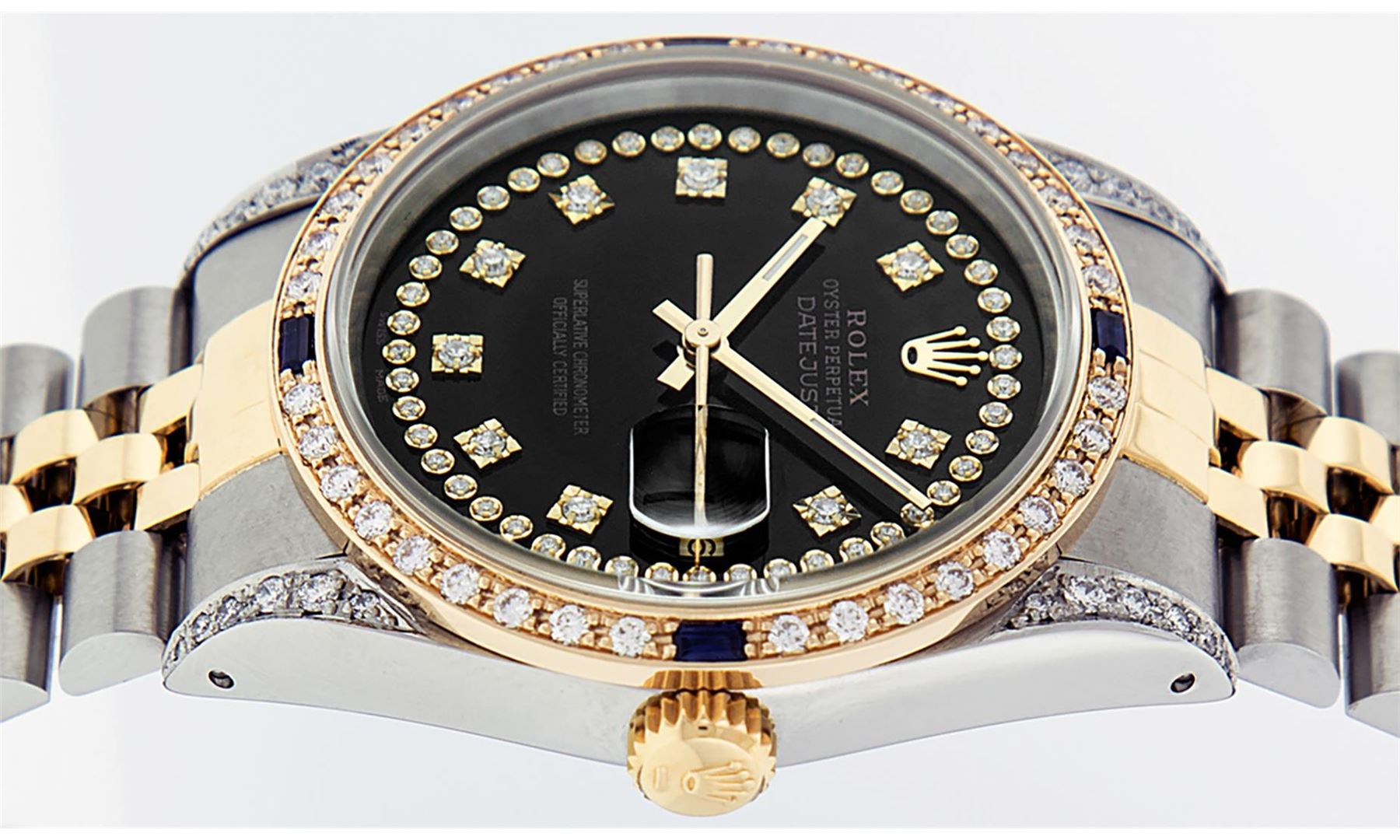 One Men's Yellow Gold & Stainless Steel Datejust Polished Bright with Satin Finish, Serviced & Electronically Tested, Stainless Steel Case: 36mm, Custom Diamond Lugs: 28 Diamonds On Lugs, Color: G to H, Clarity: SI-VS. Yellow Gold Crown, Custom Bezel: New 18K Yellow Gold Beadset Diamond + Sapphire Bezel, Diamond + Stone Count: 36 Diamonds + 4 Sapphires, Total Weight 1.00 Carat, Clarity: SI-VS, Color: G to H. Custom Crystal: New Scratch Resistant Synthetic Sapphire Cyclops Lens. Custom Hands: New Luminescent Hands. Movement: Automatic Winding Movement.. Custom Dial: Black Single Cut String Diamond Dial, Stone Count: 58 Diamonds In Dial, Color: G to H, Clarity: VS2. Date Window: 3 O'clock Position Date Display, Quickset, Model: Datejust. Condition: G-6 Extra Fine. Bracelet: Yellow Gold And Stainless Steel Jubilee Band. Bright Polish & Satin Finish. 7.0 Inch Length, Adjustable. Standard Clasp, With Rolex Logo. This Watch Has Been Serviced And Polished It Is Free Of All Scratches And Dents.