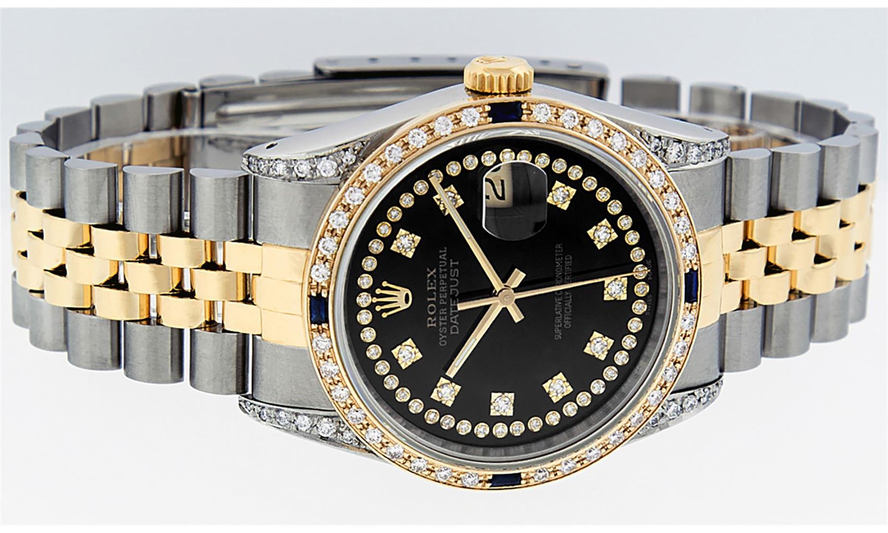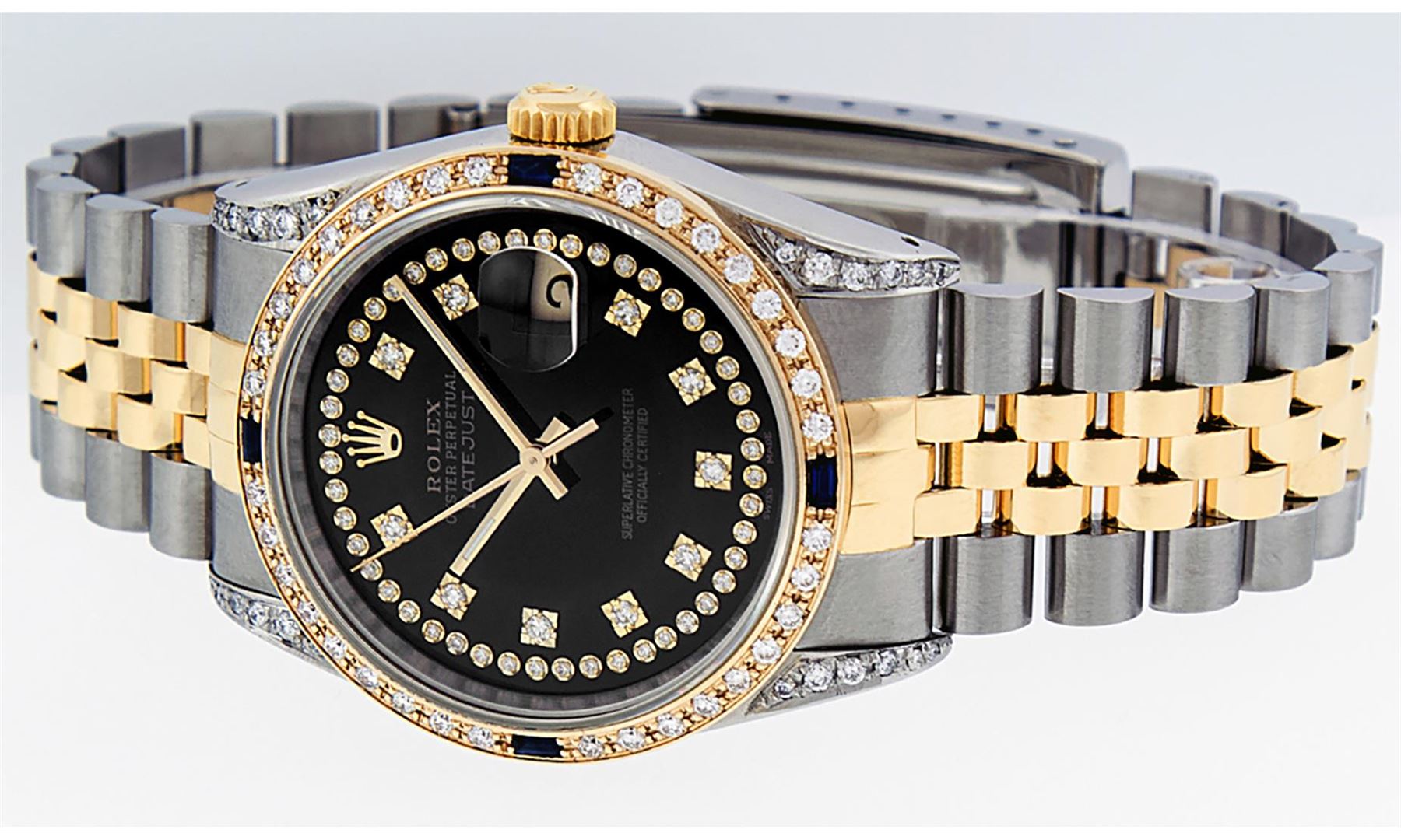 One Men's Yellow Gold & Stainless Steel Datejust Polished Bright with Satin Finish, Serviced & Electronically Tested, Stainless Steel Case: 36mm, Custom Diamond Lugs: 28 Diamonds On Lugs, Color: G to H, Clarity: SI-VS. Yellow Gold Crown, Custom Bezel: New 18K Yellow Gold Beadset Diamond + Sapphire Bezel, Diamond + Stone Count: 36 Diamonds + 4 Sapphires, Total Weight 1.00 Carat, Clarity: SI-VS, Color: G to H. Custom Crystal: New Scratch Resistant Synthetic Sapphire Cyclops Lens. Custom Hands: New Luminescent Hands. Movement: Automatic Winding Movement.. Custom Dial: Black Single Cut String Diamond Dial, Stone Count: 58 Diamonds In Dial, Color: G to H, Clarity: VS2. Date Window: 3 O'clock Position Date Display, Quickset, Model: Datejust. Condition: G-6 Extra Fine. Bracelet: Yellow Gold And Stainless Steel Jubilee Band. Bright Polish & Satin Finish. 7.0 Inch Length, Adjustable. Standard Clasp, With Rolex Logo. This Watch Has Been Serviced And Polished It Is Free Of All Scratches And Dents.