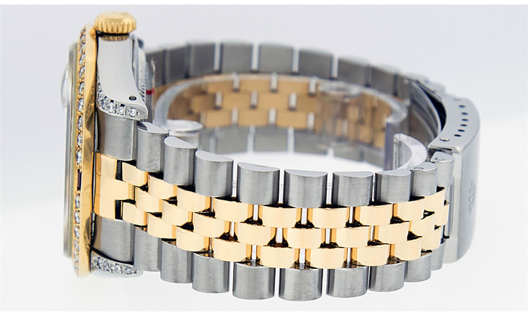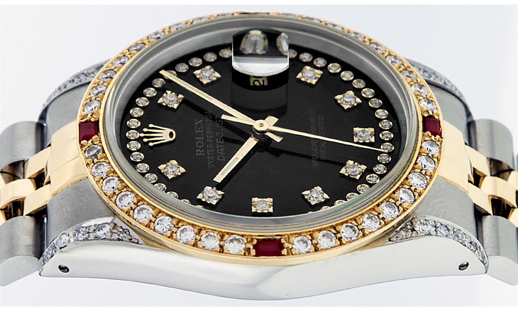 One Men's Yellow Gold & Stainless Steel Rolex Datejust Polished Bright with Satin Finish, Serviced & Electronically Tested, Stainless Steel Case: 36mm, Custom Diamond Lugs: 28 Diamonds On Lugs, Color: G to H, Clarity: SI-VS. Yellow Gold Crown, Custom Bezel: New 18K Yellow Gold Beadset Diamond + Ruby Bezel, Diamond + Stone Count: 36 Diamonds + 4 Rubies, Total Weight 1.00 Carat, Clarity: SI-VS, Color: G to H. Custom Crystal: New Scratch Resistant Synthetic Sapphire Cyclops Lens. Custom Hands: New Luminescent Hands. Movement: Automatic Winding Movement.. Custom Dial: Black Single Cut String Diamond Dial, Stone Count: 58 Diamonds In Dial, Color: G to H, Clarity: VS2. Date Window: 3 O'clock Position Date Display, Quickset, Model: Datejust. Condition: G-6 Extra Fine. Bracelet: Yellow Gold And Stainless Steel Jubilee Band. Bright Polish & Satin Finish. 7.0 Inch Length, Adjustable. Standard Clasp, With Rolex Logo. This Watch Has Been Serviced And Polished It Is Free Of All Scratches And Dents.