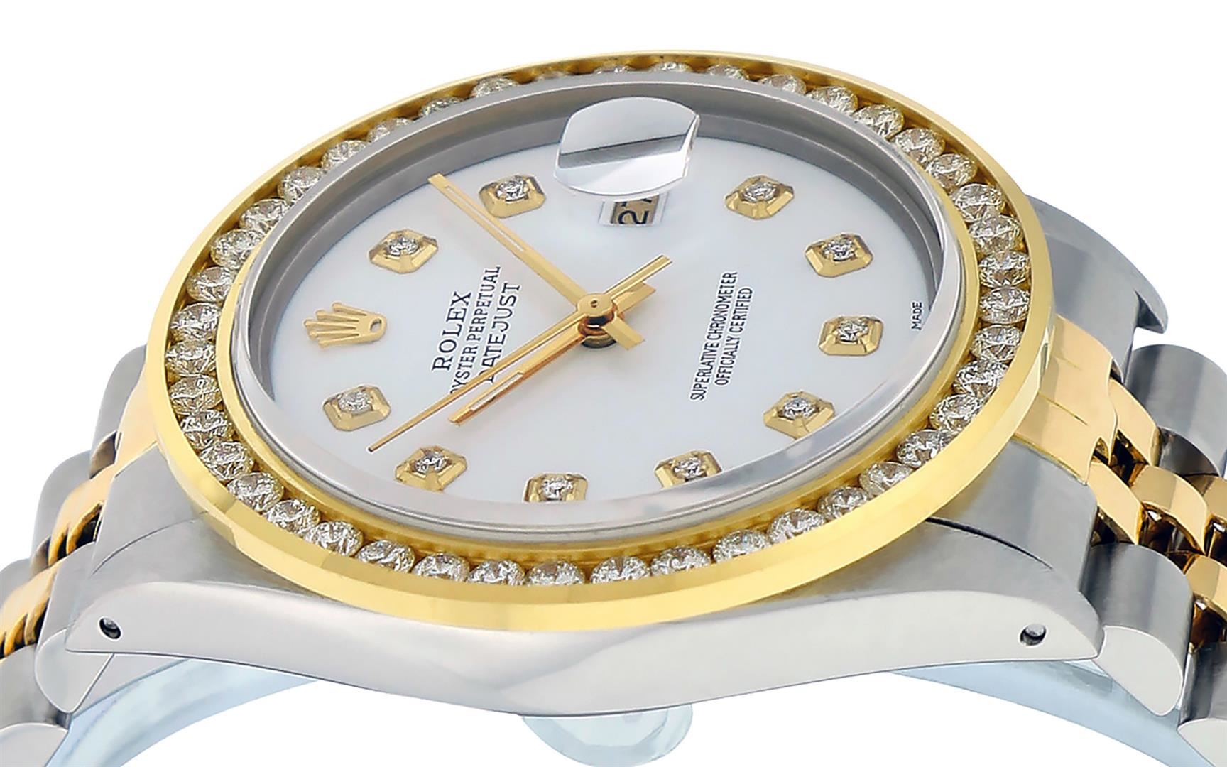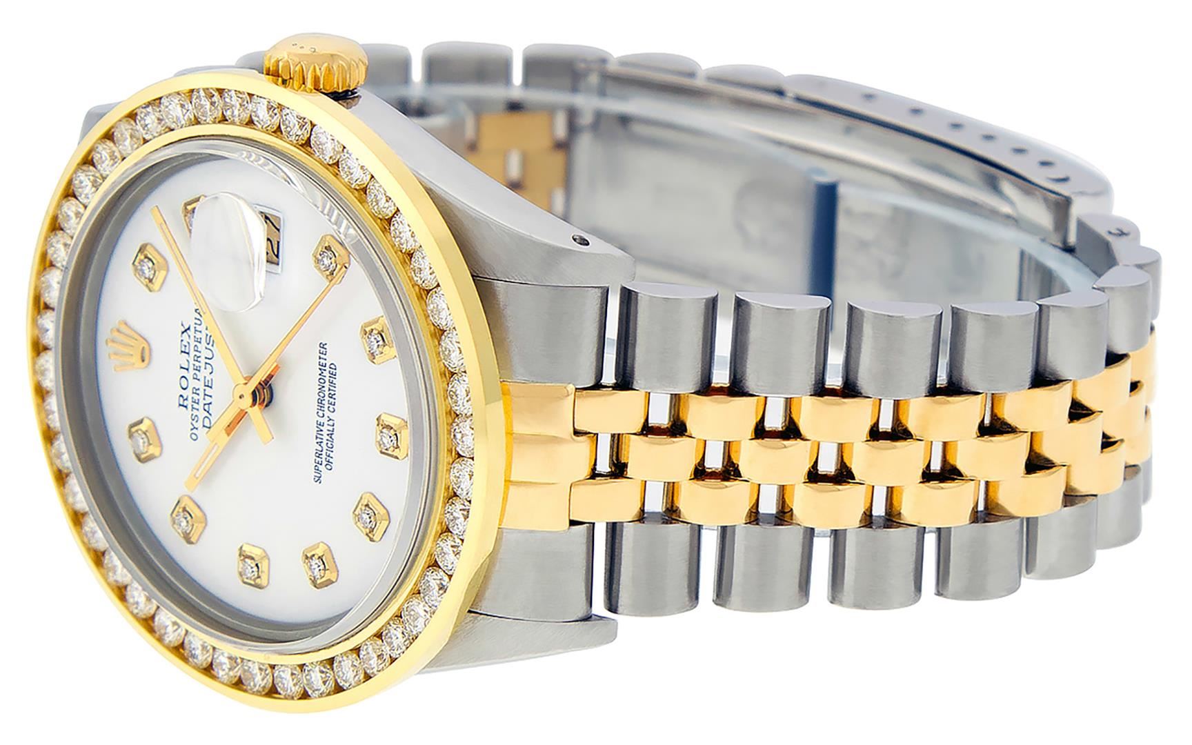 One Men's Yellow Gold Rolex Datejust Polished Bright with Satin Finish, Serviced & Electronically Tested, Stainless Steel Case: 36mm, Yellow Gold Crown, Custom Bezel: New 18K Yellow Gold 3ct Channel Set Diamond Bezel, Diamond Count: 40 Diamonds, Total Weight 3.00 Carat, Clarity: SI-VS, Color: G to H. Custom Crystal: New Synthetic Sapphire Cyclops Lens. Custom Hands: New Luminescent Hands. Movement: Automatic Winding Movement. Custom Dial: White Diamond Dial, Diamond Count: 10 Diamonds In Dial, Color: G to H, Clarity: SI-VS. Date Window: 3 O'clock Position Date Display, Quickset, Model: Datejust Condition: G-6 Extra Fine. Bracelet: Yellow Gold And Stainless Steel Jubilee Band. Bright Polish & Satin Finish. 7.0 Inch Length, Adjustable. Standard Clasp, With Rolex Logo. This Watch Has Been Serviced And Polished It Is Free Of All Scratches And Dents.