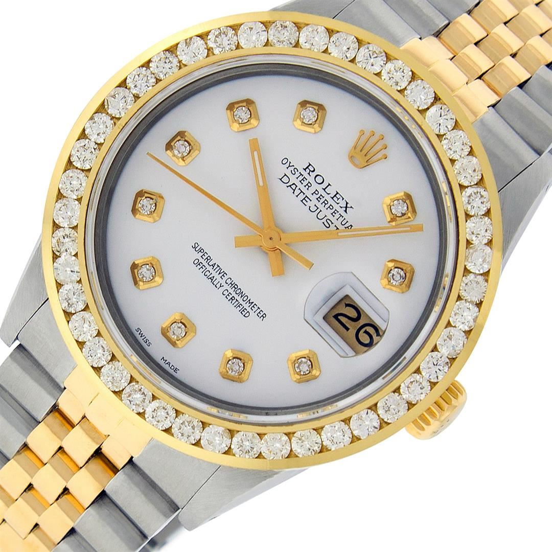 One Men's Yellow Gold Rolex Datejust Polished Bright with Satin Finish, Serviced & Electronically Tested, Stainless Steel Case: 36mm, Yellow Gold Crown, Custom Bezel: New 18K Yellow Gold 3ct Channel Set Diamond Bezel, Diamond Count: 40 Diamonds, Total Weight 3.00 Carat, Clarity: SI-VS, Color: G to H. Custom Crystal: New Synthetic Sapphire Cyclops Lens. Custom Hands: New Luminescent Hands. Movement: Automatic Winding Movement. Custom Dial: White Diamond Dial, Diamond Count: 10 Diamonds In Dial, Color: G to H, Clarity: SI-VS. Date Window: 3 O'clock Position Date Display, Quickset, Model: Datejust Condition: G-6 Extra Fine. Bracelet: Yellow Gold And Stainless Steel Jubilee Band. Bright Polish & Satin Finish. 7.0 Inch Length, Adjustable. Standard Clasp, With Rolex Logo. This Watch Has Been Serviced And Polished It Is Free Of All Scratches And Dents.