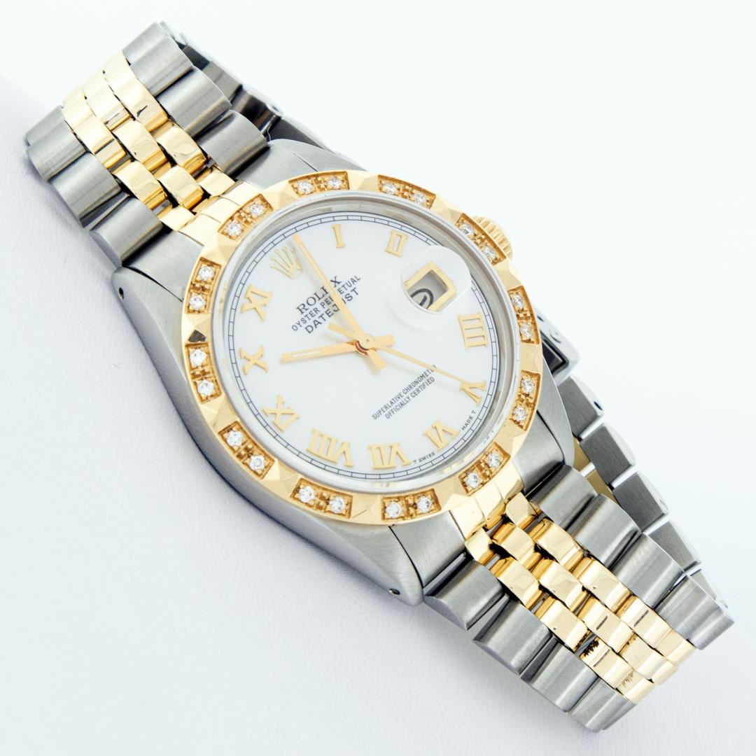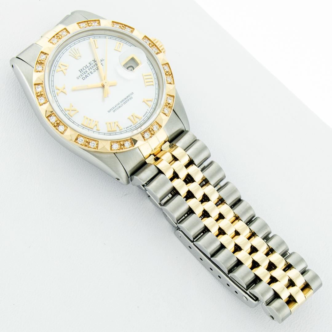 One Men's Rolex Pre Owned Yellow Gold And Stainless Steel Datejust Polished Bright with Satin Finish, Serviced & Electronically Tested, Rolex Stainless Steel Case: 36mm, Rolex Yellow Gold Crown, Custom Bezel: New 18K Yellow Gold Pyramid Diamond Bezel, Diamond Count: 24 Diamonds, Clarity: SI-VS, Color: G to H. Custom Crystal: New Sapphire With Magnified Date. Custom Hands: New Luminescent Hands. Rolex Movement: Automatic Winding Movement 3035. Rolex Dial: White Dial With Roman Hour Markers And Square Track. Date Window: 3 O'Clock Position Date Display, Quickset, Model: Datejust. Condition: G-6 Extra Fine. Rolex Bracelet: 14K Yellow Gold And Stainless Steel Jubilee Band. Bright Polish & Satin Finish. 7.0 Inch Length, Adjustable. Standard Clasp, With Rolex Logo. This Watch Has Been Serviced And Polished It Is Free Of All Scratches And Dents.