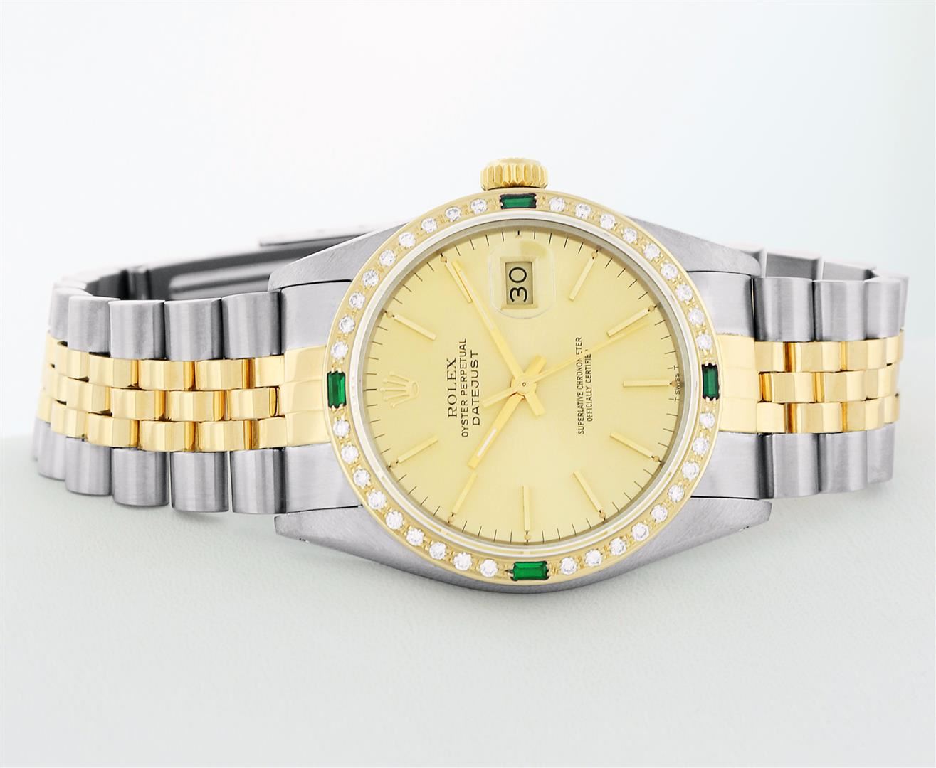 One Mens Rolex Quickset Pre Owned Two Tone 14K Yellow Gold And Stainless Steel Datejust Polished, Serviced & Electronically Tested, Rolex Yellow Gold & Stainless Steel Case: 36mm, Rolex 14K Yellow Gold Crown, Custom Bezel: New 18K Yellow Diamond + Emerald Beadset Bezel, Stone Count: 36 Diamonds + 4 Emeralds, Total Weight .75 Carat, Clarity: SI-VS, Color: G to H. Custom Crystal: New Sapphire With Magnified Date Window. Custom Hands: New Luminecent Hands. Rolex Movement: Automatic Winding Movement 3035. Rolex Dial: Champagne Dial With Index Hour Markers Dash Track And Lumi Dots. Date Window: 3 O'Clock Position Date Display, Quickset, Model: Datejust. Condition: G-6 Extra Fine. Rolex Bracelet: Two Tone 14K Yellow Gold & Stainless Steel Jubilee Band. Bright Polish. 7.0 Inch Length, Adjustable. Standard Clasp, With Rolex Logo. This Watch Has Been Serviced Time Tested And Is In Excellent Condition It Is Free Of All Scratches And Dents.