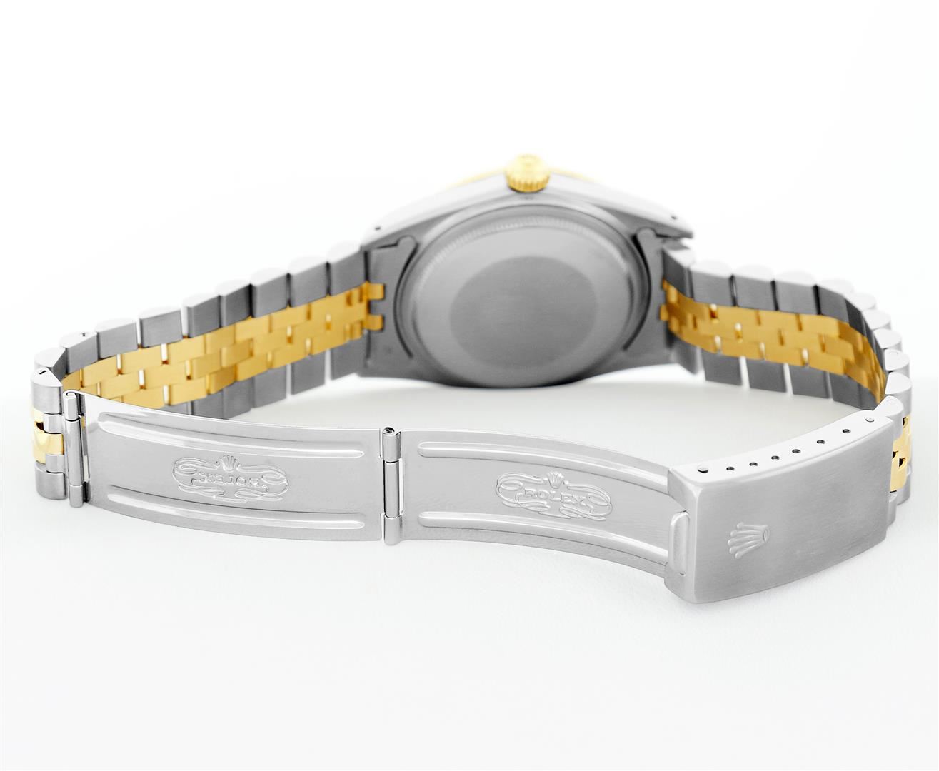 One Mens Rolex Quickset Pre Owned Two Tone 14K Yellow Gold And Stainless Steel Datejust Polished, Serviced & Electronically Tested, Rolex Yellow Gold & Stainless Steel Case: 36mm, Rolex 14K Yellow Gold Crown, Custom Bezel: New 18K Yellow Diamond + Emerald Beadset Bezel, Stone Count: 36 Diamonds + 4 Emeralds, Total Weight.75 Carat, Clarity: SI-VS, Color: G to H. Custom Crystal: New Sapphire With Magnified Date Window. Custom Hands: New Luminecent Hands. Rolex Movement: Automatic Winding Movement 3035. Rolex Dial: Champagne Dial With Index Hour Markers Dash Track And Lumi Dots. Date Window: 3 O'Clock Position Date Display, Quickset, Model: Datejust. Condition: G-6 Extra Fine. Rolex Bracelet: Two Tone 14K Yellow Gold & Stainless Steel Jubilee Band. Bright Polish. 7.0 Inch Length, Adjustable. Standard Clasp, With Rolex Logo. This Watch Has Been Serviced Time Tested And Is In Excellent Condition It Is Free Of All Scratches And Dents.