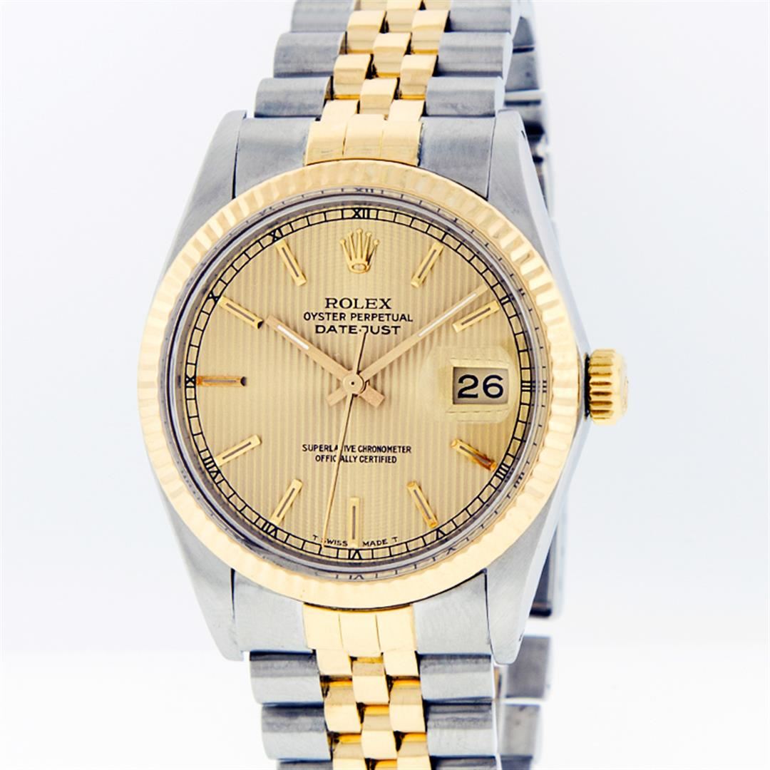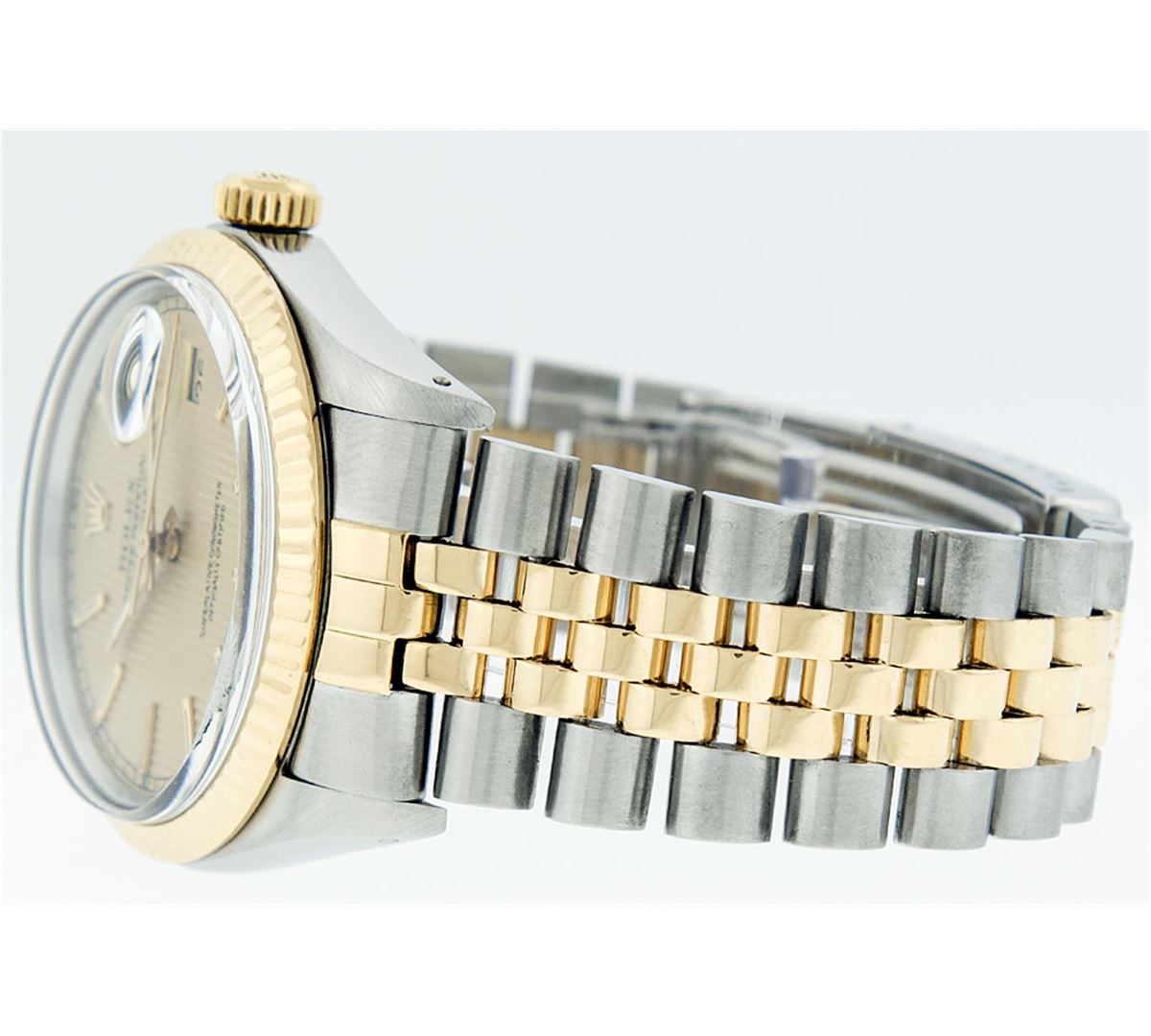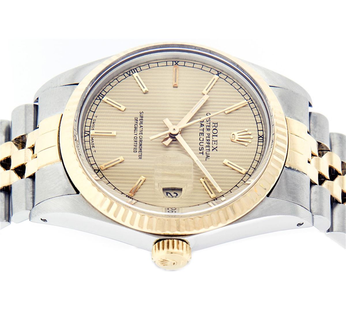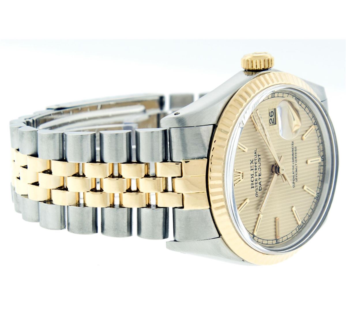 One Gents Two Tone Rolex Datejust Polished, Serviced & Electronically Tested, 14K Yellow Gold & Stainless Steel Case:36mm, 14K Yellow Gold Crown, Bezel: 14K Yellow Gold Fluted Bezel. Custom Crystal: Acrylic Cyclops Lens. Movement: Automatic Winding Movement Caliber 3035. Dial: Champagne Tapestry With Index Hour Markers & Square Roman Tracks. Date Window: 3 O'Clock Position Date Display, Quickset, Model: 16013 Condition: G-6 Extra Fine. Bracelet: Two Tone 14K Yellow Gold & Stainless Steel Jubilee. Bright Polish. 7.0 Inch Length, Adjustable. Standard Clasp, With Rolex Logo.