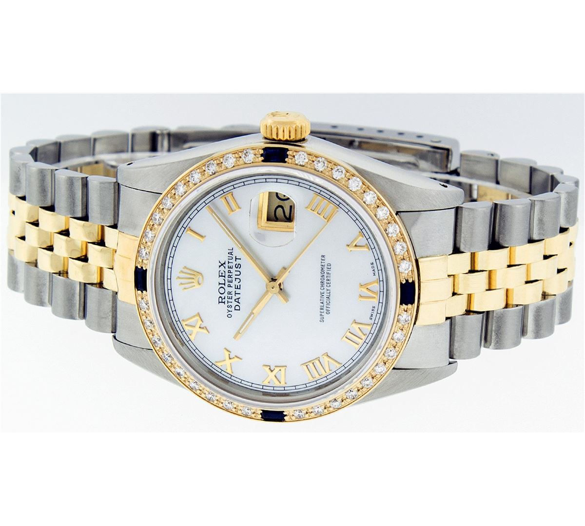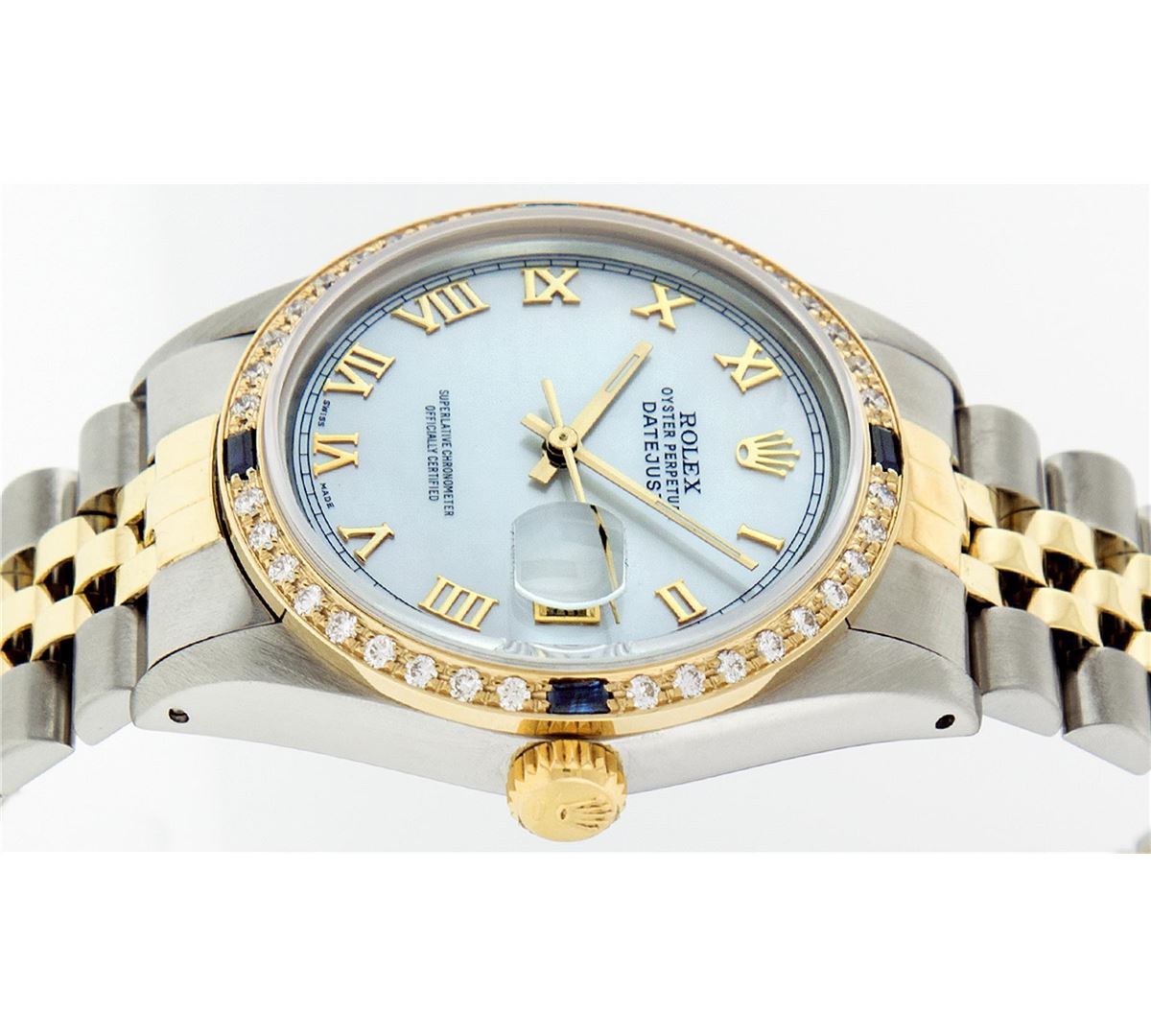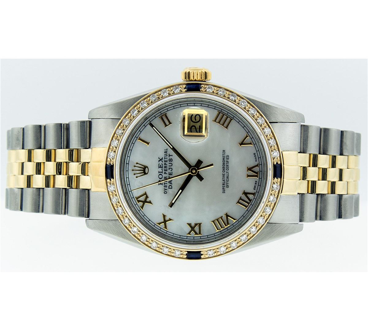 One Mens Two Tone Rolex Datejust Polished, Serviced & Electronically Tested, 14K Yellow Gold & Stainless Steel Case:36mm, 14K Yellow Gold Crown, Custom Bezel: 18K Yellow Gold Sapphire Beadset Diamond Bezel, Diamond Count: 36 Diamonds + 4 Sapphires, Total Weight 1.00 Carat, Clarity: Si-VS, Color: G to H. Custom Crystal: Synthetic Sapphire Cyclops Lens. Movement: Automatic Winding Movement Caliber 3035. Custom Dial: Mother Of Pearl Roman Dial. Date Window: 3 O'Clock Position Date Display, Quickset, Model: 16013 Condition: G-6 Extra Fine. Bracelet:Two Tone 14K Yellow Gold & Stainless Steel Jubilee. Bright Polish. 7.0 Inch Length, Adjustable. Standard Clasp, With Rolex Logo.