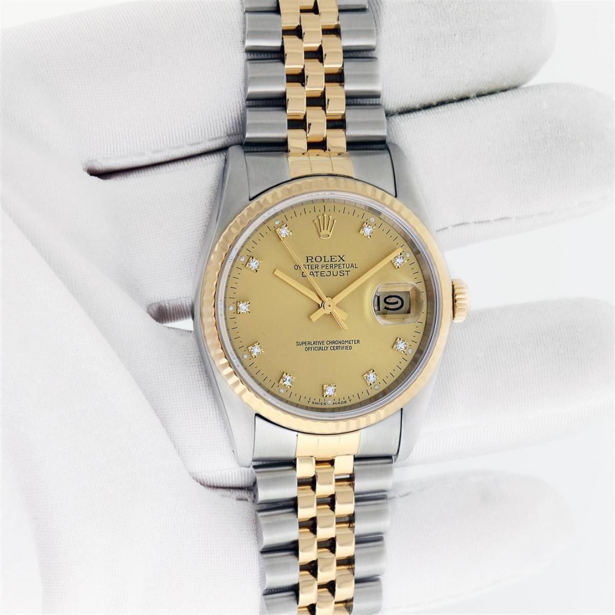 One Mens 18K Yellow Gold & Stainless Steel Two Tone Rolex Oyster Perpetual Datejust Polished, Serviced & Electronically Tested, 18K Yellow Gold & Stainless Steel Case: 36mm, Original Bezel: 18K Yellow Gold Fluted Bezel, Custom Crystal: New Scratch Resistant Sapphire Crystal Lens. Custom Hands: New Yellow Hands. Movement: Automatic Winding Movement 3135. Dial: Original Rolex Factory Champagne Dial with Diamond Hour Markers Dash Track & Lumi Dots, Diamond Count: 10 Diamonds in Dial, Clarity: VVS Date Window: 3 O'Clock Position Date Display, Quickset, Model: Datejust, Condition: G-6 Extra Fine. Bracelet: Tight Two Tone 18K Yellow Gold & Stainless Steel Jubilee Showing Little To No Stretch. Bright Polish. 7.0 Inch Length, Adjustable. Standard Clasp, With Rolex Logo. This Watch Has Been Serviced And Polished It Is Free Of All Scratches And Dents. This Watch Comes With The Following Accessories: Rolex Box, Rolex Booklets, and Rolex Wallet.