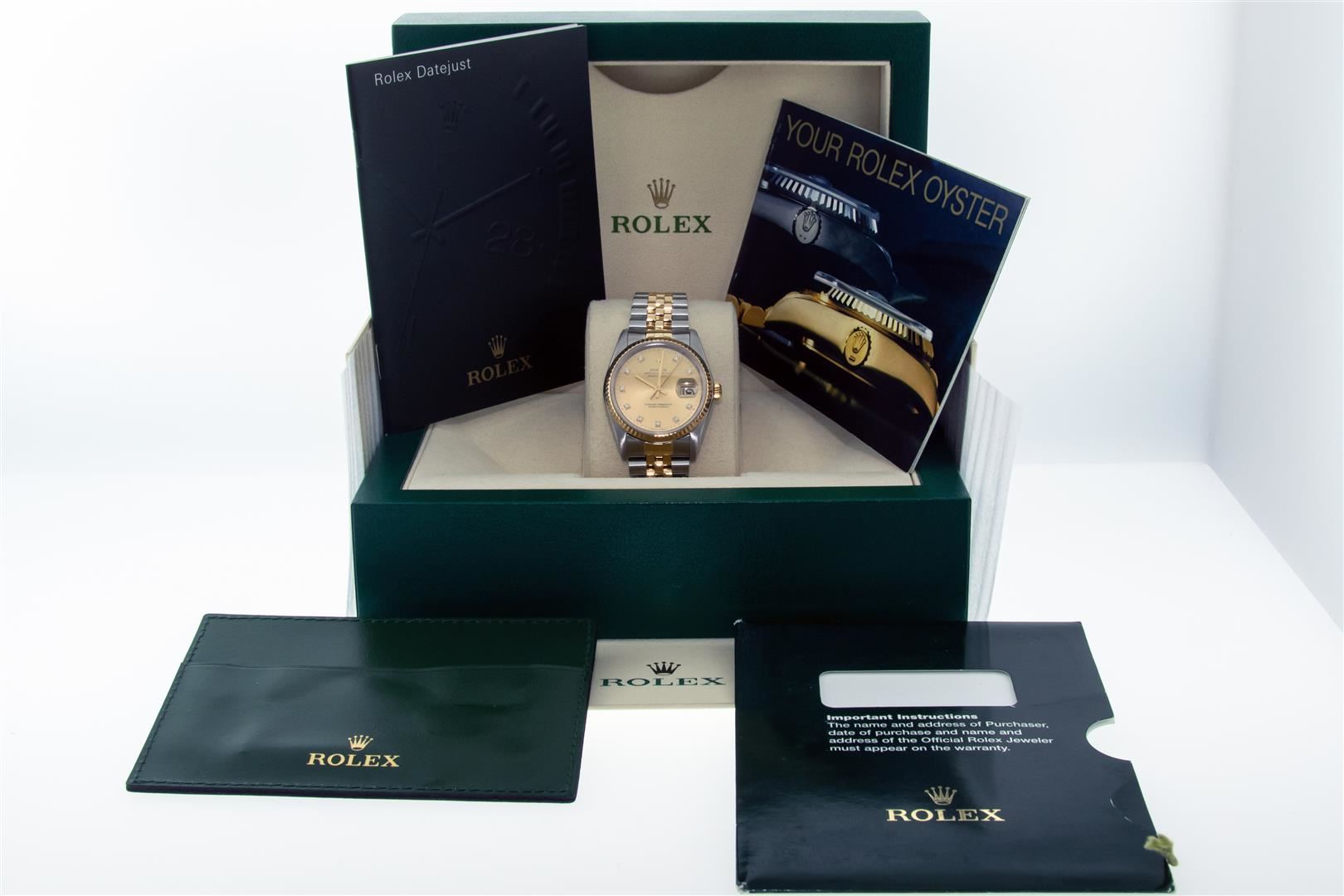 One Mens 18K Yellow Gold & Stainless Steel Two Tone Rolex Oyster Perpetual Datejust Polished, Serviced & Electronically Tested, 18K Yellow Gold & Stainless Steel Case: 36mm, Original Bezel: 18K Yellow Gold Fluted Bezel, Custom Crystal: New Scratch Resistant Sapphire Crystal Lens. Custom Hands: New Yellow Hands. Movement: Automatic Winding Movement 3135. Dial: Original Rolex Factory Champagne Dial with Diamond Hour Markers Dash Track & Lumi Dots, Diamond Count: 10 Diamonds in Dial, Clarity: VVS Date Window: 3 O'Clock Position Date Display, Quickset, Model: Datejust, Condition: G-6 Extra Fine. Bracelet: Tight Two Tone 18K Yellow Gold & Stainless Steel Jubilee Showing Little To No Stretch. Bright Polish. 7.0 Inch Length, Adjustable. Standard Clasp, With Rolex Logo. This Watch Has Been Serviced And Polished It Is Free Of All Scratches And Dents. This Watch Comes With The Following Accessories: Rolex Box, Rolex Booklets, and Rolex Wallet.