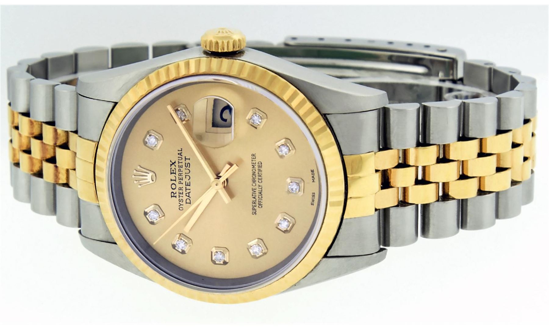One Gents 18K Yellow Gold Two Tone Rolex Datejust Polished, Serviced & Electronically Tested Watch, 18K Yellow Gold & Stainless Steel Case Size:36mm. Bezel: 18K Yellow Gold Fluted Bezel. Custom Crystal: Synthetic Sapphire Cyclops Lens. Movement: Automatic Winding Movement Caliber 3135. Custom Dial: Champagne Diamond Dial, Diamond Count: 10 Diamonds In Dial, Color: G To H, Clarity: SI-VS, Date Window: 3 O'Clock Position Date Display, Quickset, Model: 16233 Condition: G-6 Extra Fine The Watch Is In Very Good Condition Free Of All Scratches And Dents. Bracelet:Two Tone 18K Yellow Gold & Stainless Steel Jubilee Band. Bright Polish. 7.0 Inch Length, Adjustable. Standard Clasp, With Rolex Logo.