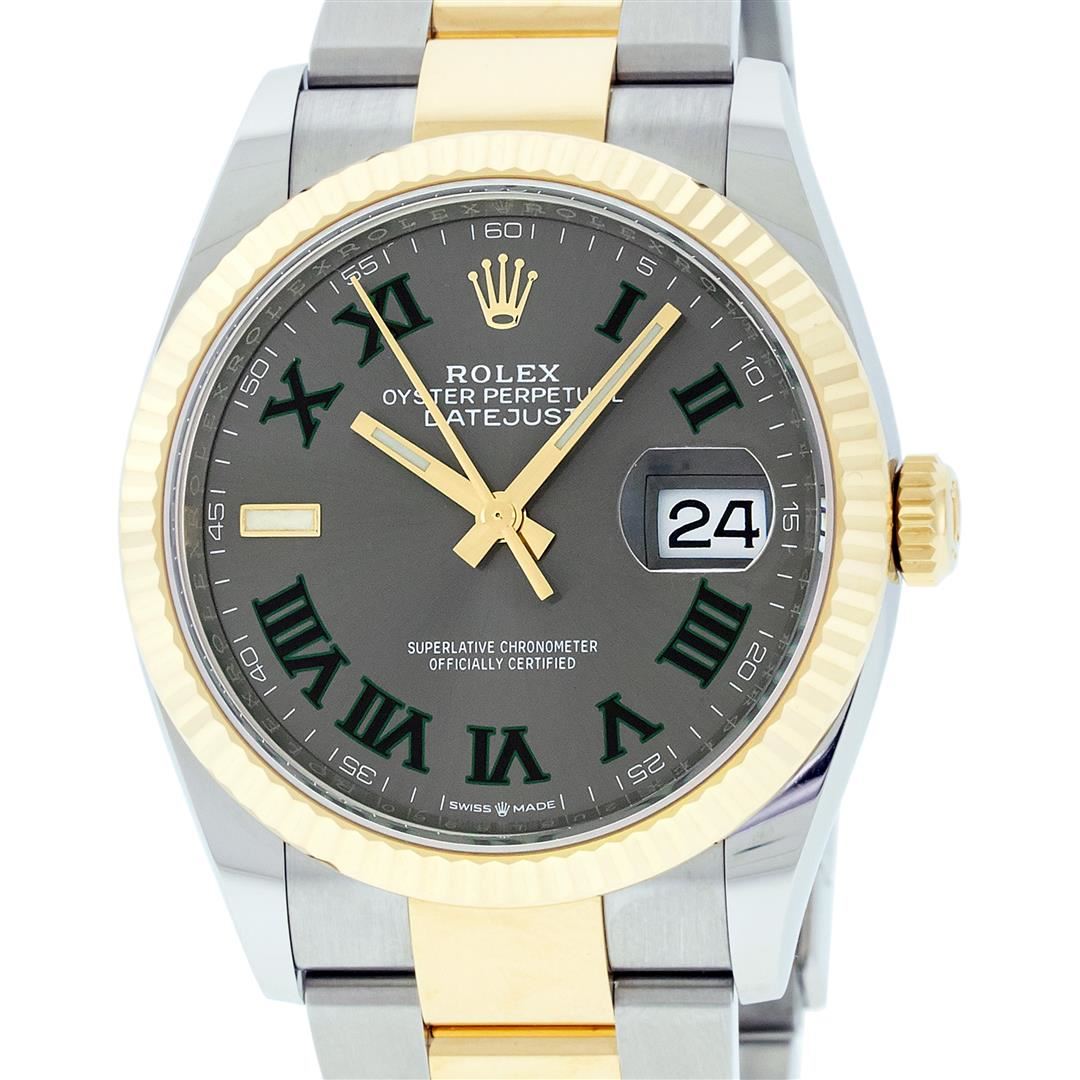 One Mens Rolex Two Tone 18K Yellow Gold And Stainless Steel Datejust, Polished Bright with Satin Finish, Serviced & Electronically Tested, Stainless Steel Case: 36mm, Rolex Yellow Gold Crown, Rolex Bezel: 18K Yellow Gold Fluted Bezel. Crystal: Sapphire Wi