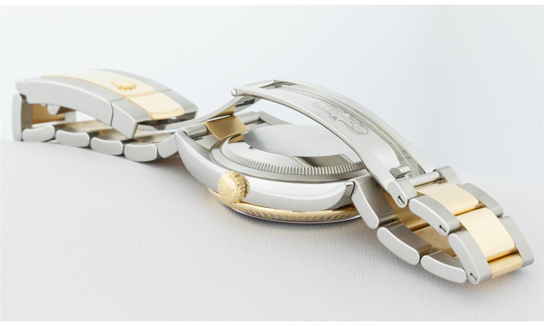 One Mens Rolex Two Tone 18K Yellow Gold And Stainless Steel Datejust, Polished Bright with Satin Finish, Serviced & Electronically Tested, Stainless Steel Case: 36mm, Rolex Yellow Gold Crown, Rolex Bezel: 18K Yellow Gold Fluted Bezel. Crystal: Sapphire Wi
