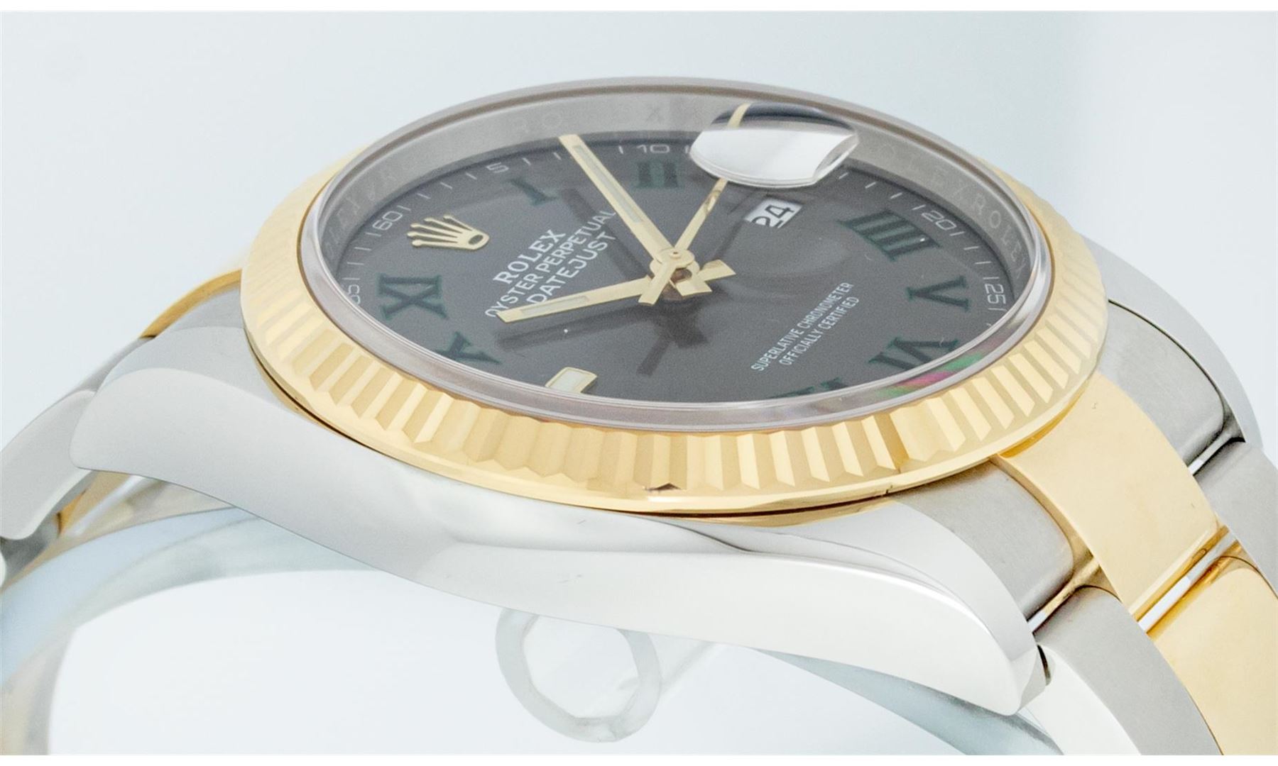 One Mens Rolex Two Tone 18K Yellow Gold And Stainless Steel Datejust, Polished Bright with Satin Finish, Serviced & Electronically Tested, Stainless Steel Case: 36mm, Rolex Yellow Gold Crown, Rolex Bezel: 18K Yellow Gold Fluted Bezel. Crystal: Sapphire With Cyclops Lens. Rolex Movement: Automatic Winding Movement Caliber 3235. Rolex Dial: "Wimbledon" Gray Roman Dial. Date Window: 3 O'Clock Position Date Display, Quickset, Model: Quickset Datejust 126233. Condition: G-6 Extra Fine. Rolex Bracelet: 18K Yellow Gold And Stainless Steel Oyster Band. Bright Polish & Satin Finish. 7.5 Inch Length, Adjustable. Standard Clasp, With Rolex Logo. This Pre Owned Watch Has Been Serviced Time Tested And Is In Excellent Condition It Is Free Of All Scratches And Dents. This Watch Comes With Box And Papers.