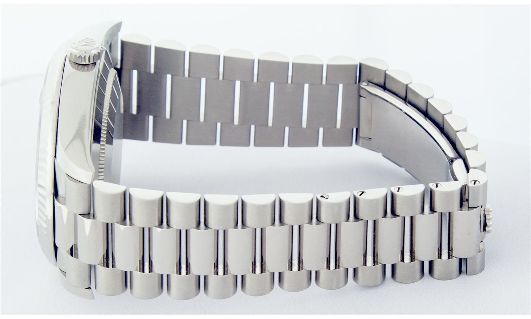 One Mens Quickset Rolex Day Date 18K White Gold President Polished, Serviced & Electronically Tested, Rolex 18K White Gold Case: 40mm, Rolex 18K White Gold Crown, Rolex Bezel: 18K White Gold Fluted Bezel. Crystal: Sapphire With Magnified Date Window. Hands: Solid Hands. Rolex Movement: Automatic Quickset Winding Movement Caliber 3255. Rolex Dial: Olive Green Roman Dial With Square Track. Date Window: 3 O'Clock Position, Day Display: 12 O'Clock Position, Double Quickset, Model: Day Date Quickset President. Condition: G-6 Extra Fine. Rolex Bracelet: 18K White Gold President Band With Hidden Clasp, Bright & Satin Polish. 7.5 Inch Length, Standard Hidden President Clasp, With Rolex Logo. This Pre Owned Watch Has Been Serviced Time Tested And Is In Excellent Condition It Is Free Of All Scratches And Dents. This Watch Comes With Box And Papers.