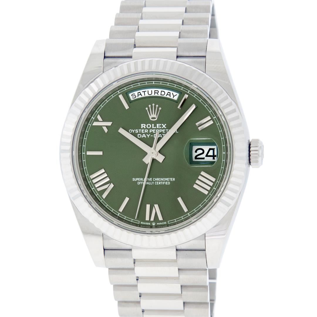 Rolex Mens 18K White Gold Olive Green Roman Dial Day Date President 40MM With Bo
