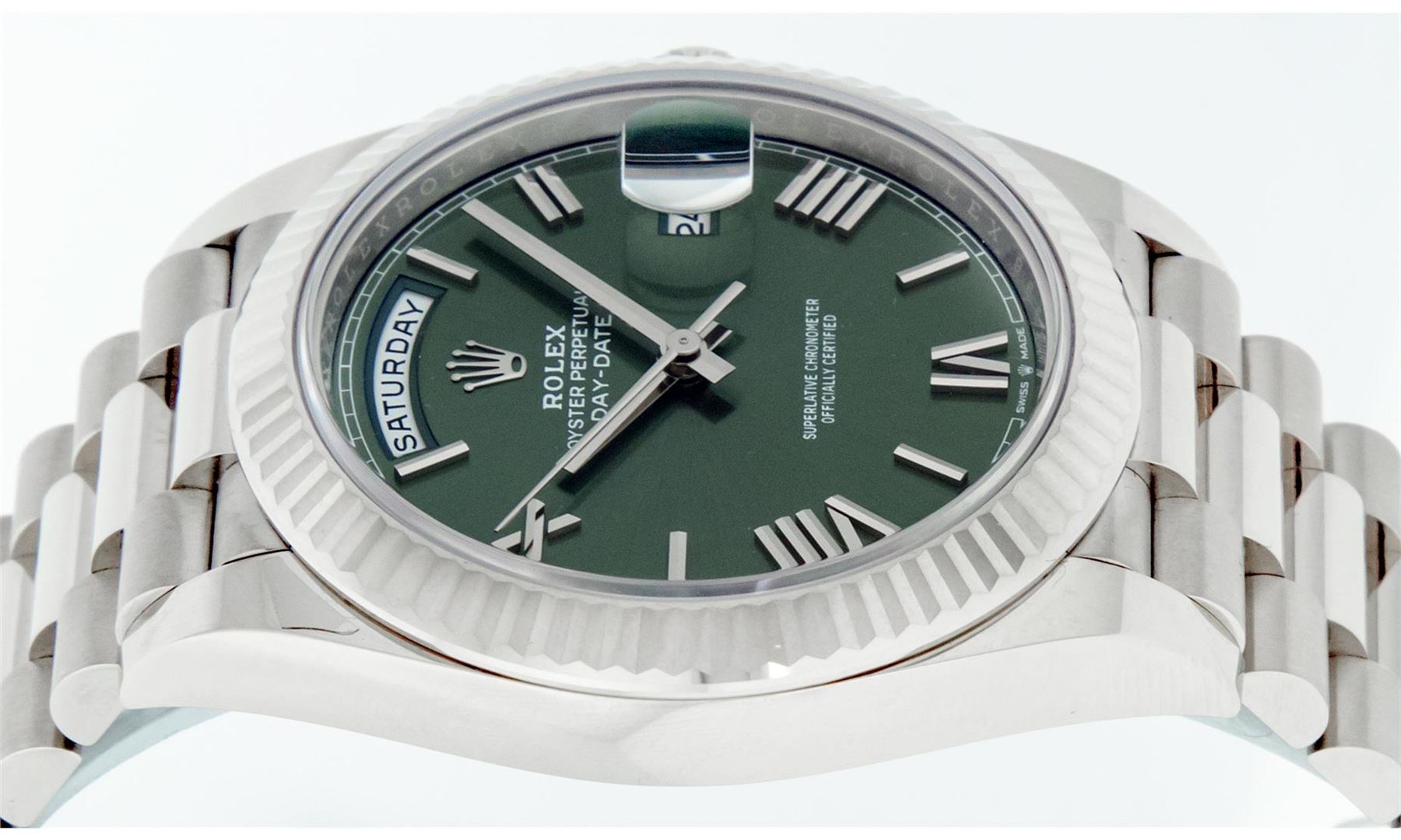 Rolex Mens 18K White Gold Olive Green Roman Dial Day Date President 40MM With Bo