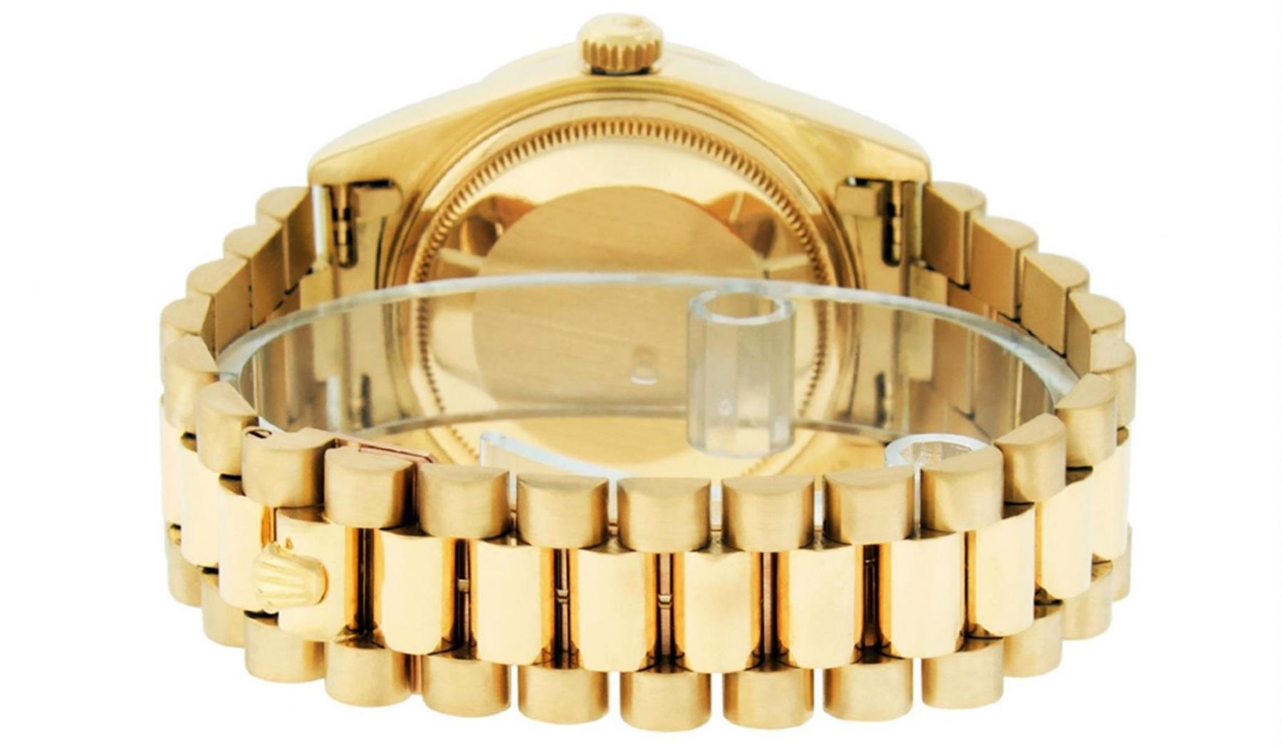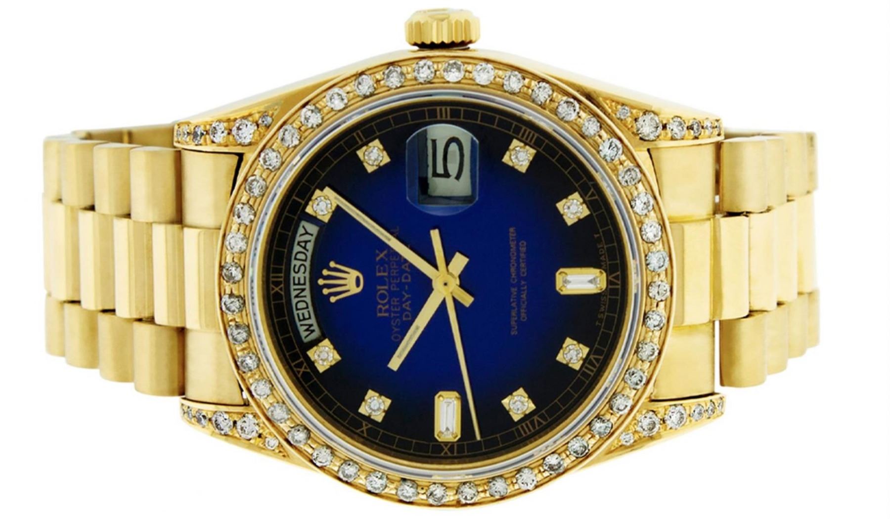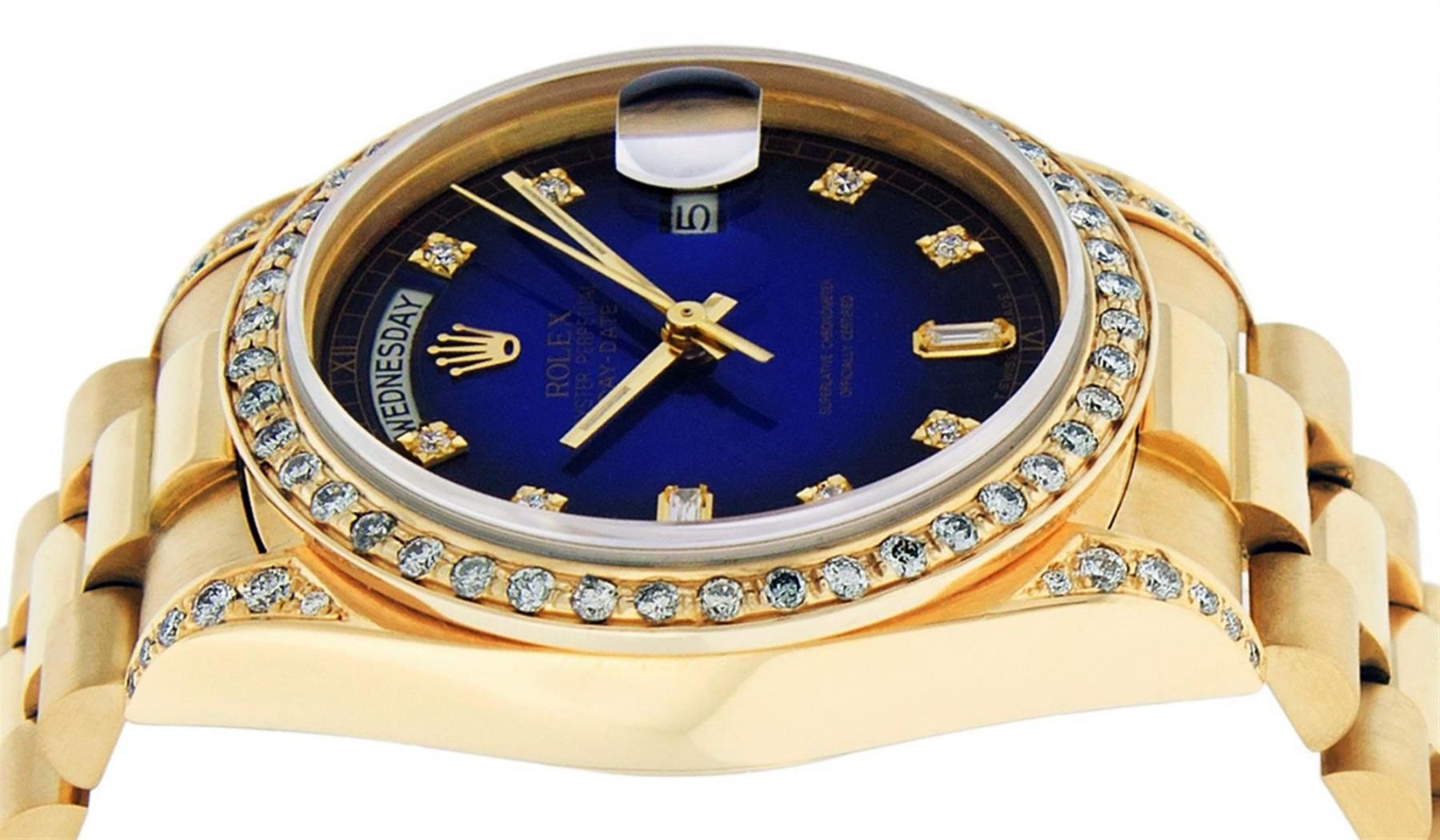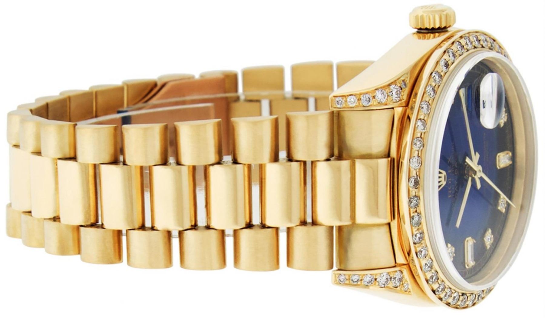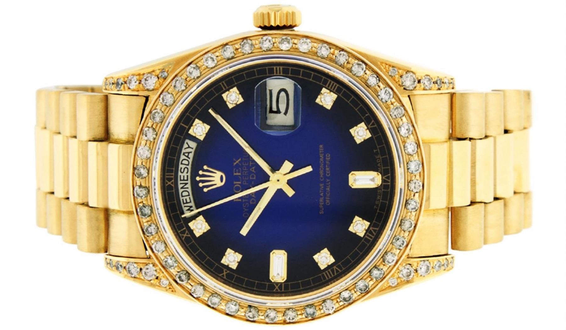 One Mens Rolex Day Date 18K Yellow Gold President Polished, Serviced & Electronically Tested, 18K Yellow Gold Case: 36mm, Custom Diamond Lugs: 28 Diamonds On Lugs, Color: G to H, Clarity: SI-VS. 18K Yellow Gold Crown, Custom Bezel: New 18K Yellow Gold Beadset Diamond Bezel, Diamond Count: 44 Diamonds On Bezel. Total Weight 1.00 Carat, Clarity: SI-VS, Color: G to H. Custom Crystal: New Scratch Resistant Synthetic Sapphire Cyclops Lens. Custom Hands: New Luminescent Hands. Movement: Automatic Winding Movement Caliber 3055. Custom Dial: Refinished Single Cut Blue Vignette Diamond Dial With Roman Track, Diamond Count: 10 Diamonds On Dial, Color: G to H, Clarity: SI-VS. Date Window: 3 O'Clock Position Date Display, Day Window: 12 O'Clock Position Date Display. Quickset, Model: Day Date President. Condition: G-6 Extra Fine The Watch Is In Very Good Condition Free Of All Scratches And Dents. Bracelet: 18K Yellow Gold President Band. Bright Polish. 7.0 Inch Length, Standard Hidden President Clasp President Band, With Rolex Logo. This Watch Comes With A Rolex Box And Appraisal.