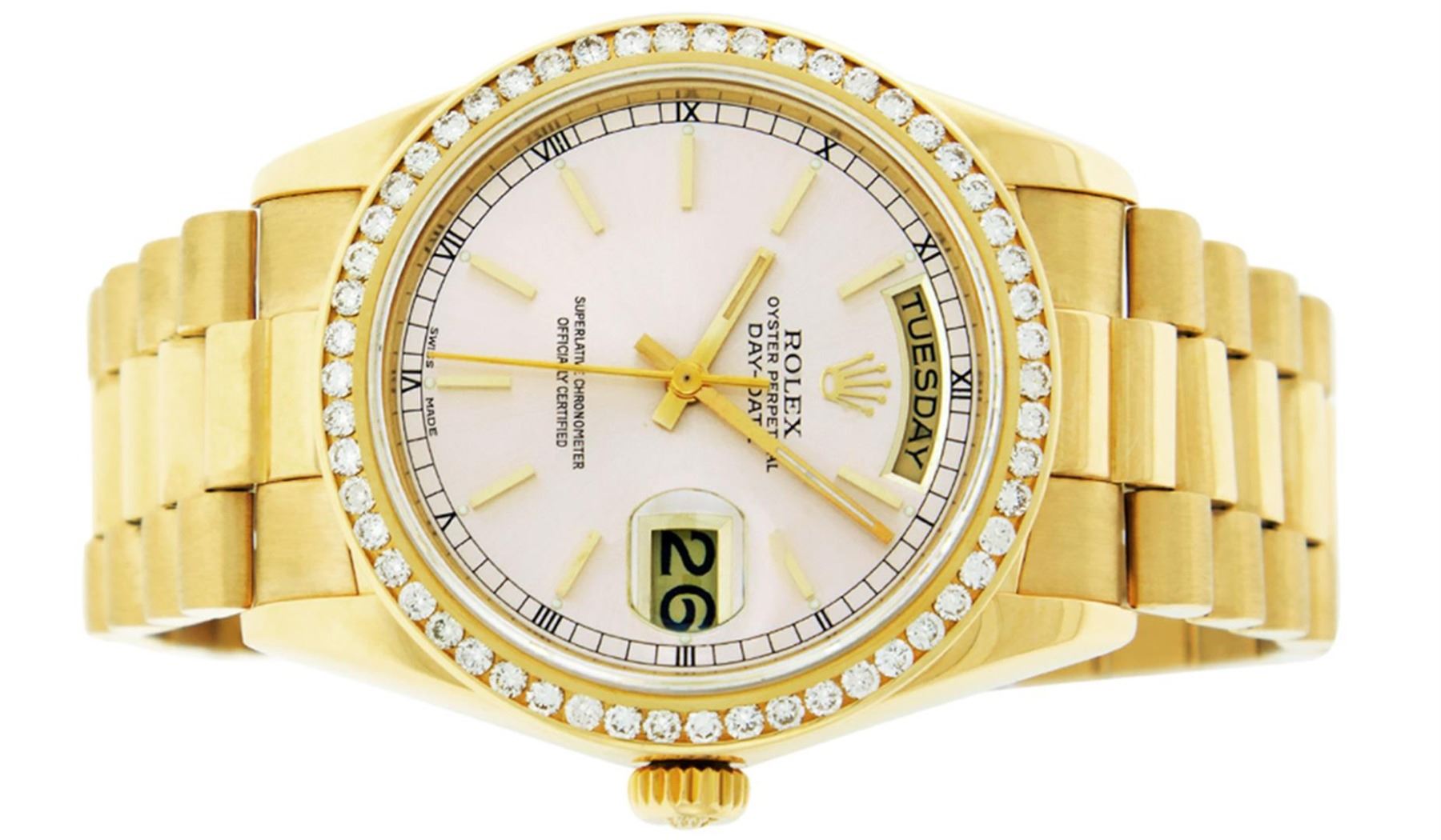 One Mens Rolex Day Date 18K Yellow Gold President Polished, Serviced & Electronically Tested, 18K Yellow Gold Case: 36mm, 18K Yellow Gold Crown, Custom Bezel: New 18K Yellow Gold Channel Set Diamond Bezel, Diamond Count: 54 Diamonds On Bezel Bezel. Total Bezel Weight 1.0 Carat, Clarity: SI-VS, Color: G to H. Custom Crystal: New Scratch Resistant Synthetic Sapphire Cyclops Lens. Custom Hands: New Luminescent Hands. Movement: Automatic Winding Movement Caliber 3055. Dial: Champagne Index With Square Roman Track. Date Window: 3 O'Clock Position Date Display, Day Window: 12 O'Clock Position Date Display. Quickset, Model: Day Date President. Condition: G-6 Extra Fine The Watch Is In Very Good Condition Free Of All Scratches And Dents. Bracelet: 18K Yellow Gold President. Bright Polish. 7.0 Inch Length, Standard Hidden President Clasp President Band, With Rolex Logo. This Watch Comes With An Appraisal & Rolex Box.