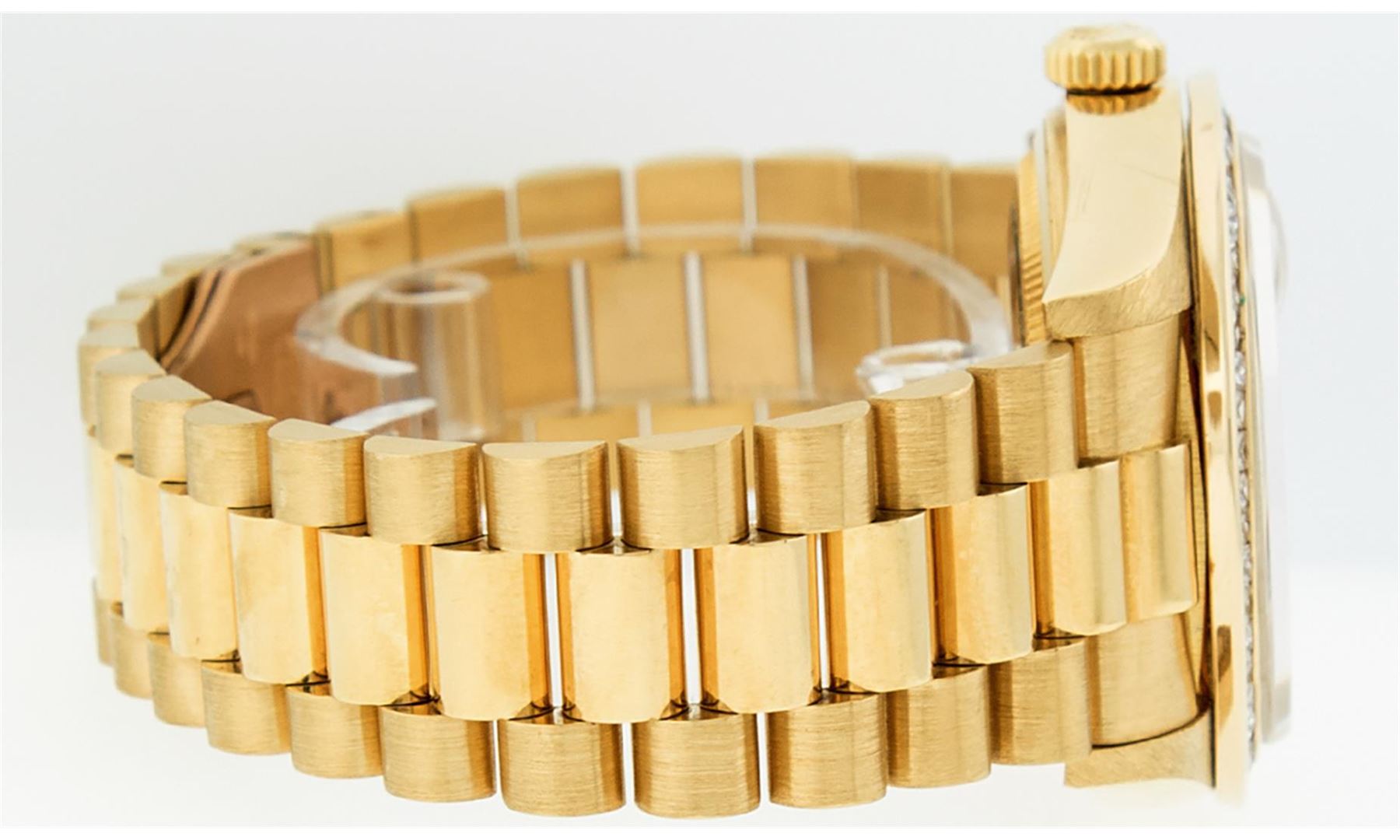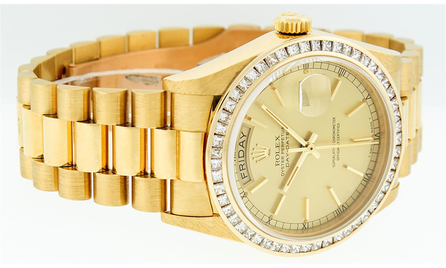 One Mens Pre Owned Rolex Day Date 18K Yellow Gold President Polished, Serviced & Electronically Tested, Rolex 18K Yellow Gold Case: 36mm, Rolex 18K Yellow Gold Crown, Custom Bezel: New 14K Yellow Gold Princess Cut Diamond Bezel, Diamond Count: 53 Diamonds On Bezel. Total Weight 2.75 Carat, Clarity: SI-VS, Color: G to H. Custom Crystal: New Scratch Resistant Synthetic Sapphire Cyclops Lens. Custom Hands: New Luminescent Hands. Rolex Movement: Automatic Winding Movement Caliber 3055. Rolex Dial: Champagne Index With Square Roman Track. Date Window: 3 O'Clock Position Date Display, Day Window: 12 O'Clock Position Date Display. Quickset, Model: Day Date President. Condition: G-6 Extra Fine The Watch Is In Very Good Condition Free Of All Scratches And Dents. Rolex Bracelet: 18K Yellow Gold President. Bright Polish. 7.0 Inch Length, Standard Hidden President Clasp President Band, With Rolex Logo. This Watch Comes With a Rolex Box.