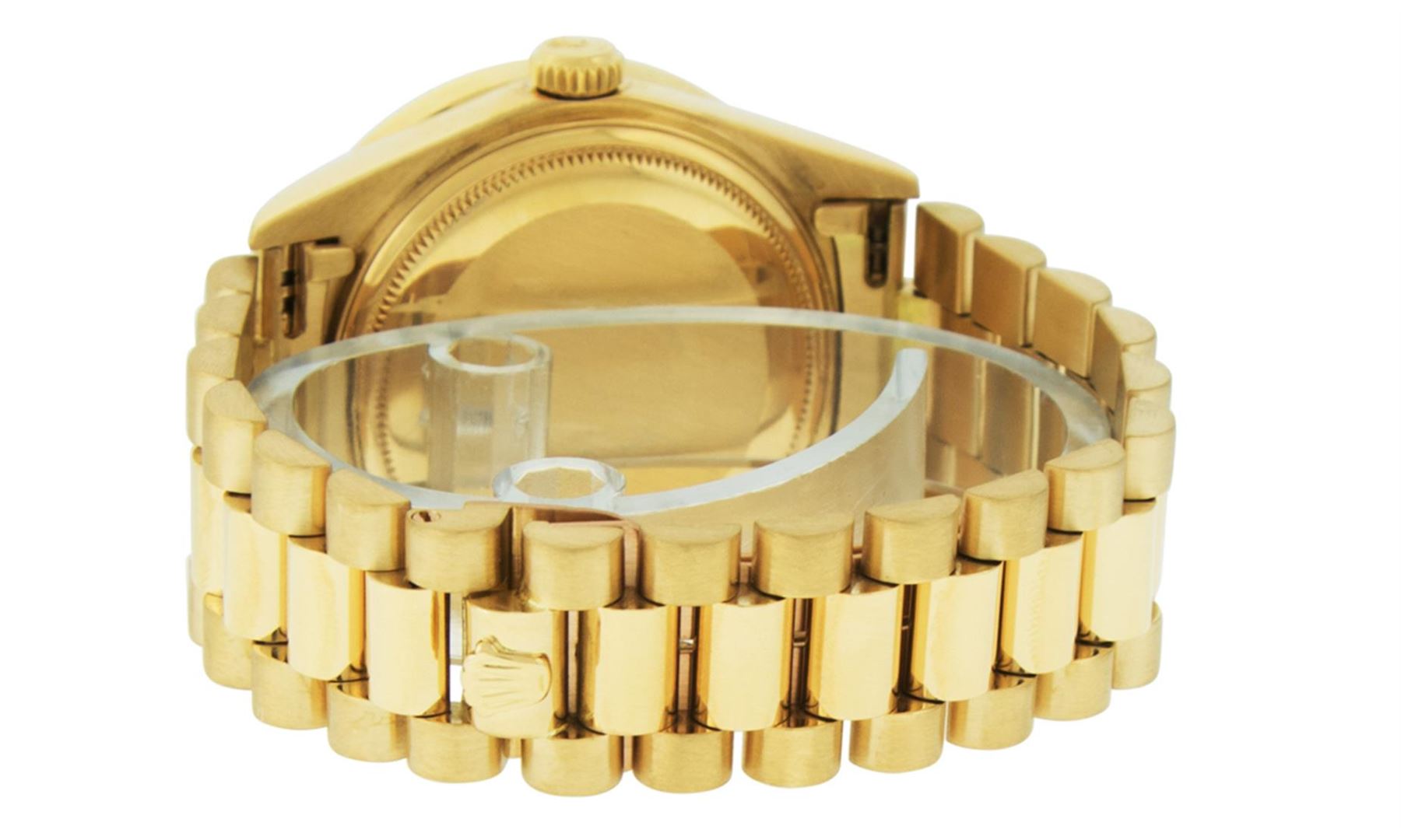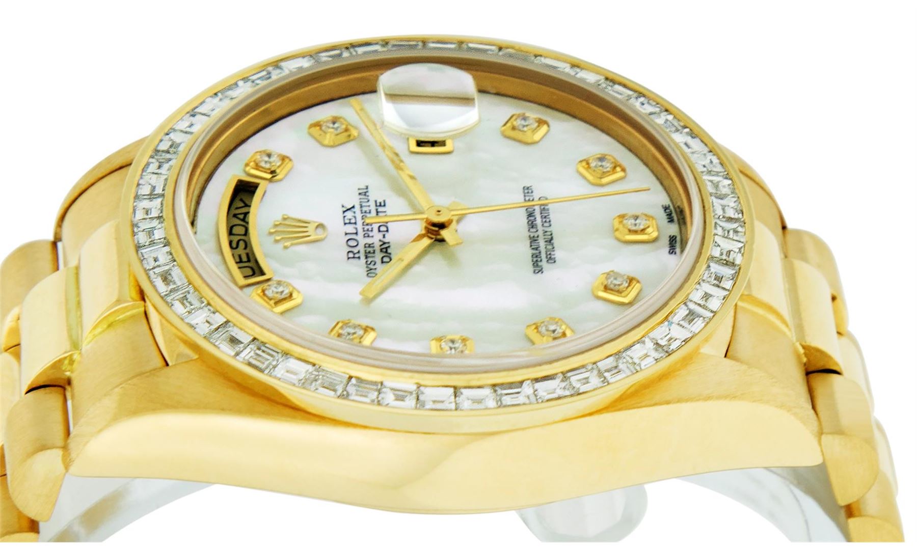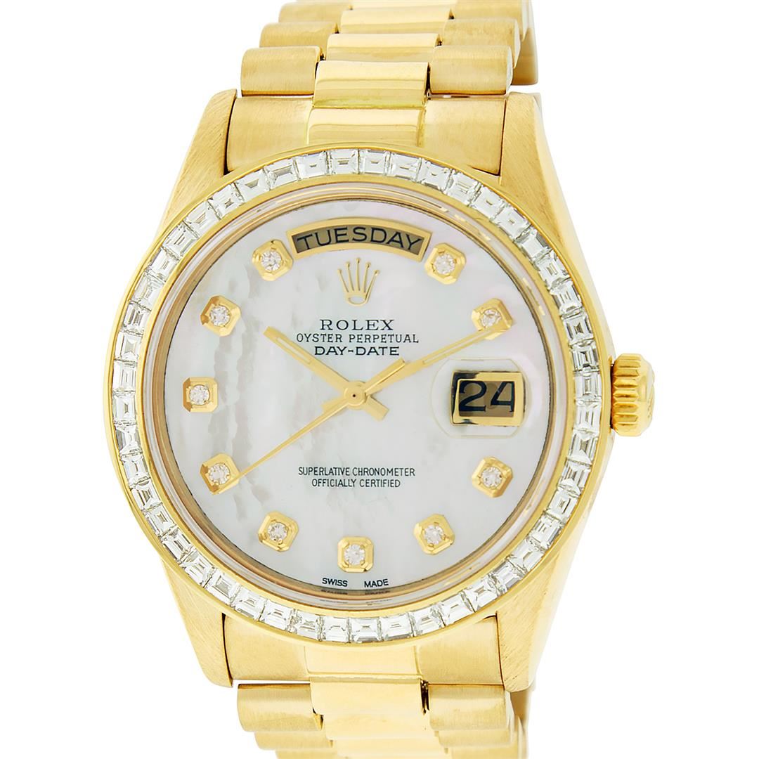 One Mens Rolex Day Date 18K Yellow Gold President Polished, Serviced & Electronically Tested, 18K Yellow Gold Case: 36mm, 18K Yellow Gold Crown, Custom Bezel: New 18K Yellow Gold Baguette Diamond Bezel, Diamond Count: 48 Diamonds On Bezel. Total Weight 3.0 Carat, Clarity: SI-VS, Color: G to H. Custom Crystal: New Scratch Resistant Synthetic Sapphire Cyclops Lens. Custom Hands: New Luminescent Hands. Movement: Automatic Winding Movement Caliber 3055. Custom Dial: Single Cut Mother Of Pearl Diamond Dial, Diamond Count: 10 Diamonds On Dial, Color: G to H, Clarity:VS. Date Window: 3 O'Clock Position Date Display, Day Window: 12 O'Clock Position Date Display. Quickset, Model: Day Date President. Condition: G-6 Extra Fine The Watch Is In Very Good Condition Free Of All Scratches And Dents. Bracelet: 18K Yellow Gold President. Bright Polish. 7.0 Inch Length, Standard Hidden President Clasp President Band, With Rolex Logo. This Watch Comes With a Rolex Box, Watch Winder, & Appraisal.