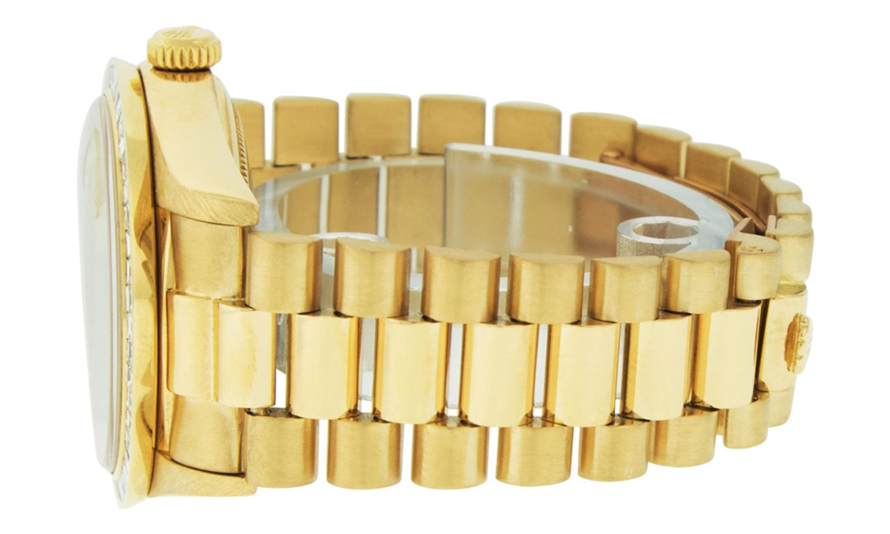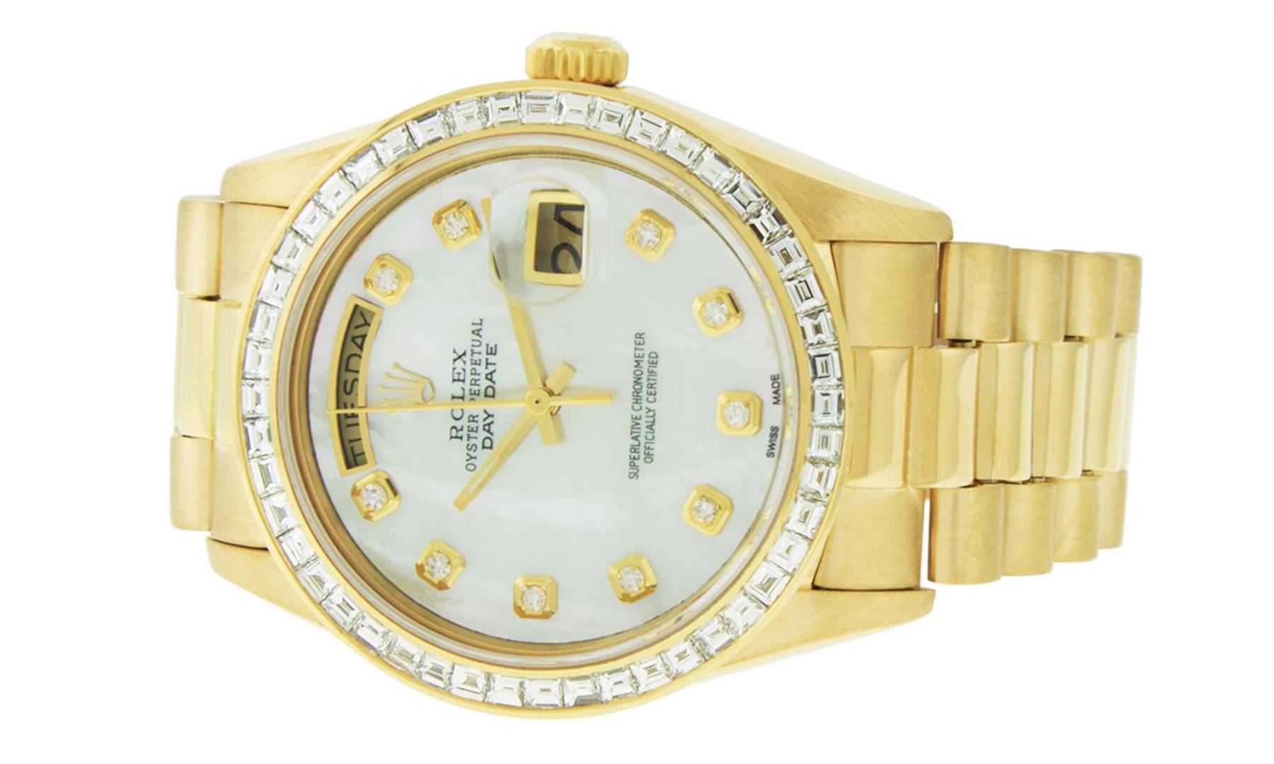 One Mens Rolex Day Date 18K Yellow Gold President Polished, Serviced & Electronically Tested, 18K Yellow Gold Case: 36mm, 18K Yellow Gold Crown, Custom Bezel: New 18K Yellow Gold Baguette Diamond Bezel, Diamond Count: 48 Diamonds On Bezel. Total Weight 3.0 Carat, Clarity: SI-VS, Color: G to H. Custom Crystal: New Scratch Resistant Synthetic Sapphire Cyclops Lens. Custom Hands: New Luminescent Hands. Movement: Automatic Winding Movement Caliber 3055. Custom Dial: Single Cut Mother Of Pearl Diamond Dial, Diamond Count: 10 Diamonds On Dial, Color: G to H, Clarity:VS. Date Window: 3 O'Clock Position Date Display, Day Window: 12 O'Clock Position Date Display. Quickset, Model: Day Date President. Condition: G-6 Extra Fine The Watch Is In Very Good Condition Free Of All Scratches And Dents. Bracelet: 18K Yellow Gold President. Bright Polish. 7.0 Inch Length, Standard Hidden President Clasp President Band, With Rolex Logo. This Watch Comes With a Rolex Box, Watch Winder, & Appraisal.