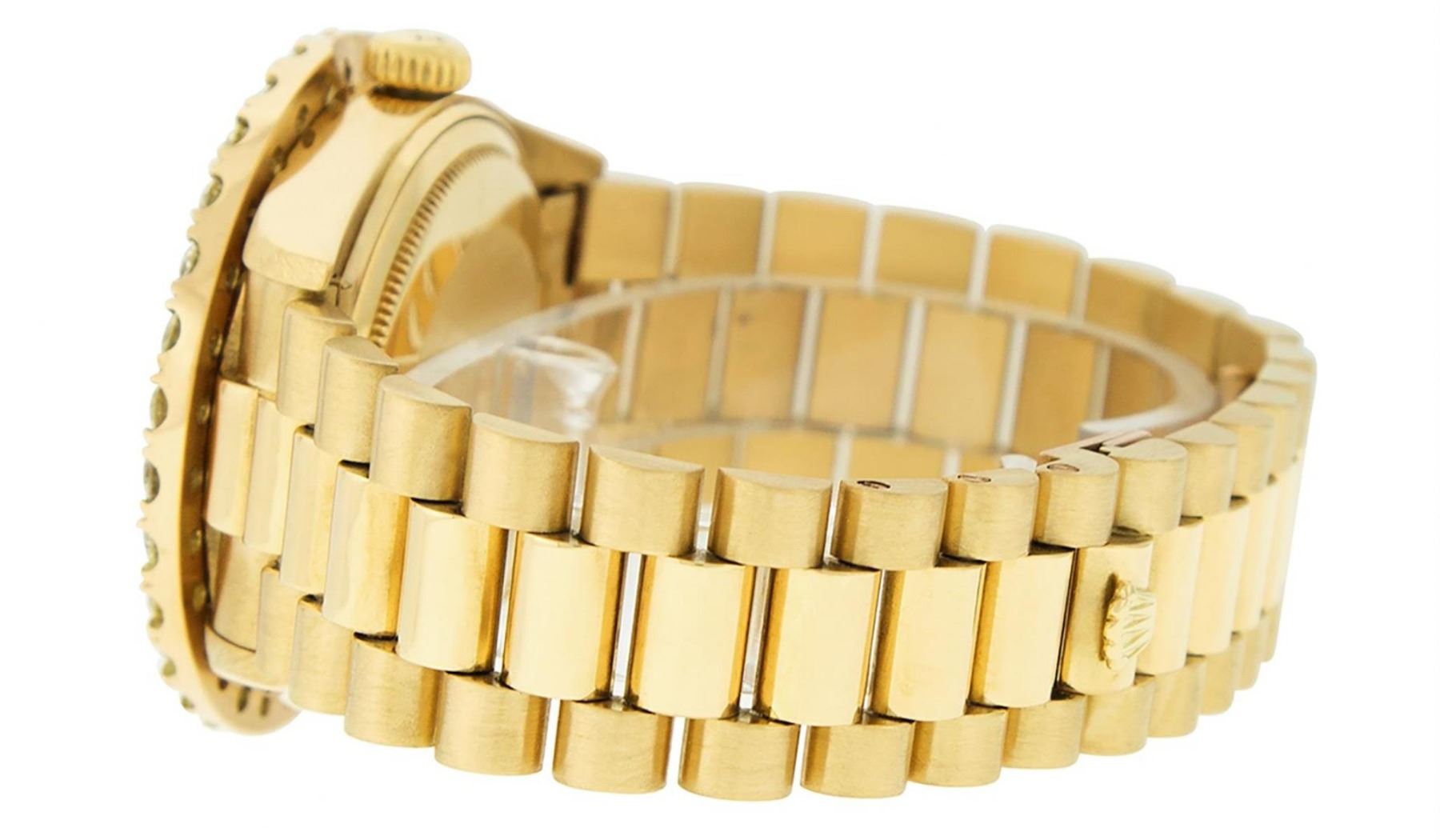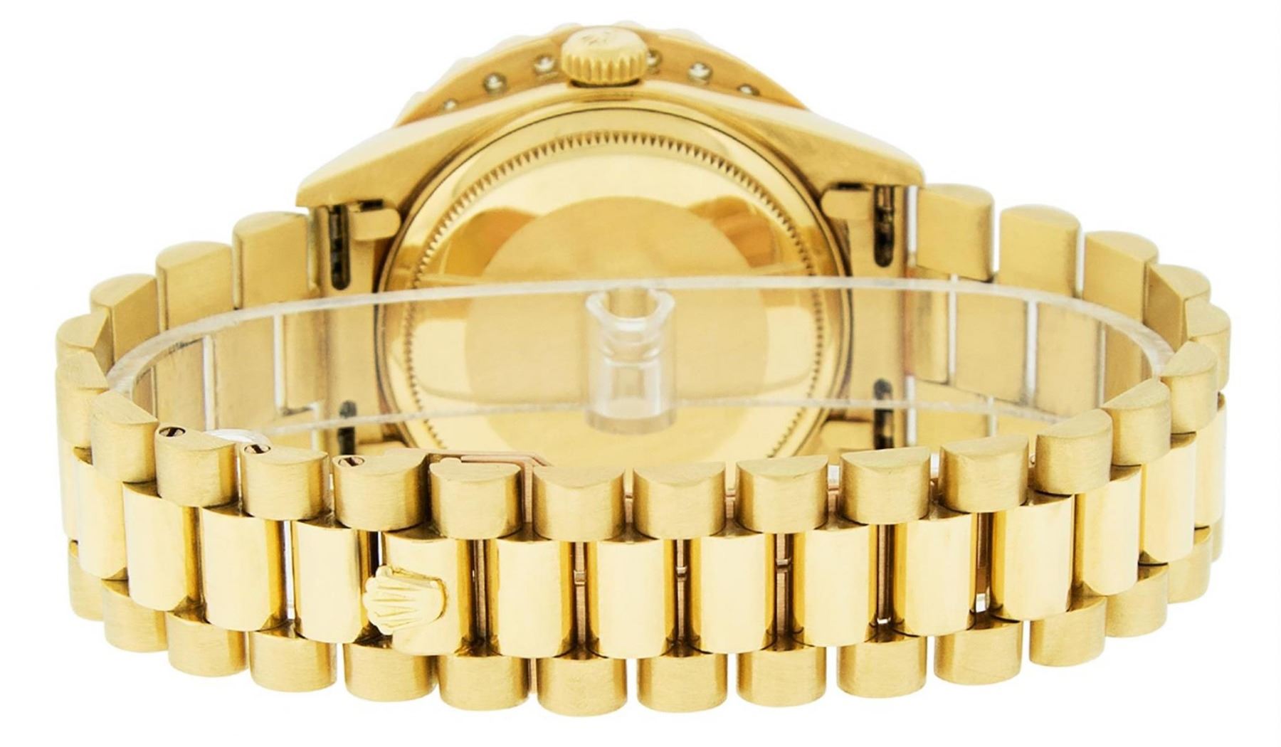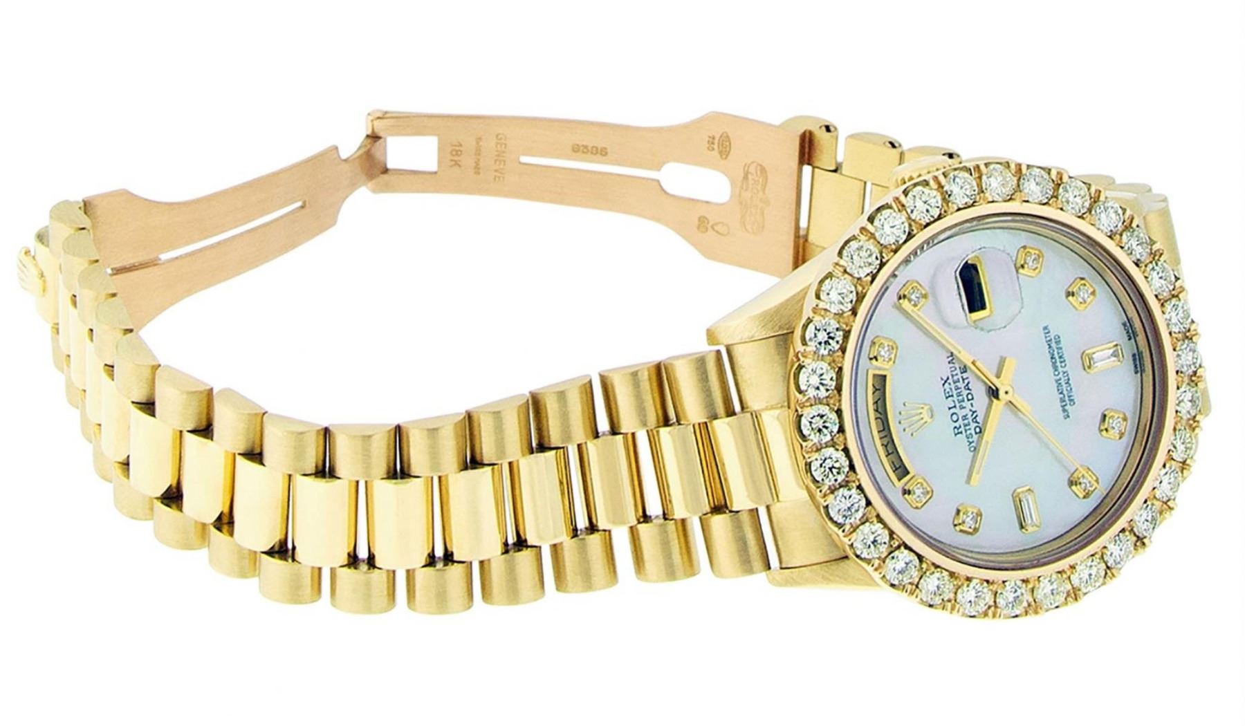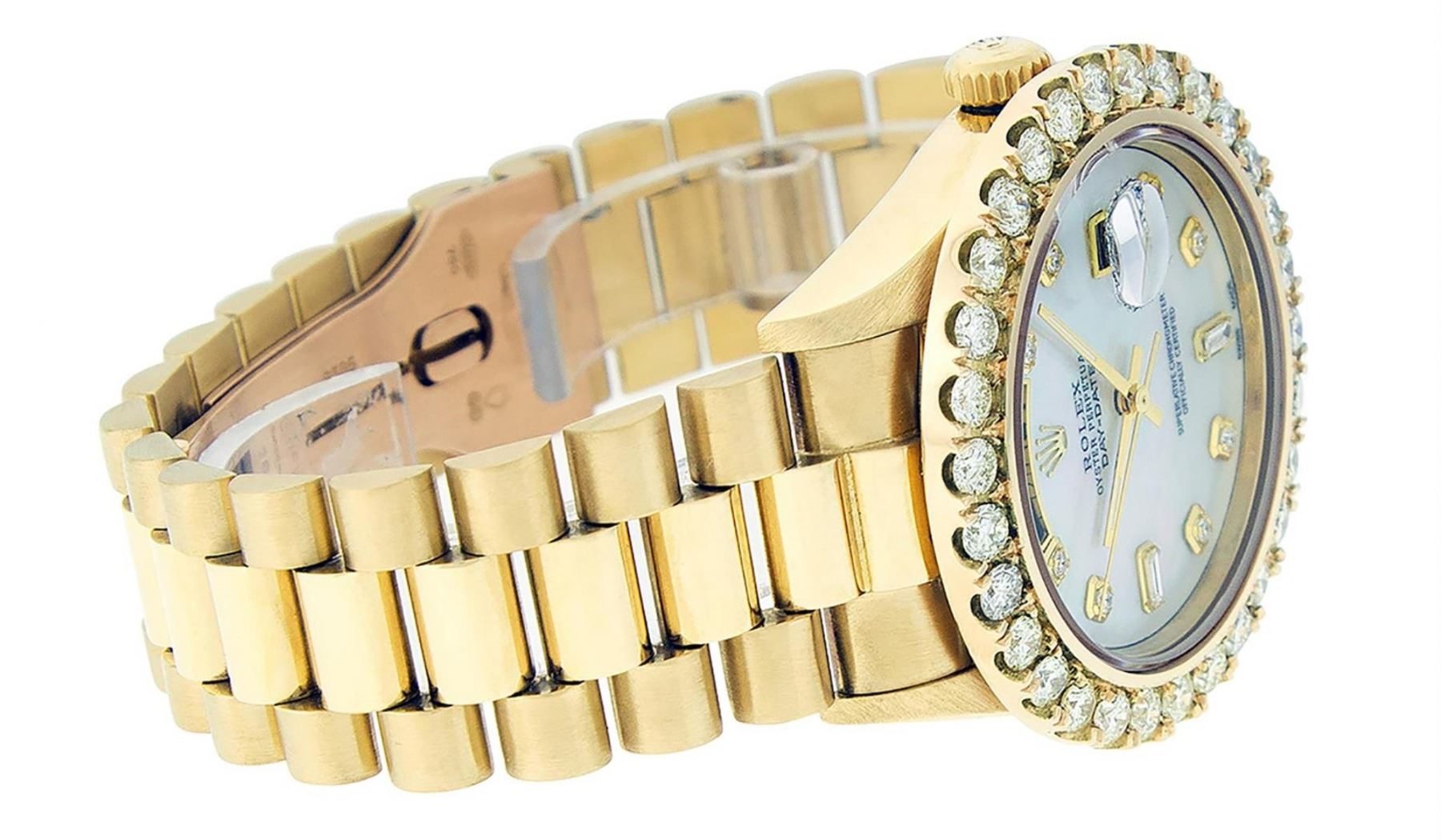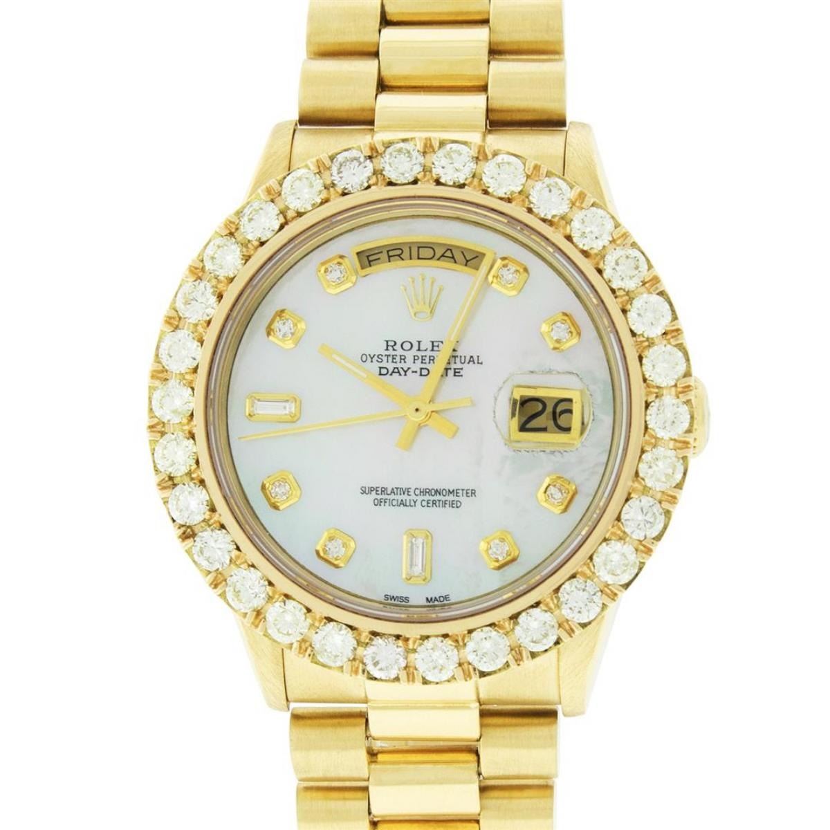One Mens Rolex Day Date 18K Yellow Gold President Polished, Serviced & Electronically Tested, 18K Yellow Gold Case: 36mm, 18K Yellow Gold Crown, Custom Bezel: New 18K 4ctw Yellow Gold Beadset Diamond Bezel, Diamond Count: 30 Diamonds On Bezel. Total Weight 4.0 Carat, Clarity: SI-VS, Color: G to H. Custom Crystal: New Scratch Resistant Synthetic Sapphire Cyclops Lens. Custom Hands: New Luminescent Hands. Movement: Automatic Winding Movement Caliber 3055. Custom Dial: Single Cut Mother Of Pearl Diamond Dial, Diamond Count: 10 Diamonds On Dial, Color: G to H, Clarity:VS. Date Window: 3 O'Clock Position Date Display, Day Window: 12 O'Clock Position Date Display. Quickset, Model: Day Date President. Condition: G-6 Extra Fine The Watch Is In Very Good Condition Free Of All Scratches And Dents. Bracelet: 18K Yellow Gold President. Bright Polish. 7.0 Inch Length, Standard Hidden President Clasp President Band, With Rolex Logo. This Watch Comes With a Rolex Box, Watch Winder, & Appraisal.