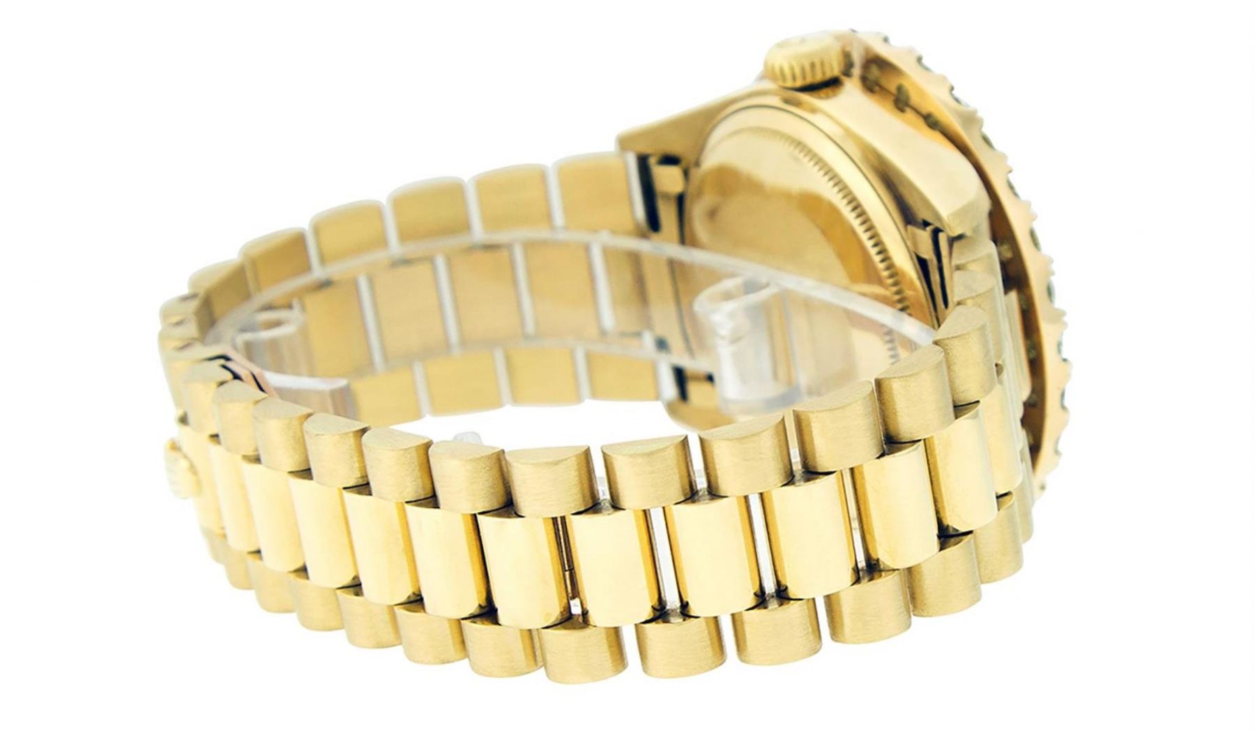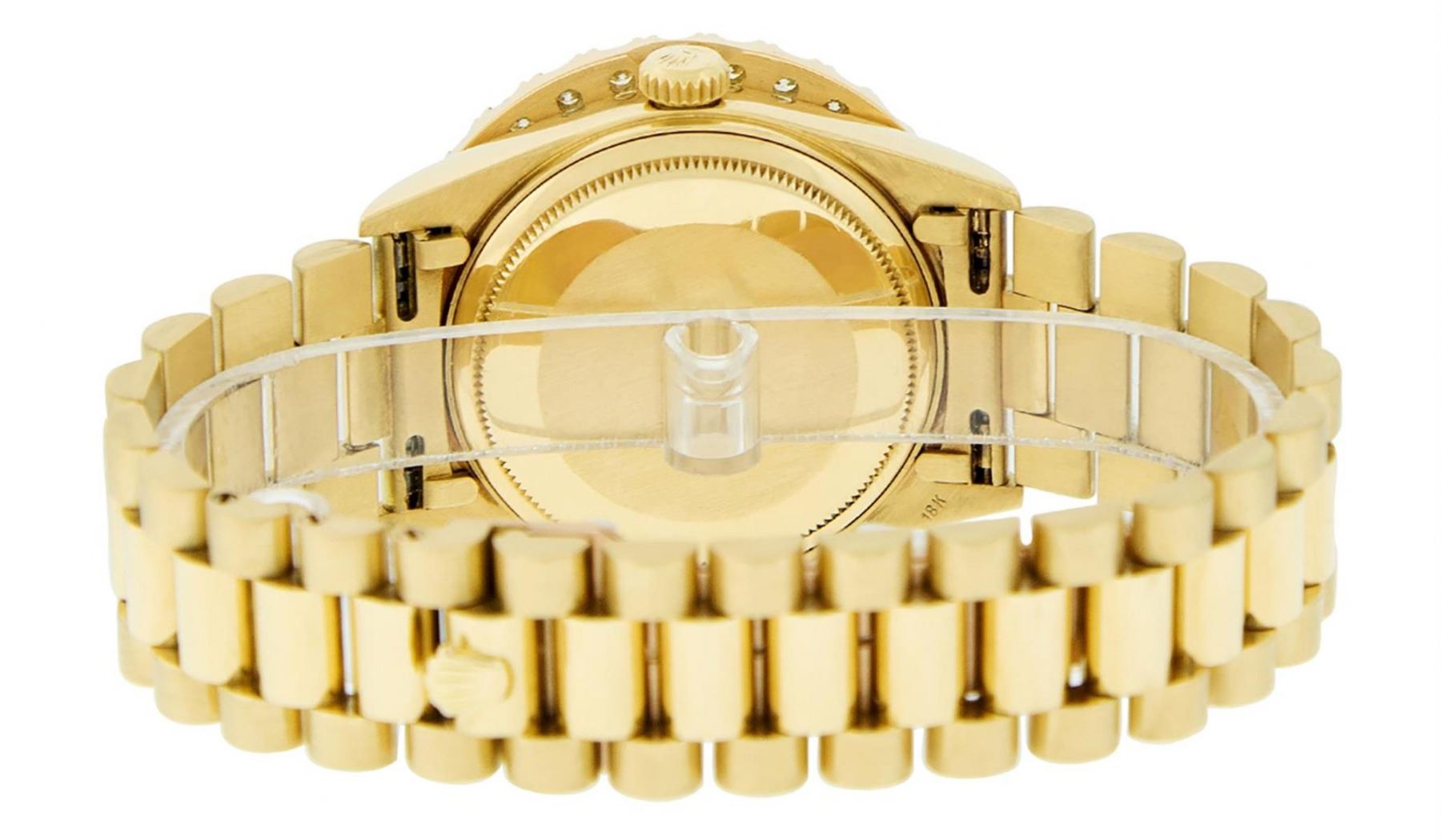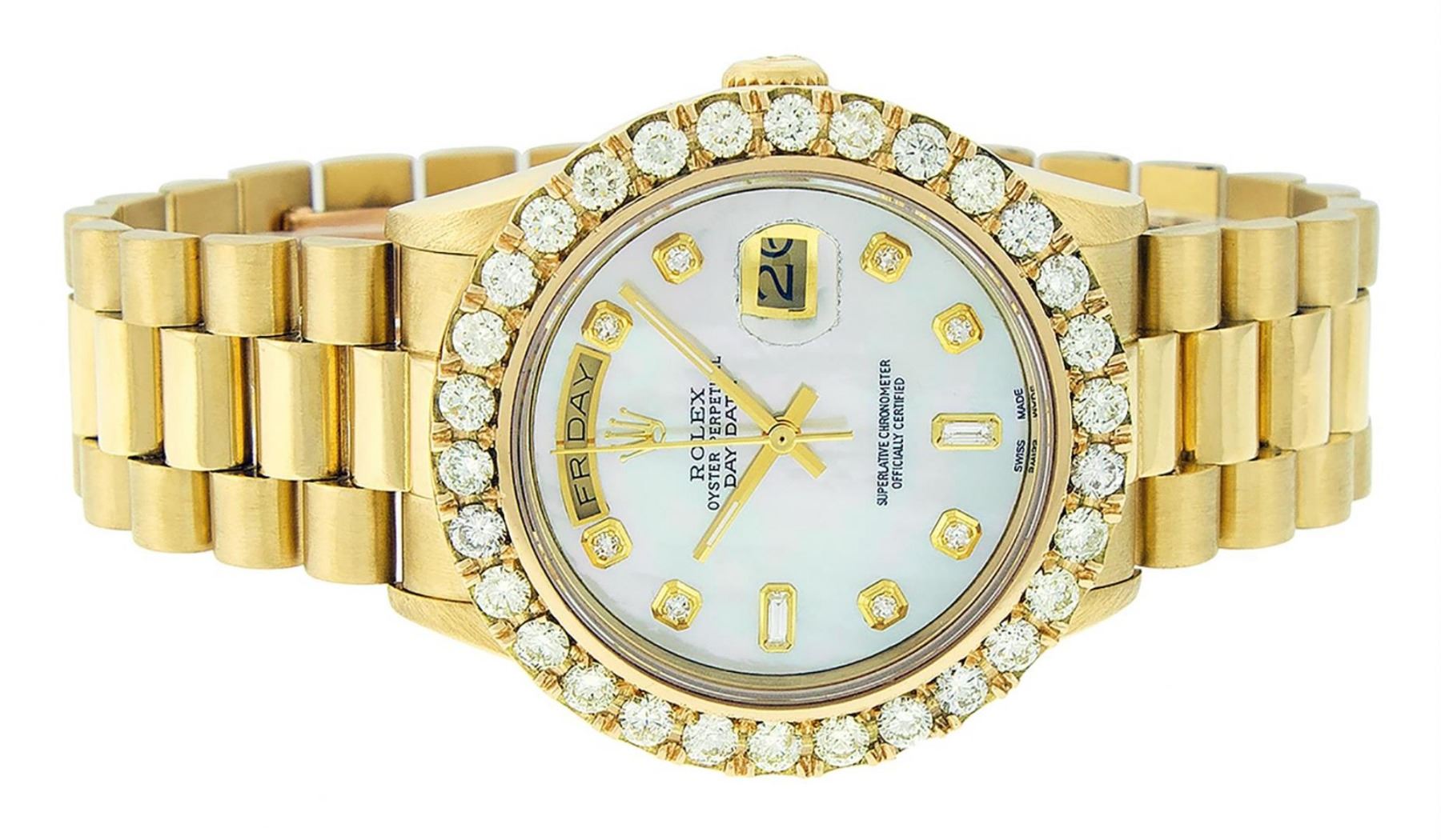 One Mens Rolex Day Date 18K Yellow Gold President Polished, Serviced & Electronically Tested, 18K Yellow Gold Case: 36mm, 18K Yellow Gold Crown, Custom Bezel: New 18K 4ctw Yellow Gold Beadset Diamond Bezel, Diamond Count: 30 Diamonds On Bezel. Total Weight 4.0 Carat, Clarity: SI-VS, Color: G to H. Custom Crystal: New Scratch Resistant Synthetic Sapphire Cyclops Lens. Custom Hands: New Luminescent Hands. Movement: Automatic Winding Movement Caliber 3055. Custom Dial: Single Cut Mother Of Pearl Diamond Dial, Diamond Count: 10 Diamonds On Dial, Color: G to H, Clarity:VS. Date Window: 3 O'Clock Position Date Display, Day Window: 12 O'Clock Position Date Display. Quickset, Model: Day Date President. Condition: G-6 Extra Fine The Watch Is In Very Good Condition Free Of All Scratches And Dents. Bracelet: 18K Yellow Gold President. Bright Polish. 7.0 Inch Length, Standard Hidden President Clasp President Band, With Rolex Logo. This Watch Comes With a Rolex Box, Watch Winder, & Appraisal.