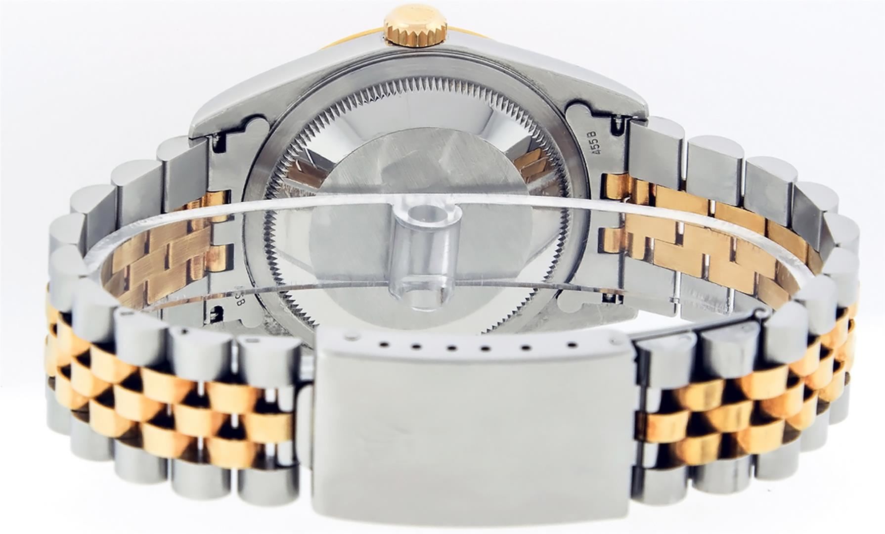 One Mens Rolex Two Tone 18K Yellow Gold And Stainless Steel Datejust Polished, Serviced & Electronically Tested, Yellow Gold & Stainless Steel Case: 36mm, 18K Yellow Gold Crown, Rolex Bezel: 18K Yellow Gold Fluted Bezel. Crystal: Sapphire With Magnified Date Window. Hands: Luminescent Hands. Rolex Movement: Automatic Winding Movement 3135. Rolex Dial: Champagne Dial With Index Hour Markers and Track With Lumi Dots. Date Window: 3 O'Clock Position Date Display, Quickset, Model: Datejust. Condition: G-6 Extra Fine. Rolex Bracelet: Two Tone 18K Yellow Gold & Stainless Steel Jubilee Band. Bright Polish. 7.0 Inch Length, Adjustable. Standard Clasp, With Rolex Logo. This Watch Has Been Serviced Time Tested And Is In Excellent Condition It Is Free Of All Scratches And Dents.