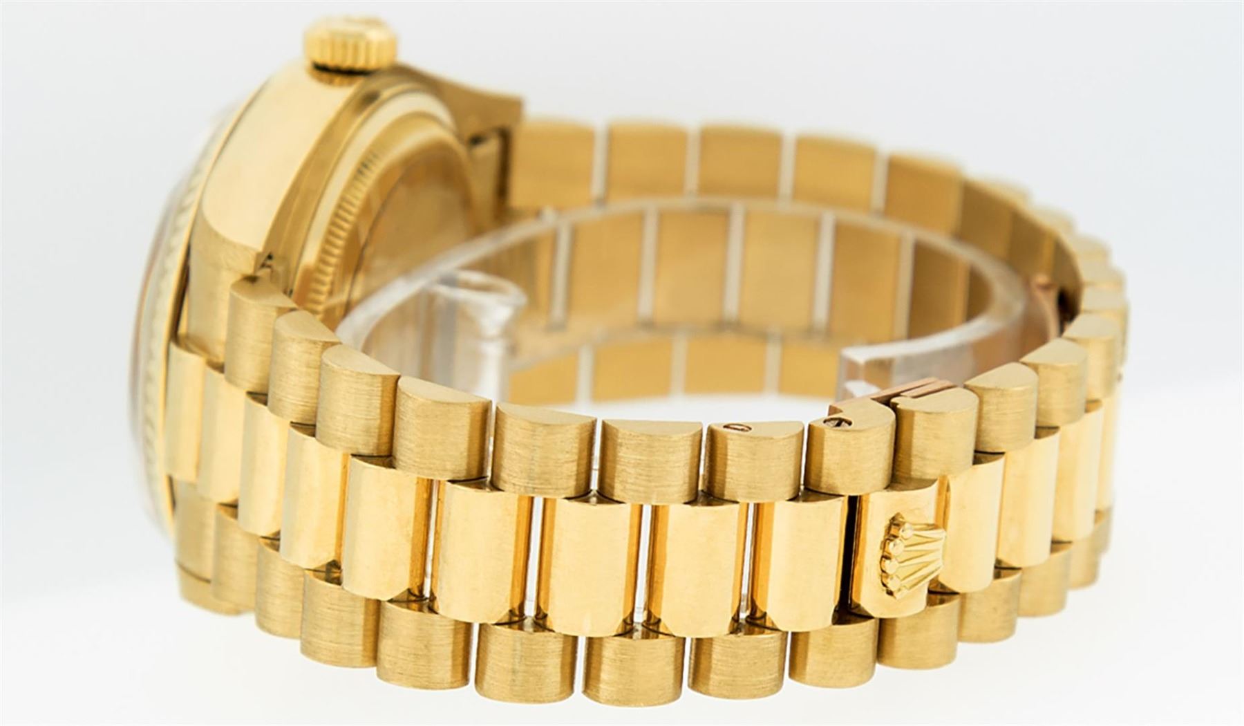 One Mens Quickset Rolex Day Date 18K Yellow Gold President Polished, Serviced & Electronically Tested, 18K Yellow Gold Case: 36mm, 18K Yellow Gold Crown, Bezel: 18K Yellow Gold Fluted Bezel. Custom Crystal: New Scratch Resistant Synthetic Sapphire Cyclops Lens. Custom Hands: New Luminescent Hands. Movement: Automatic Quickset Winding Movement Caliber 3055. Custom Dial: Refinished Blue Vignette Single Cut Diamond Dial With Roman Track. Date Window: 3 O'Clock Position, Day Display: 12 O'Clock Position, Single Quickset, Model: Day Date President. Condition: G-6 Extra Fine. Bracelet: 18K Yellow Gold President Band With Hidden Clasp, Bright & Satin Polish. 6.75 Inch Length, Standard President Clasp, With Rolex Logo. This Watch Comes With A Rolex Box.