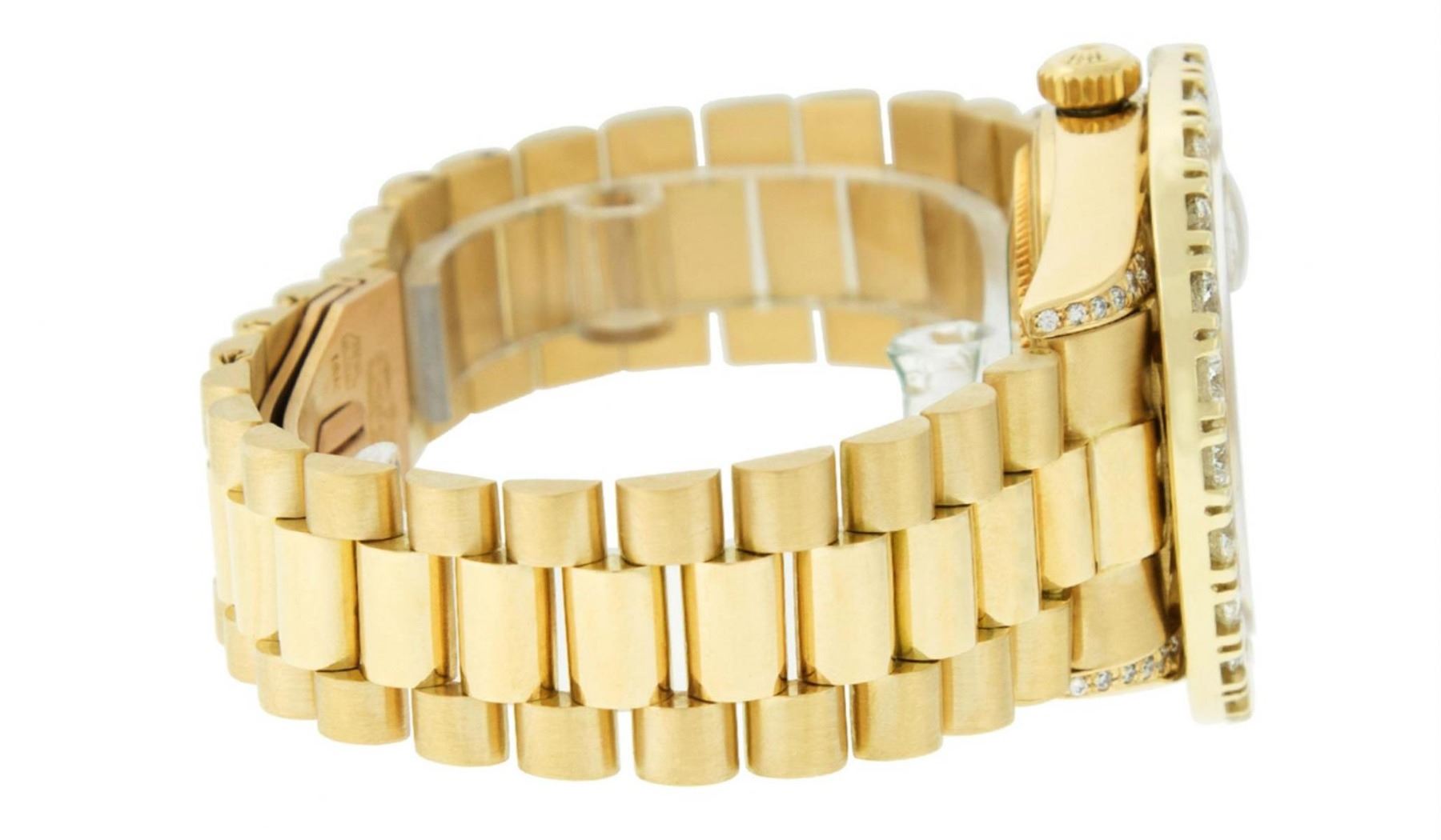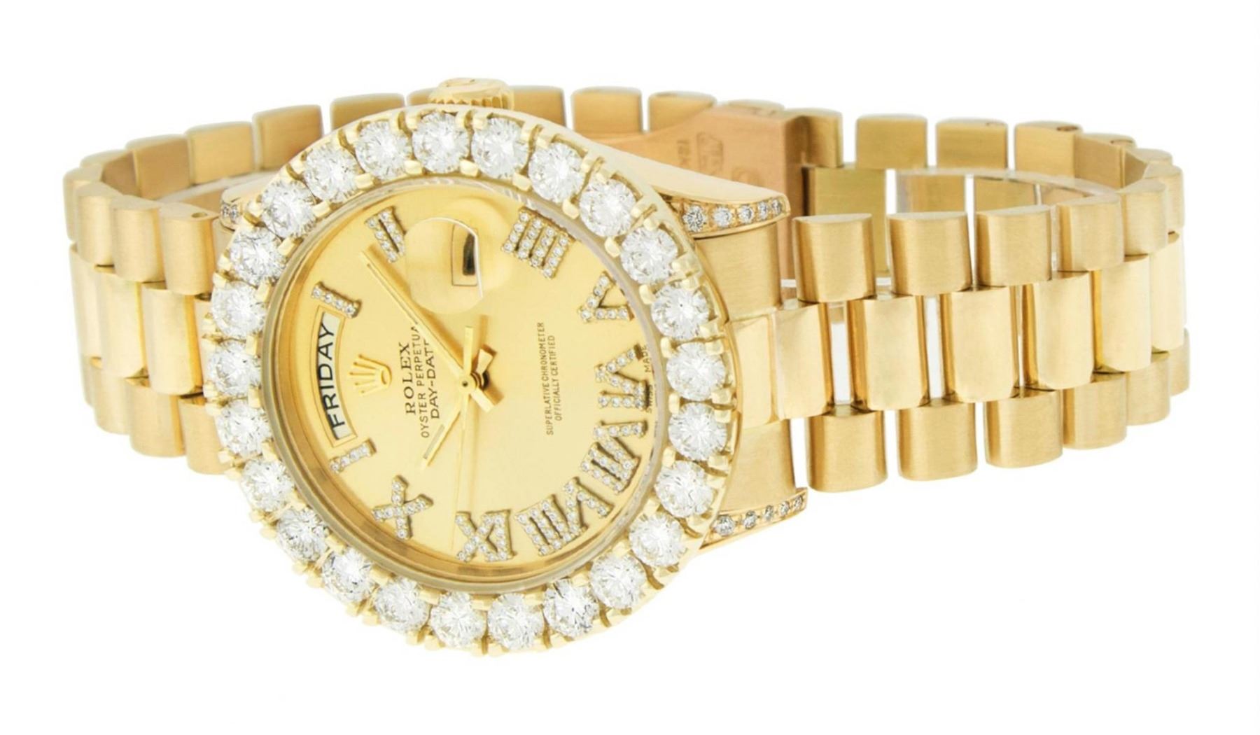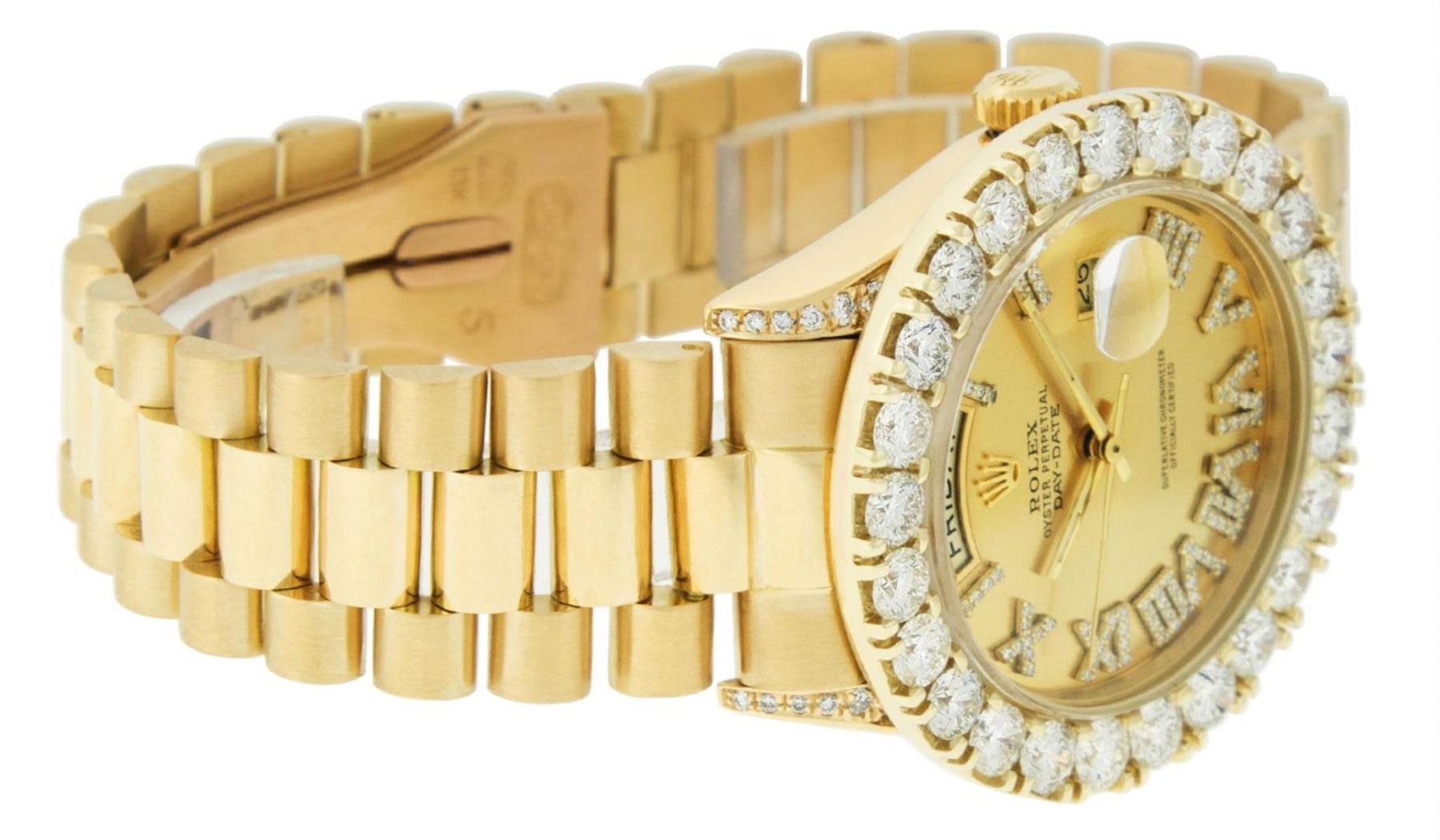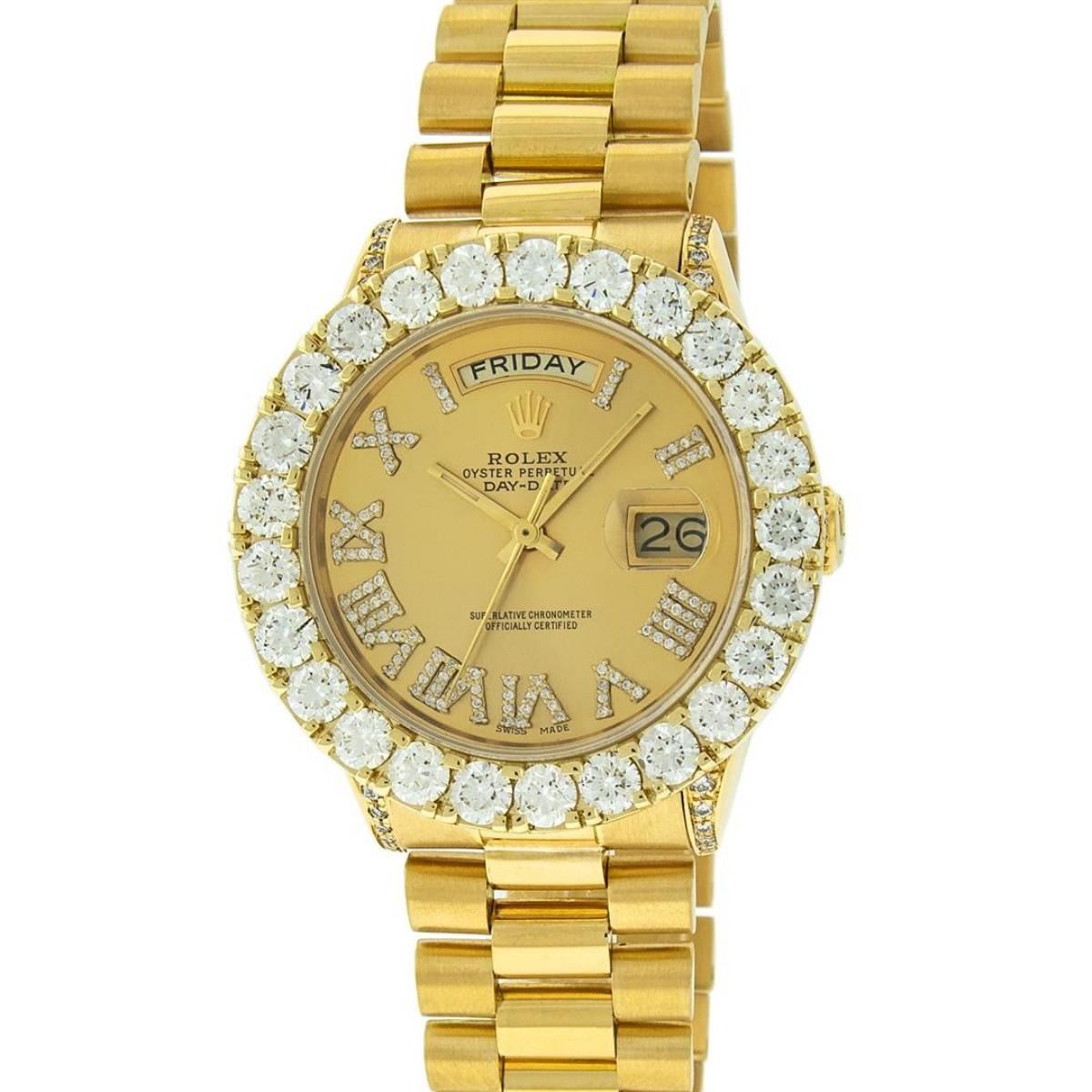 One Mens Rolex Day Date 18K Yellow Gold President Polished, Serviced & Electronically Tested, 18K Yellow Gold Case: 36mm, Custom Diamond Lugs: 28 Diamonds In Lugs, Color: G to H, Clarity: SI-VS. 18K Yellow Gold Crown, Custom Bezel: 18K Yellow Gold 6.0ctw Beadset Box Diamond Bezel, Diamond Count: 25 Diamonds On Bezel. Total Bezel Weight 6.0 Carat, Clarity: SI-VS, Color: G to H. Custom Crystal: New Synthetic Sapphire Cyclops Lens. Custom Hands: New Luminescent Hands. Movement: Automatic Winding Movement Caliber 3055. Custom Dial: Refinished Champagne Roman Diamond Dial, Color: G to H, Clarity: SI-VS. Date Window: 3 O'Clock Position Date Display, Day Window: 12 O'Clock Position Date Display. Quickset, Model: Day Date President. Condition: G-6 Extra Fine The Watch Is In Very Good Condition Free Of All Scratches And Dents. Bracelet: 18K Yellow Gold President Band. Bright Polish. 7.0 Inch Length, Standard Hidden President Clasp President Band, With Rolex Logo. This Watch Comes With A Rolex Box, Appraisal And Watch Winder.