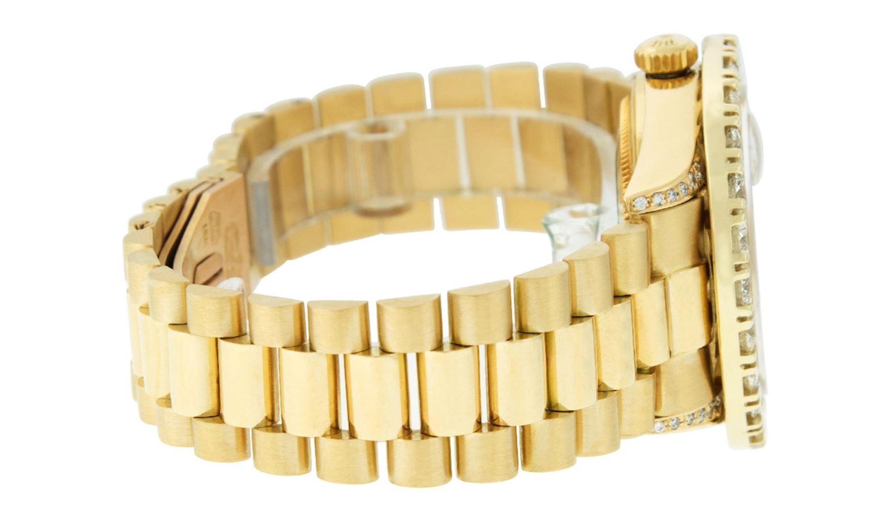 One Mens Rolex Day Date 18K Yellow Gold President Polished, Serviced & Electronically Tested, 18K Yellow Gold Case: 36mm, Custom Diamond Lugs: 28 Diamonds In Lugs, Color: G to H, Clarity: SI-VS. 18K Yellow Gold Crown, Custom Bezel: 18K Yellow Gold 6.0ctw Beadset Box Diamond Bezel, Diamond Count: 25 Diamonds On Bezel. Total Bezel Weight 6.0 Carat, Clarity: SI-VS, Color: G to H. Custom Crystal: New Scratch Resistant Synthetic Sapphire Cyclops Lens. Custom Hands: New Luminescent Hands. Movement: Automatic Winding Movement Caliber 3055. Custom Dial: Refinished Champagne Roman Diamond Dial, Color: G to H, Clarity: SI-VS. Date Window: 3 O'Clock Position Date Display, Day Window: 12 O'Clock Position Date Display. Quickset, Model: Day Date President. Condition: G-6 Extra Fine The Watch Is In Very Good Condition Free Of All Scratches And Dents. Bracelet: 18K Yellow Gold President Band. Bright Polish. 7.0 Inch Length, Standard Hidden President Clasp President Band, With Rolex Logo. This Watch Comes With A Rolex Box, Appraisal And Watch Winder.