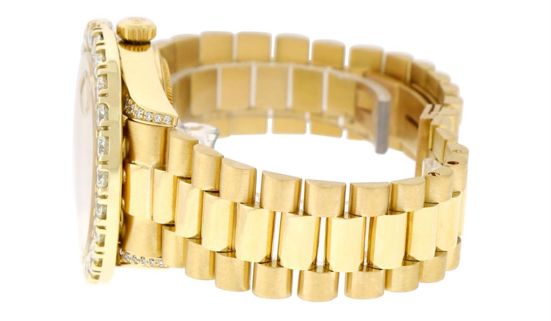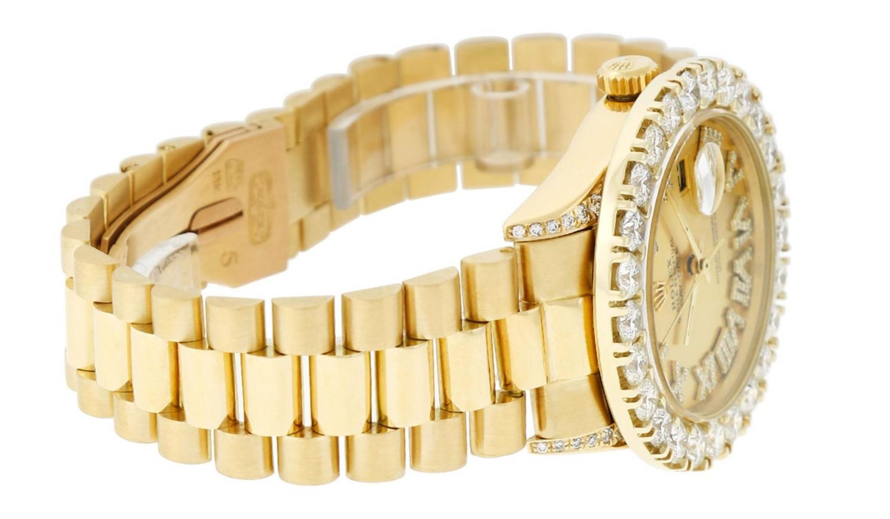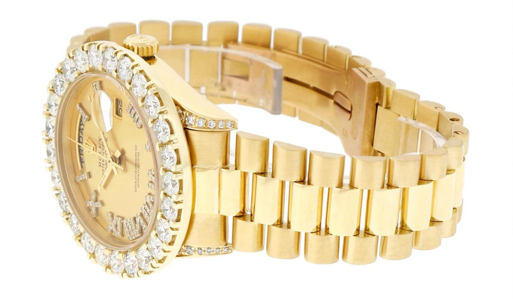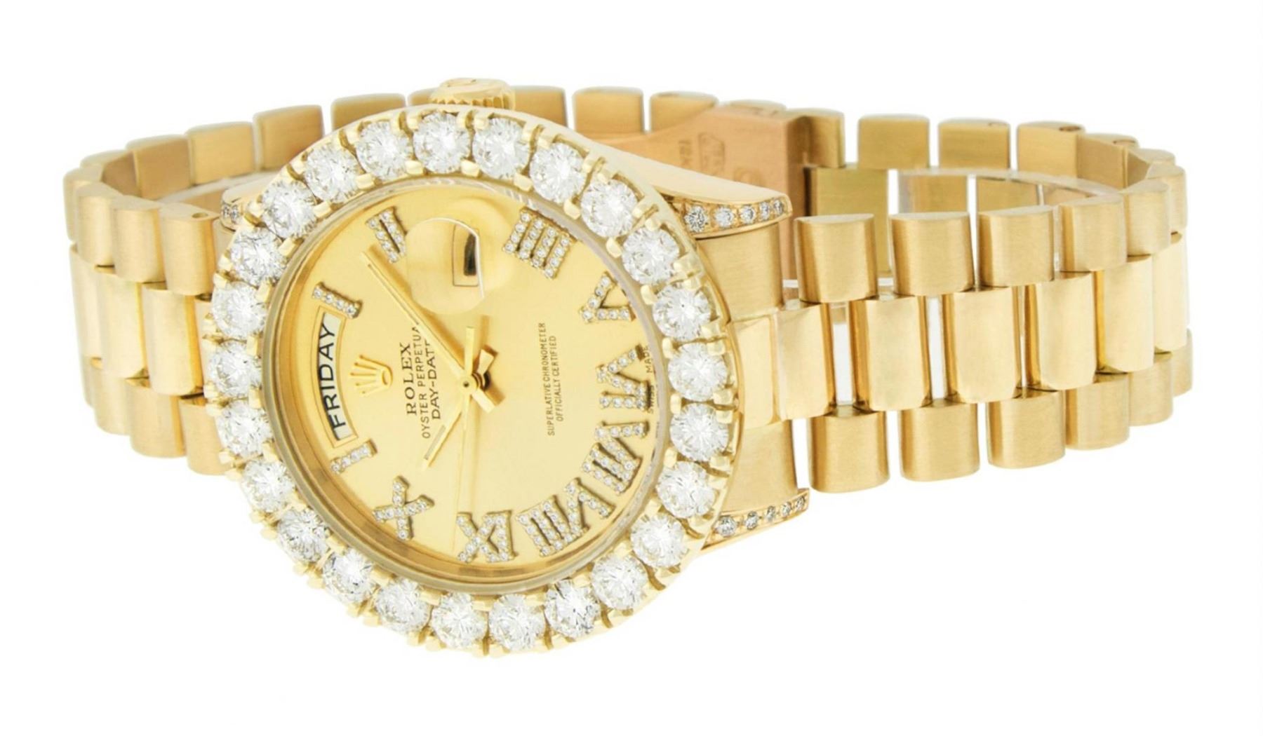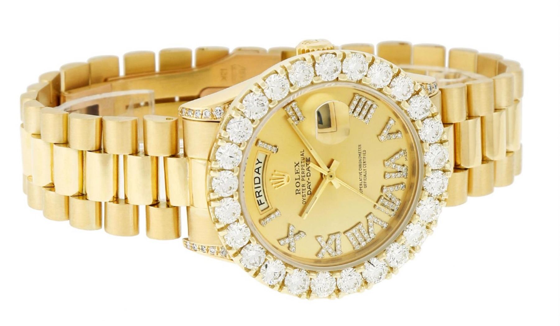 One Mens Rolex Day Date 18K Yellow Gold President Polished, Serviced & Electronically Tested, 18K Yellow Gold Case: 36mm, Custom Diamond Lugs: 28 Diamonds In Lugs, Color: G to H, Clarity: SI-VS. 18K Yellow Gold Crown, Custom Bezel: 18K Yellow Gold 6.0ctw Beadset Box Diamond Bezel, Diamond Count: 25 Diamonds On Bezel. Total Bezel Weight 6.0 Carat, Clarity: SI-VS, Color: G to H. Custom Crystal: New Scratch Resistant Synthetic Sapphire Cyclops Lens. Custom Hands: New Luminescent Hands. Movement: Automatic Winding Movement Caliber 3055. Custom Dial: Refinished Champagne Roman Diamond Dial, Color: G to H, Clarity: SI-VS. Date Window: 3 O'Clock Position Date Display, Day Window: 12 O'Clock Position Date Display. Quickset, Model: Day Date President. Condition: G-6 Extra Fine The Watch Is In Very Good Condition Free Of All Scratches And Dents. Bracelet: 18K Yellow Gold President Band. Bright Polish. 7.0 Inch Length, Standard Hidden President Clasp President Band, With Rolex Logo. This Watch Comes With A Rolex Box, Appraisal And Watch Winder.