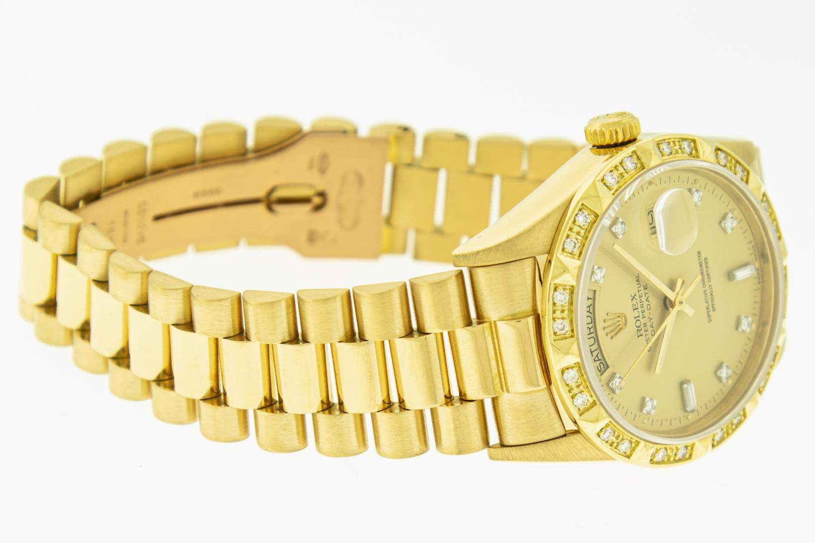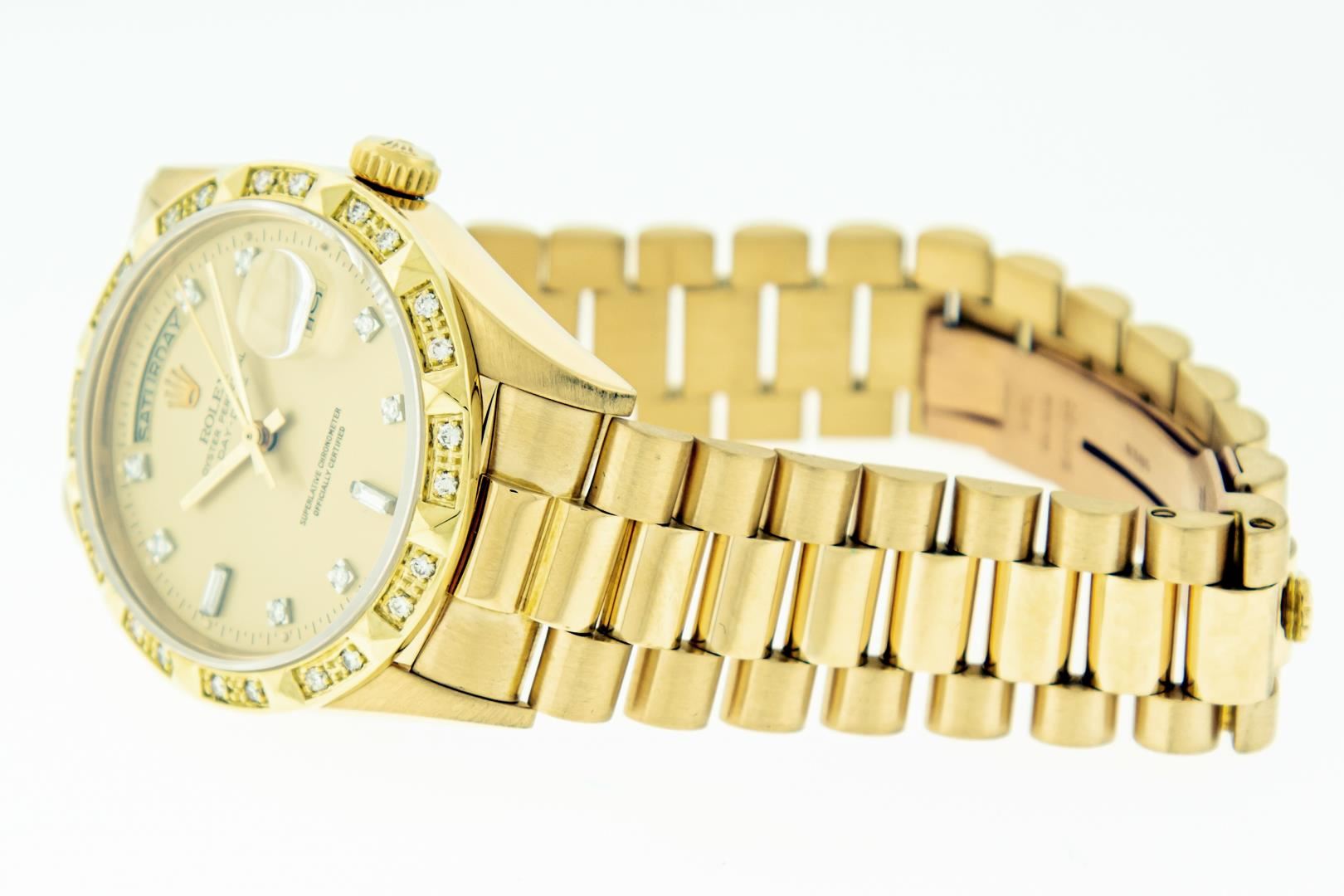 One Mens Pre Owned Rolex Day Date 18K Yellow Gold President Polished, Serviced & Electronically Tested, Rolex 18K Yellow Gold Case: 36mm, Rolex 18K Yellow Gold Crown, Custom Bezel: New 18K Yellow Gold Pyramid Beadset Diamond Bezel, Diamond Count: 24 Diamonds On Bezel. Clarity: SI-VS, Color: G to H. Custom Crystal: New Sapphire With Magnified Date Window. Custom Hands: New Luminescent Hands. Rolex Movement: Automatic Winding Movement Caliber 3055. Rolex Dial: Factory Champagne Diamond Dial, Diamond Count: 8 Diamonds + 2 Baguettes, Clarity: VS. Date Window: 3 O'Clock Position Date Display, Day Window: 12 O'Clock Position Date Display. Quickset, Model: Day Date President. Condition: G-6 Extra Fine. Rolex Bracelet: New 18K Yellow Gold President Band. Bright Polish. 7.0 Inch Length, Standard Hidden President Clasp President Band, With Rolex Logo. This Watch Has Been Serviced And Polished It Is Free Of All Scratches And Dents.