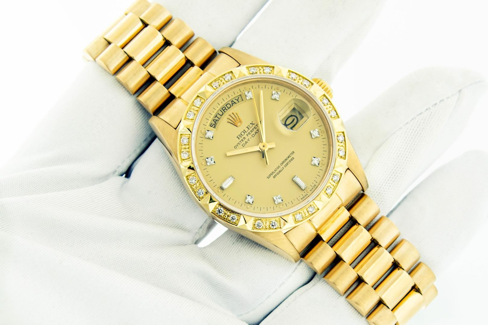 One Mens Pre Owned Rolex Day Date 18K Yellow Gold President Polished, Serviced & Electronically Tested, Rolex 18K Yellow Gold Case: 36mm, Rolex 18K Yellow Gold Crown, Custom Bezel: New 18K Yellow Gold Pyramid Beadset Diamond Bezel, Diamond Count: 24 Diamonds On Bezel. Clarity: SI-VS, Color: G to H. Custom Crystal: New Sapphire With Magnified Date Window. Custom Hands: New Luminescent Hands. Rolex Movement: Automatic Winding Movement Caliber 3055. Rolex Dial: Factory Champagne Diamond Dial, Diamond Count: 8 Diamonds + 2 Baguettes, Clarity: VS. Date Window: 3 O'Clock Position Date Display, Day Window: 12 O'Clock Position Date Display. Quickset, Model: Day Date President. Condition: G-6 Extra Fine. Rolex Bracelet: New 18K Yellow Gold President Band. Bright Polish. 7.0 Inch Length, Standard Hidden President Clasp President Band, With Rolex Logo. This Watch Has Been Serviced And Polished It Is Free Of All Scratches And Dents.