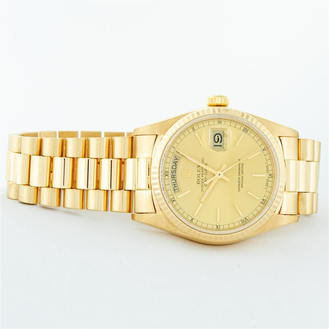 One Mens Quickset Rolex Day Date 18K Yellow Gold President Polished, Serviced & Electronically Tested, Rolex 18K Yellow Gold Case: 36mm, Rolex 18K Yellow Gold Crown, Rolex Bezel: 18K Yellow Gold Fluted Bezel. Crystal: Sapphire With Magnified Date Window. Hands: Luminescent Hands. Rolex Movement: Automatic Quickset Winding Movement Caliber 3055. Rolex Dial: Champagne Index With Roman Track & Lumi Dots. Date Window: 3 O'Clock Position, Day Display: 12 O'Clock Position, Single Quickset, Model: Day Date Quickset President. Condition: G-6 Extra Fine. Rolex Bracelet: 18K Yellow Gold President Band With Hidden Clasp, Bright & Satin Polish. 7.0 Inch Length, Standard Hidden President Clasp, With Rolex Logo. This Pre Owned Watch Has Been Serviced Time Tested And Is In Excellent Condition It Is Free Of All Scratches And Dents.