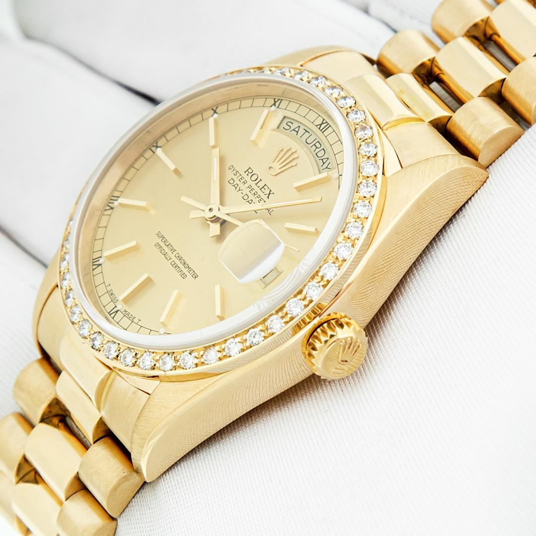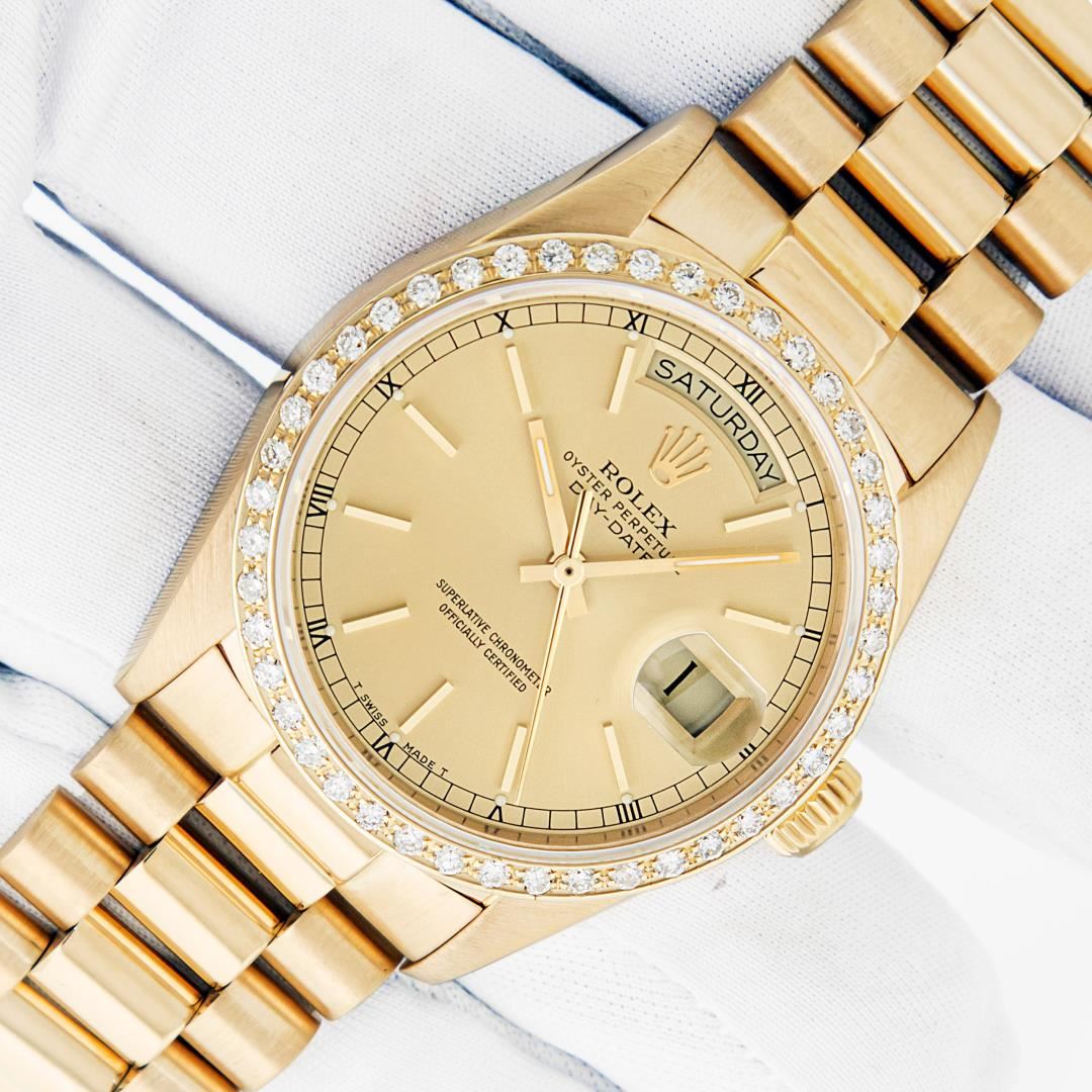 One Mens Pre Owned Quickset Rolex Day Date 18K Yellow Gold President Polished, Serviced & Electronically Tested, Rolex 18K Yellow Gold Case: 36mm, Rolex 18K Yellow Gold Crown, Custom Bezel: New 18K Yellow Gold Beadset Diamond Bezel, Diamond Count: 44 Diamonds On Bezel. Custom Crystal: New Sapphire With Magnified Date Window. Rolex Movement: Automatic Quickset Winding Movement Caliber 3055. Rolex Dial: Champagne Index With Roman Track & Lumi Dots. Custom Hands: New Hands. Date Window: 3 O'Clock Position, Day Display: 12 O'Clock Position, Single Quickset, Model: Day Date President. Condition: G-6 Extra Fine. Rolex Bracelet: 18K Yellow Gold President Band With Hidden Clasp, Bright & Satin Polish. 7.0 Inch Length, Standard President Clasp, With Rolex Logo. This Watch Has Been Serviced And Polished It Is Free Of All Scratches And Dents.
