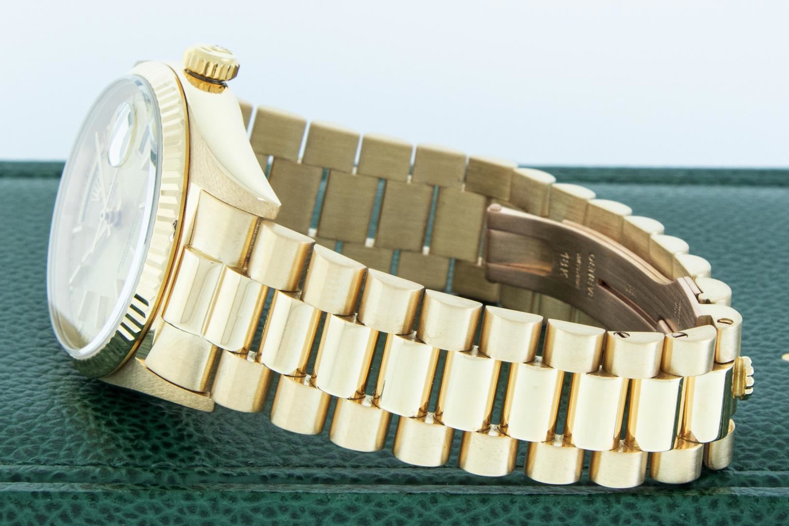 One Mens Quickset Pre Owned Rolex Day Date 18K Yellow Gold President Polished, Serviced & Electronically Tested, Rolex 18K Yellow Gold Case: 36mm, Rolex 18K Yellow Gold Crown, Rolex Bezel: 18K Yellow Gold Fluted Bezel. Crystal: Sapphire With Magnified Date Window. Rolex Movement: Automatic Quickset Winding Movement Caliber 3055. Rolex Dial: Champagne Index With Roman Track & Lumi Dots. Date Window: 3 O'Clock Position, Day Display: 12 O'Clock Position, Single Quickset, Model: Day Date President. Condition: G-6 Extra Fine. Rolex Bracelet: 18K Yellow Gold President Band With Hidden Clasp, Bright & Satin Polish. 7.0 Inch Length, Standard President Clasp, With Rolex Logo. This Watch Has Been Serviced And Polished It Is Free Of All Scratches And Dents. This Watch Comes With A Rolex Box.