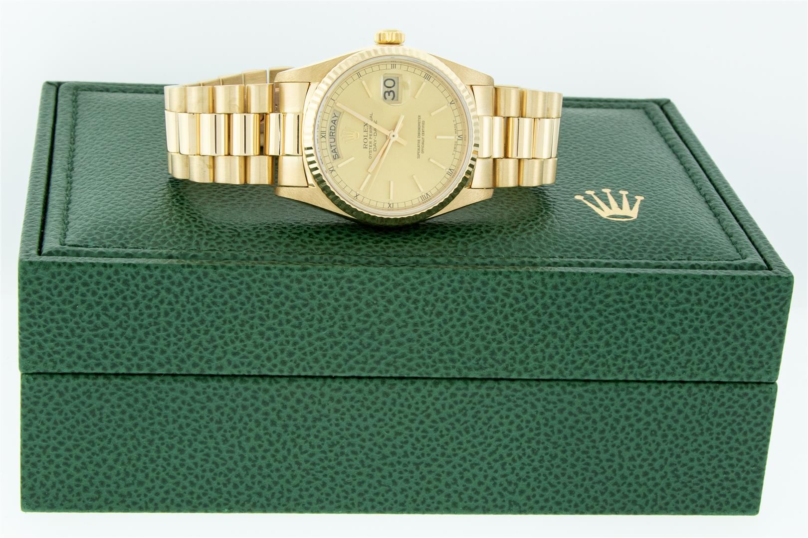 One Mens Quickset Pre Owned Rolex Day Date 18K Yellow Gold President Polished, Serviced & Electronically Tested, Rolex 18K Yellow Gold Case: 36mm, Rolex 18K Yellow Gold Crown, Rolex Bezel: 18K Yellow Gold Fluted Bezel. Crystal: Sapphire With Magnified Date Window. Rolex Movement: Automatic Quickset Winding Movement Caliber 3055. Rolex Dial: Champagne Index With Roman Track & Lumi Dots. Date Window: 3 O'Clock Position, Day Display: 12 O'Clock Position, Single Quickset, Model: Day Date President. Condition: G-6 Extra Fine. Rolex Bracelet: 18K Yellow Gold President Band With Hidden Clasp, Bright & Satin Polish. 7.0 Inch Length, Standard President Clasp, With Rolex Logo. This Watch Has Been Serviced And Polished It Is Free Of All Scratches And Dents. This Watch Comes With A Rolex Box.