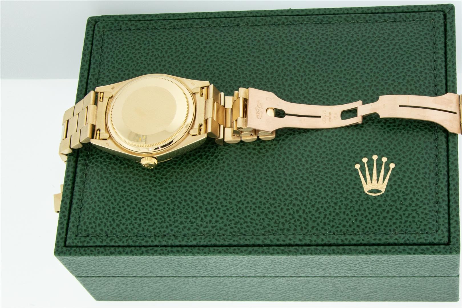 One Mens Quickset Pre Owned Rolex Day Date 18K Yellow Gold President Polished, Serviced & Electronically Tested, Rolex 18K Yellow Gold Case: 36mm, Rolex 18K Yellow Gold Crown, Rolex Bezel: 18K Yellow Gold Fluted Bezel. Crystal: Sapphire With Magnified Date Window. Rolex Movement: Automatic Quickset Winding Movement Caliber 3055. Rolex Dial: Champagne Index With Roman Track & Lumi Dots. Date Window: 3 O'Clock Position, Day Display: 12 O'Clock Position, Single Quickset, Model: Day Date President. Condition: G-6 Extra Fine. Rolex Bracelet: 18K Yellow Gold President Band With Hidden Clasp, Bright & Satin Polish. 7.0 Inch Length, Standard President Clasp, With Rolex Logo. This Watch Has Been Serviced And Polished It Is Free Of All Scratches And Dents. This Watch Comes With A Rolex Box.
